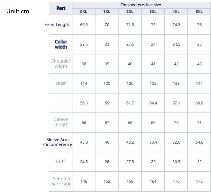 • 0XL, 1XL, 2XL, 3XL, 4XL, 5XL