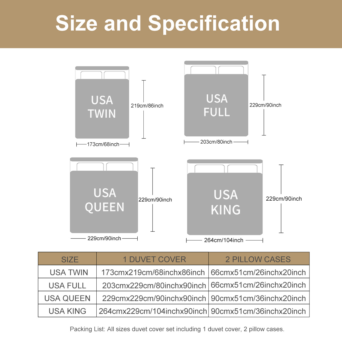 • 1.ATTENTION: Twin set come with one duvet cover 68″ by 86″ and two standard pillow shams 20″ by 26″; Queen set come with one duvet cover 90″ by 90″ and two standard pillow shams 20″ by 36″. DOES NOT include any inside fillers and accessories.