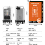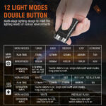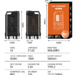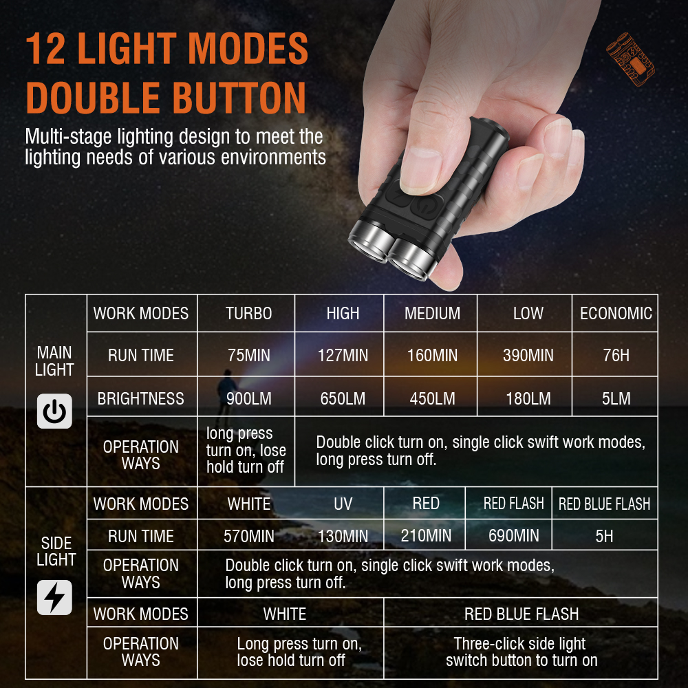 • Main Light: Extremely Bright (Long press the main light switch button to turn on, release to turn off) 900LM – Double-click the main light switch button to turn on, single-click to switch: High Brightness 650lm – Medium Brightness 450lm – Low Brightness 180lm – Energy Saving 5lm -Long press to turn off