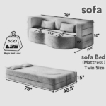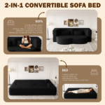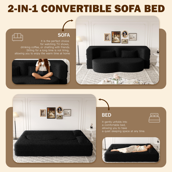 Modern Floor Sofa With 2 Pillows,Convertible Teddy Fabric Foam-Filled Sleeper Sofa Bed,15′ Twin Size Folding Mattress For Living Room,Guest Bed,Playroom,no Assembly Required,Black