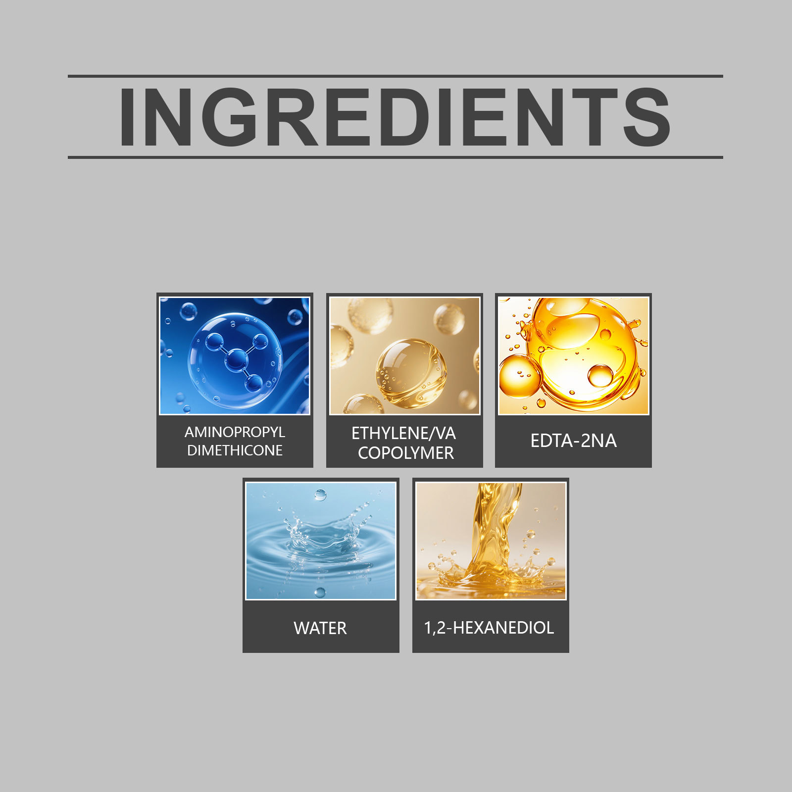 - Water, modified amino silicone oil polymer, ethylene copolymer, 1,2- hexanediol, EDTA-2Na.