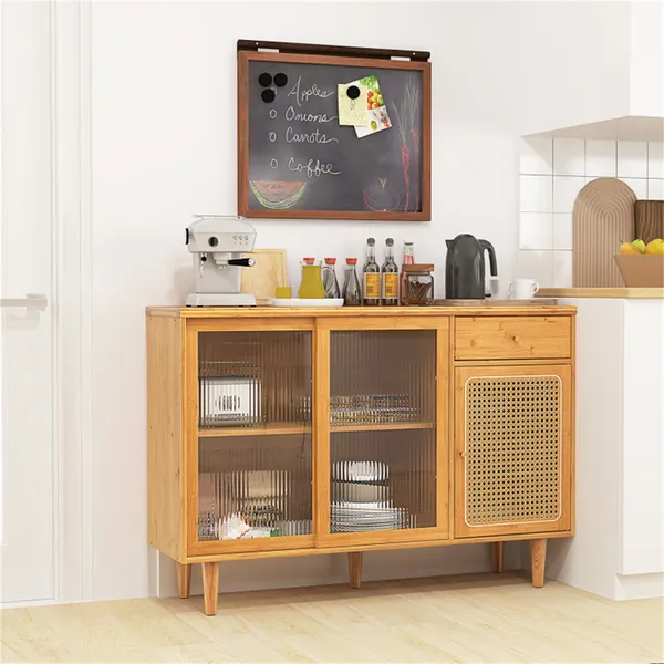 Natural Bamboo Sideboard Cabinet With Rattan Door, Sliding Door & Pull-Out Drawer, 5-Leg Rubber Wood Base