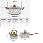 • 【See-through lids】 the stainless steel pan set is equipped with tempered glass lids and steam vent that allow steam to escape for viewing food while cooking;   the cooking set with comfortable and stay cool wood texture handle, makes them unique and retro style.