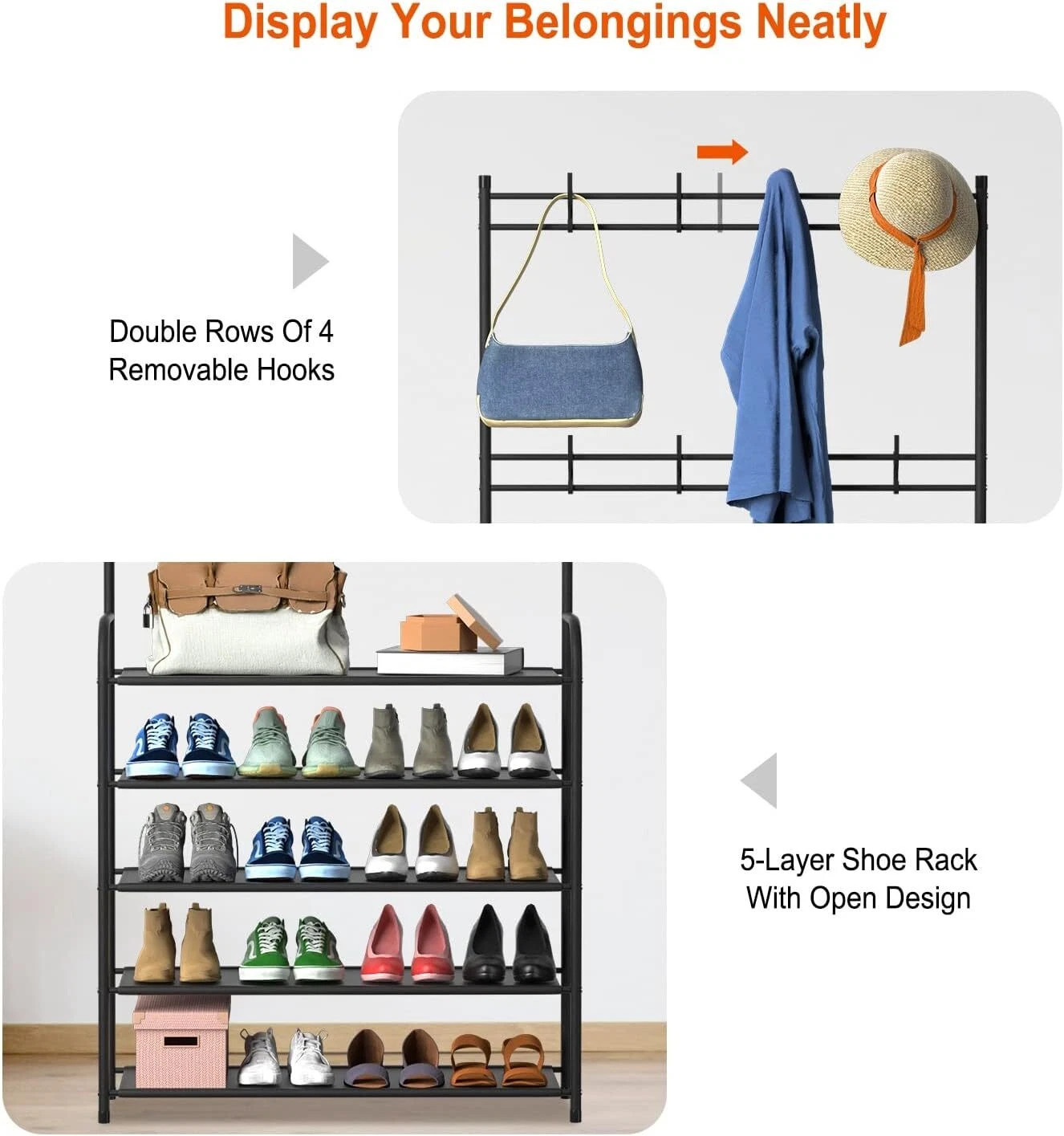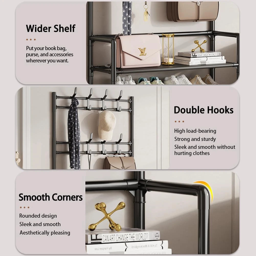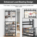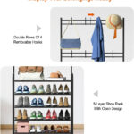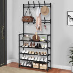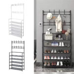 New Coat And Hat Stand 8 Hooks Metal Shoe Rack 5 Tiers Shelf Hanger Black