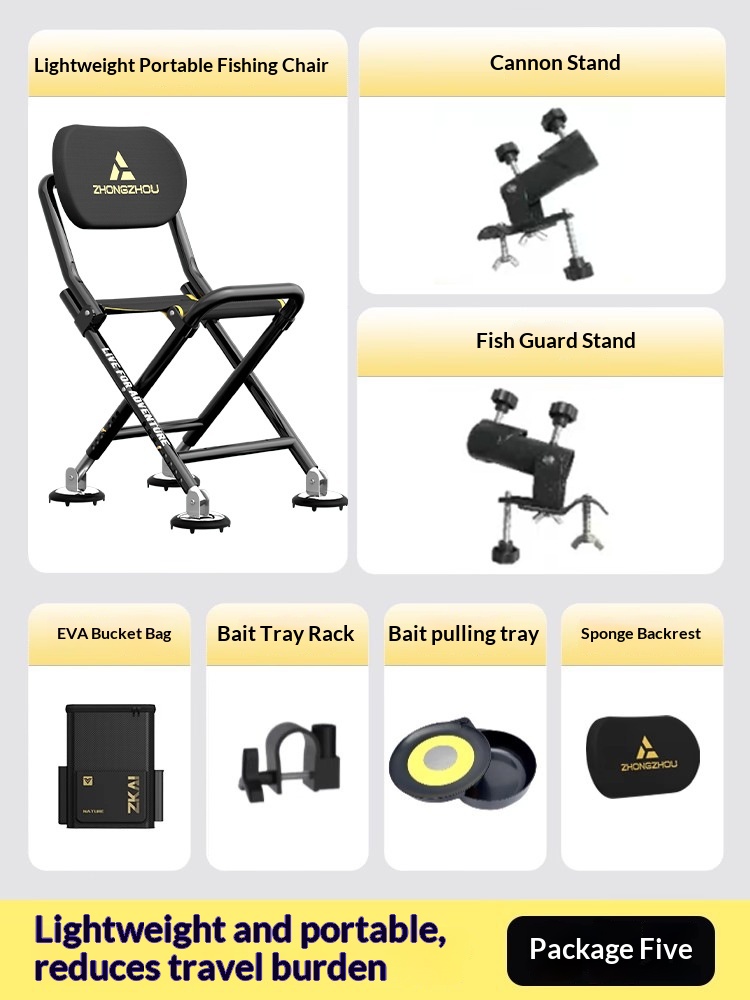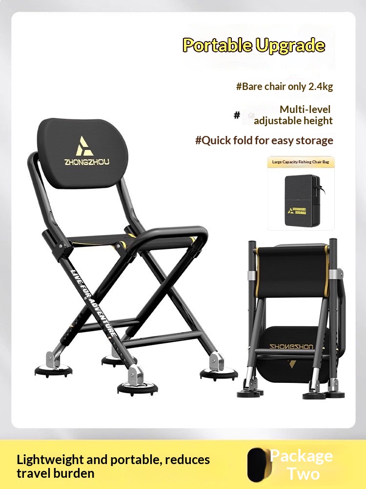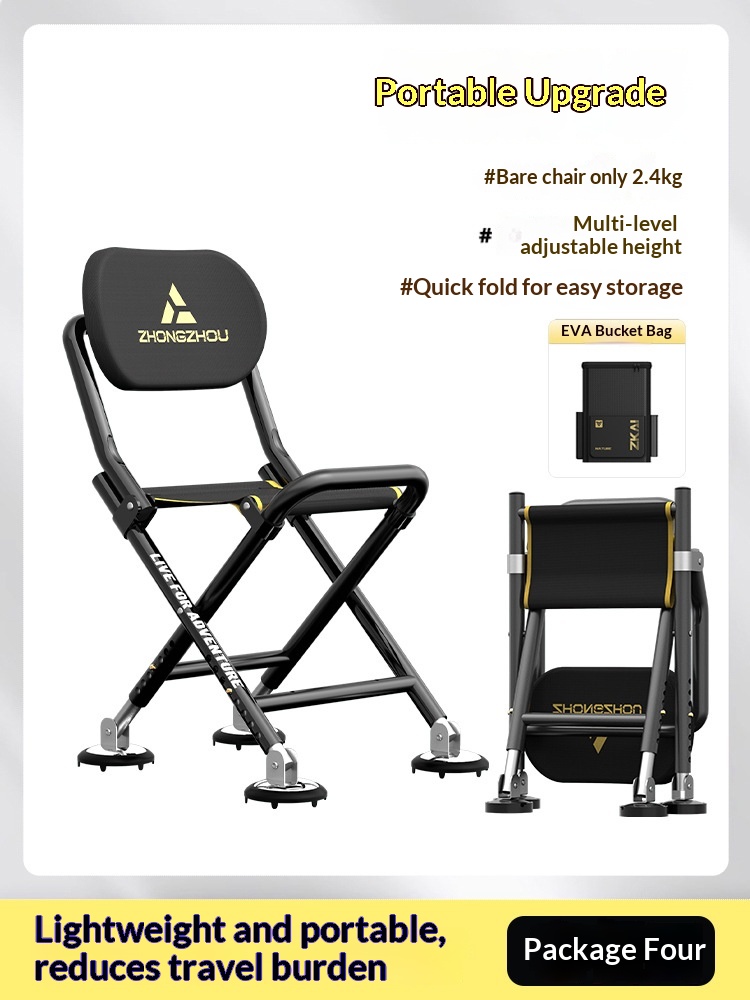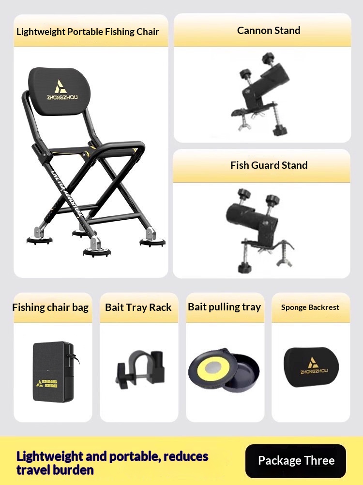 Fishing Chair • Package 1: [Portable Black and Gold Chair] Bare chair + black and gold fishing chair bag, • Package 2: [Portable Black and Gold Chair] Bare chair + black and gold fishing chair bag + rod rest stand + fish keeper rack + black and gold bait mixing tray,