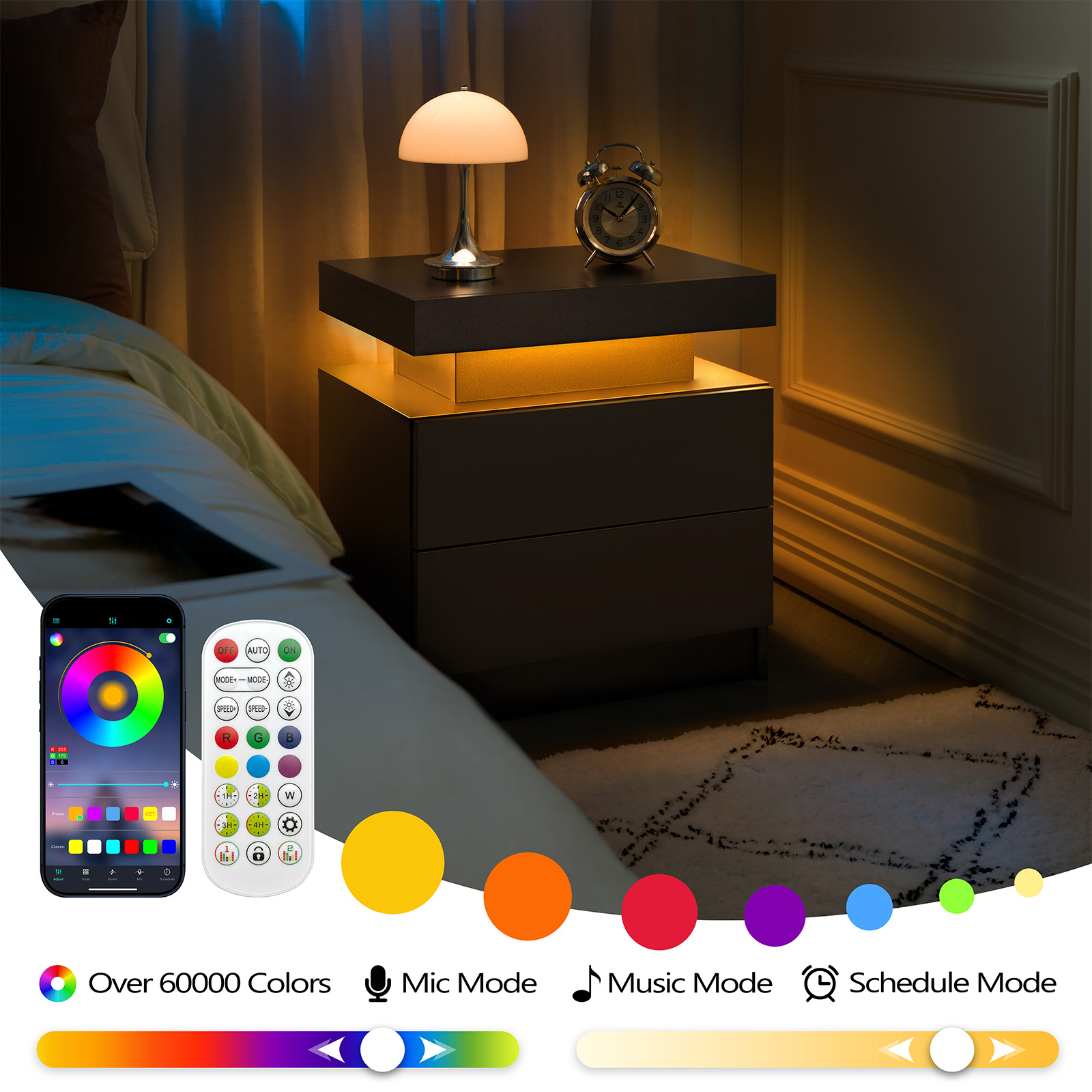 Nightstand LED Bedside Table Cabinet Lights Modern End Side With 2 Drawers For Bedroom Black