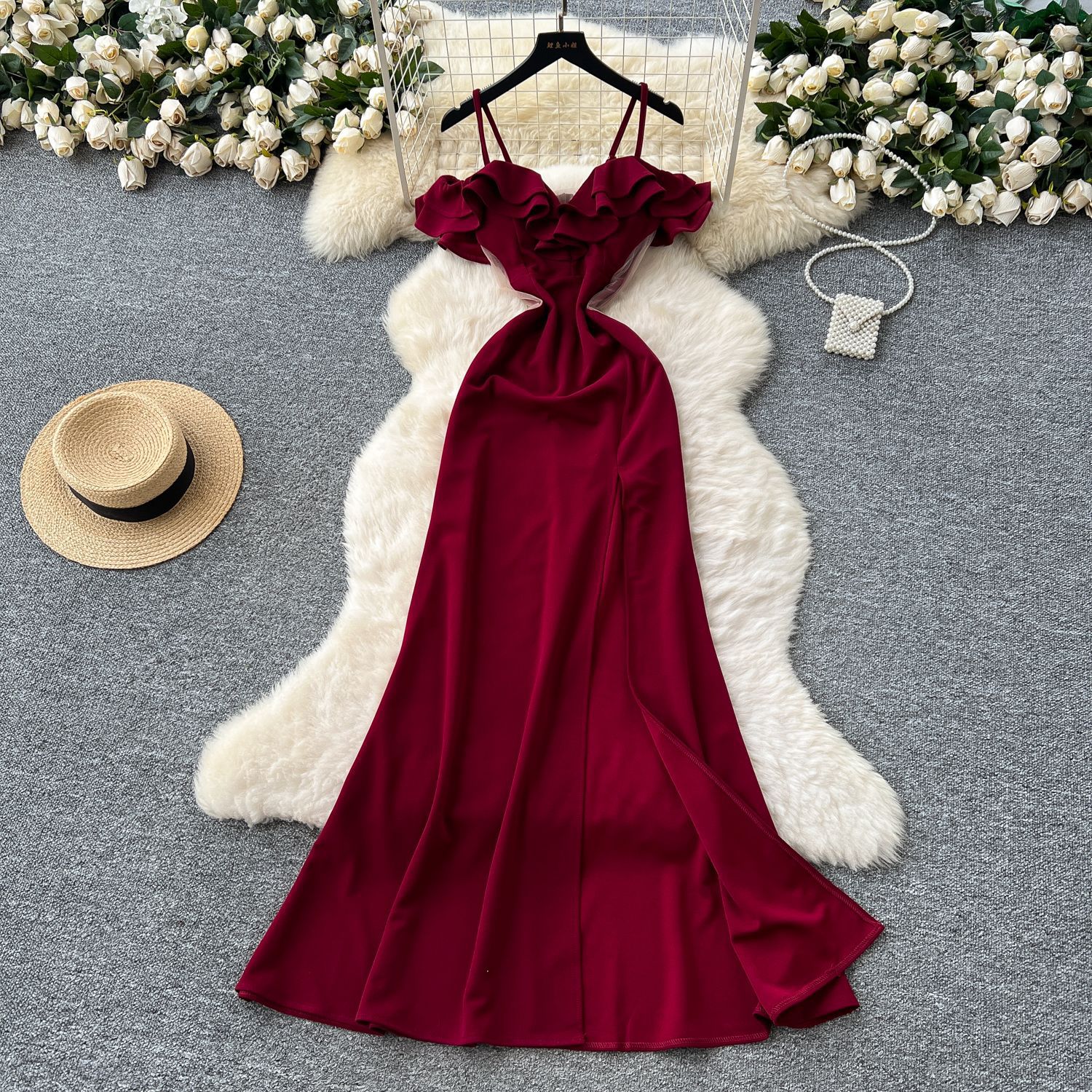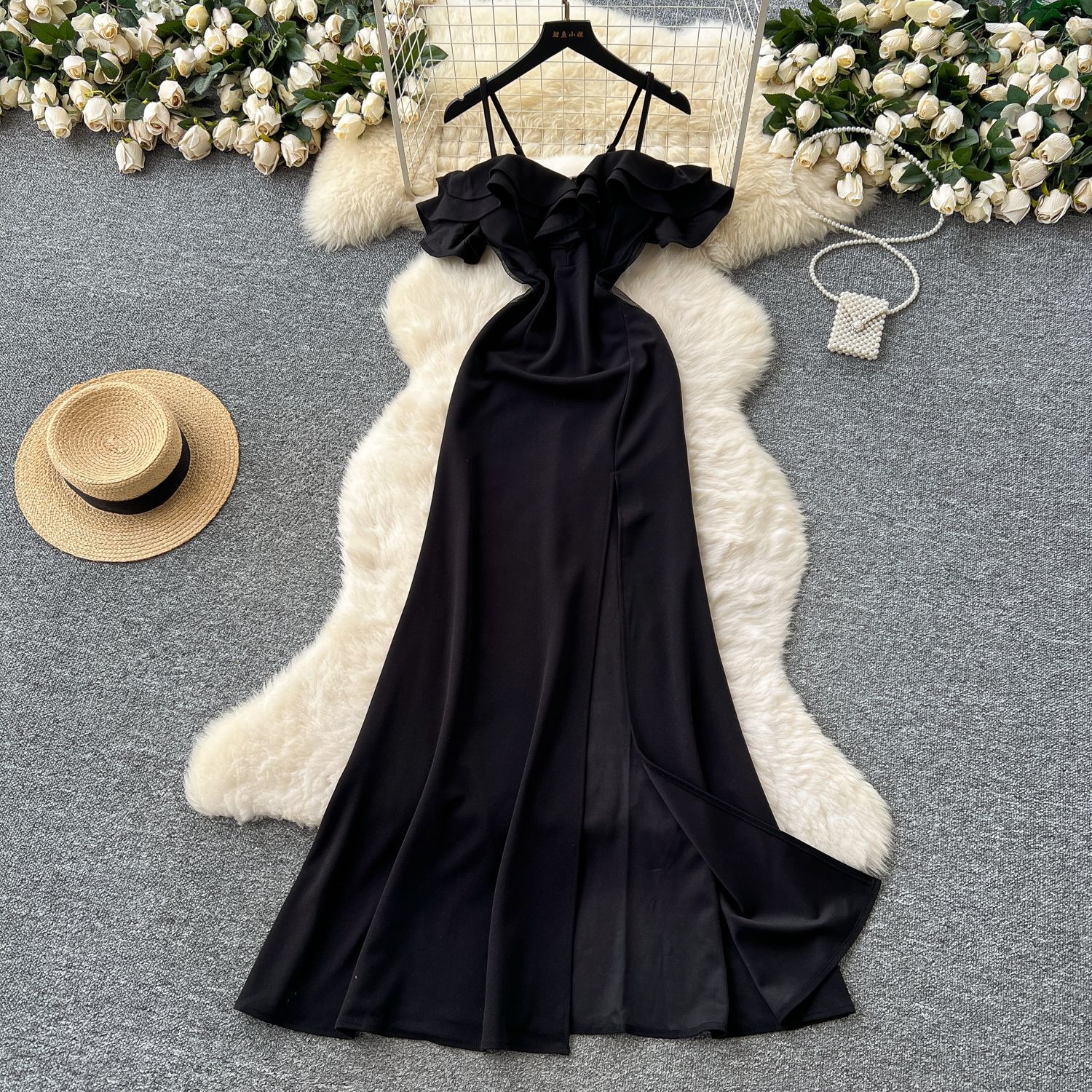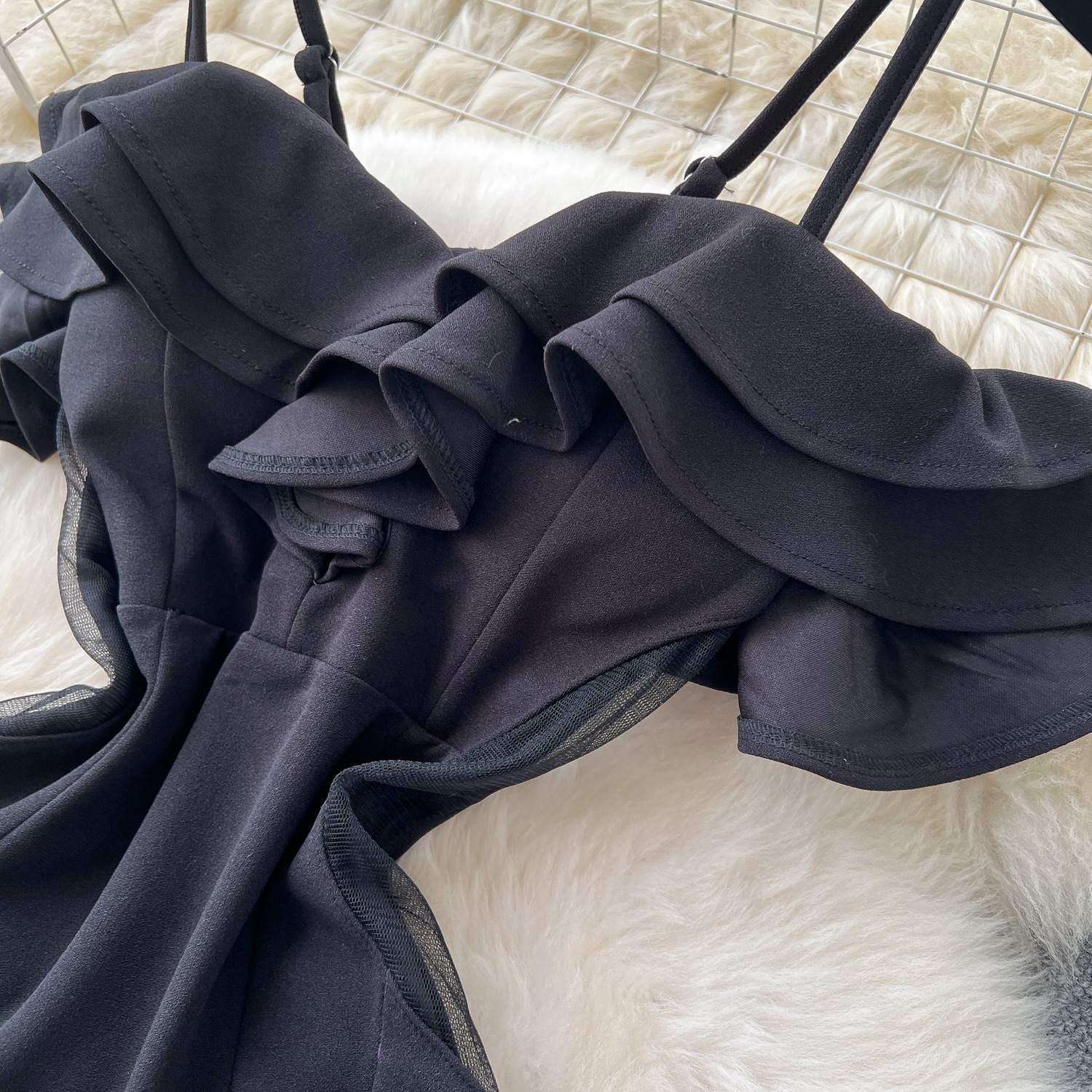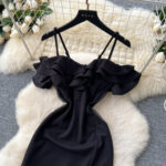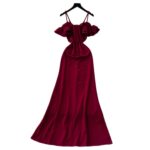 Off-the-shoulder Strap Mesh Patchwork Waist-cinched Slit Dress
