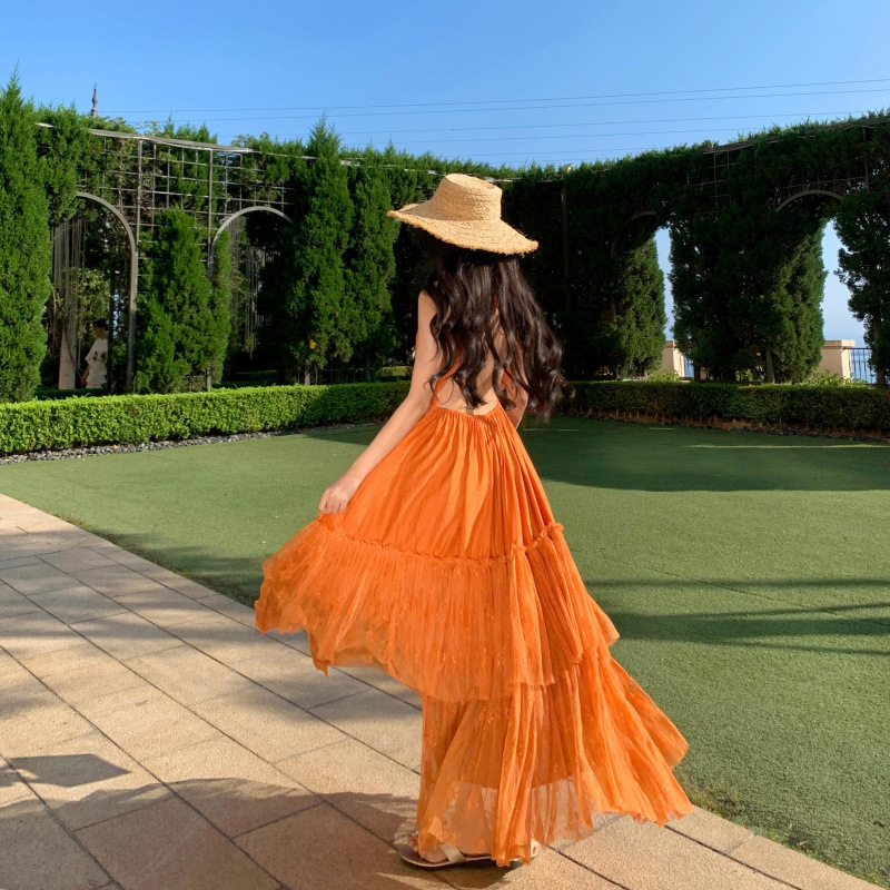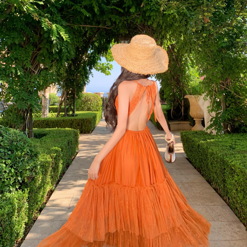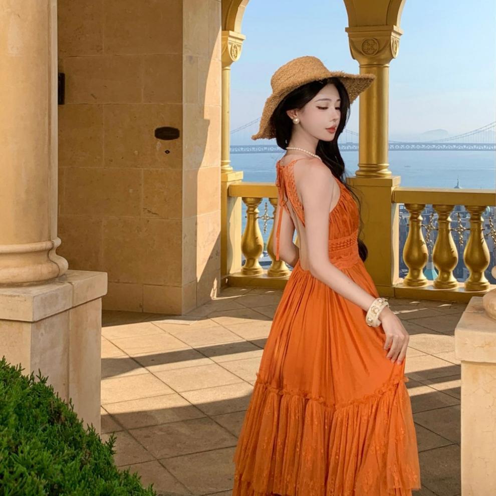 Orange Lace Panel Sexy Backless Dress