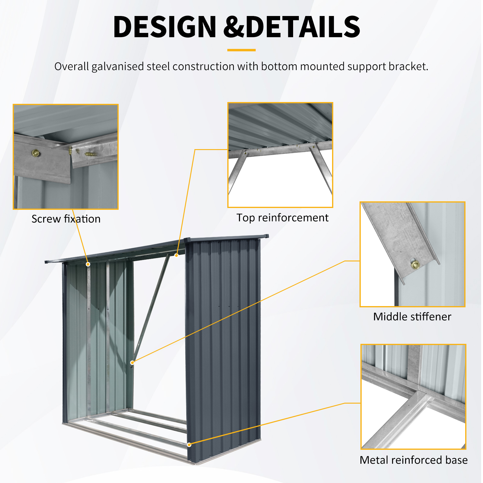 SpecificationProduct Information Product Type :Single Box ProductProduct Name:Outdoor Steel Firewood Rack,Open Wood Shed with Sloped Roof for Firewood,Pellet,or Lumber Storage,BlackMain Color:BlackMain Material:MetalProduct DimensionsAssembled Length (in.):85.50Assembled Width (in.):35.25Assembled Height (in.):60.75Product Weight (lbs.):42.77Package SizeLength (in.):61.81Width (in.):20.08Height (in.):3.54Weight (lbs.):51.81