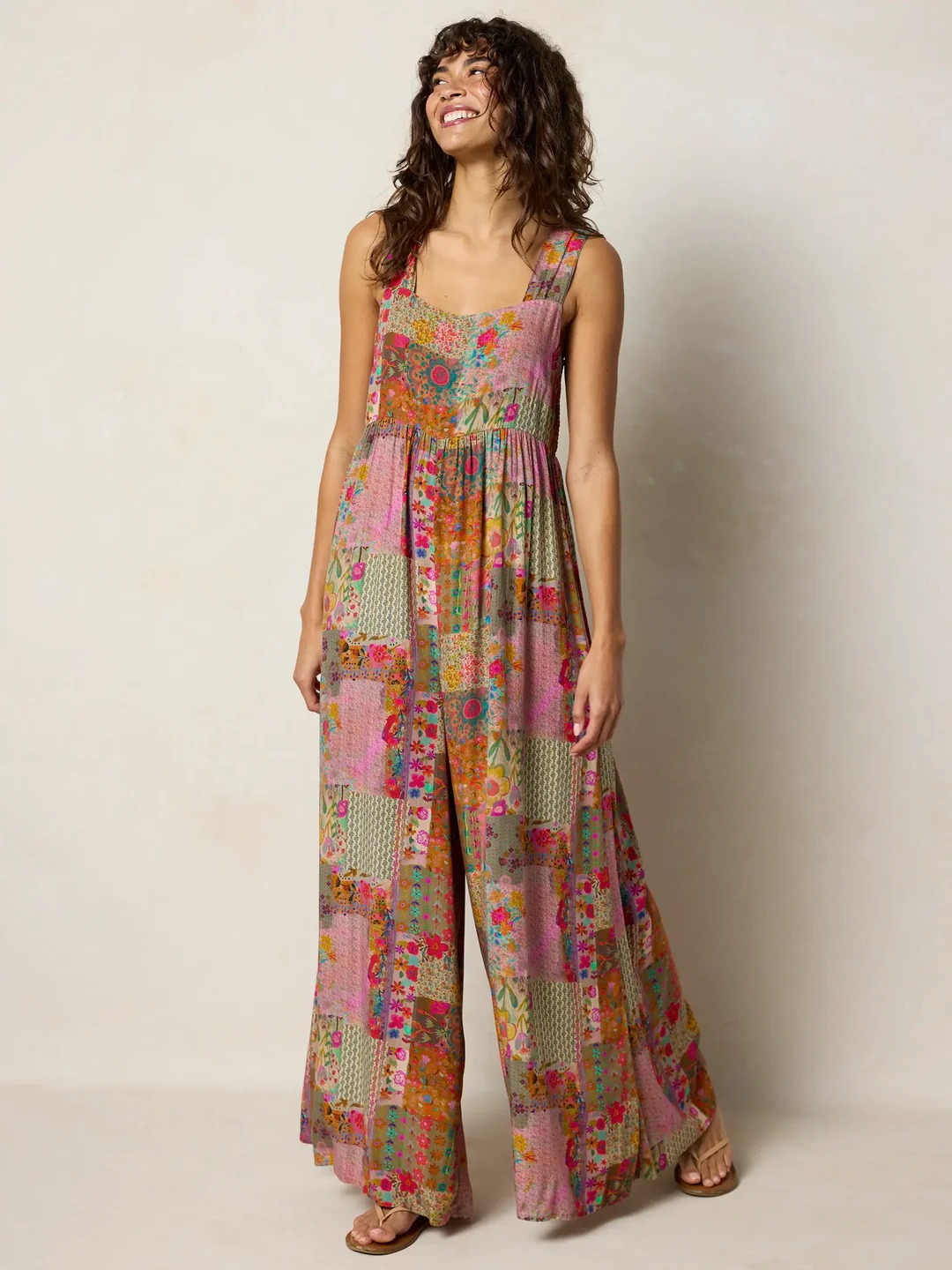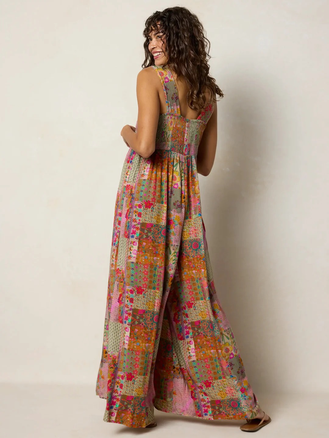 Patchwork Retro Suspender Wide-Leg Stretch Casual Jumpsuit
