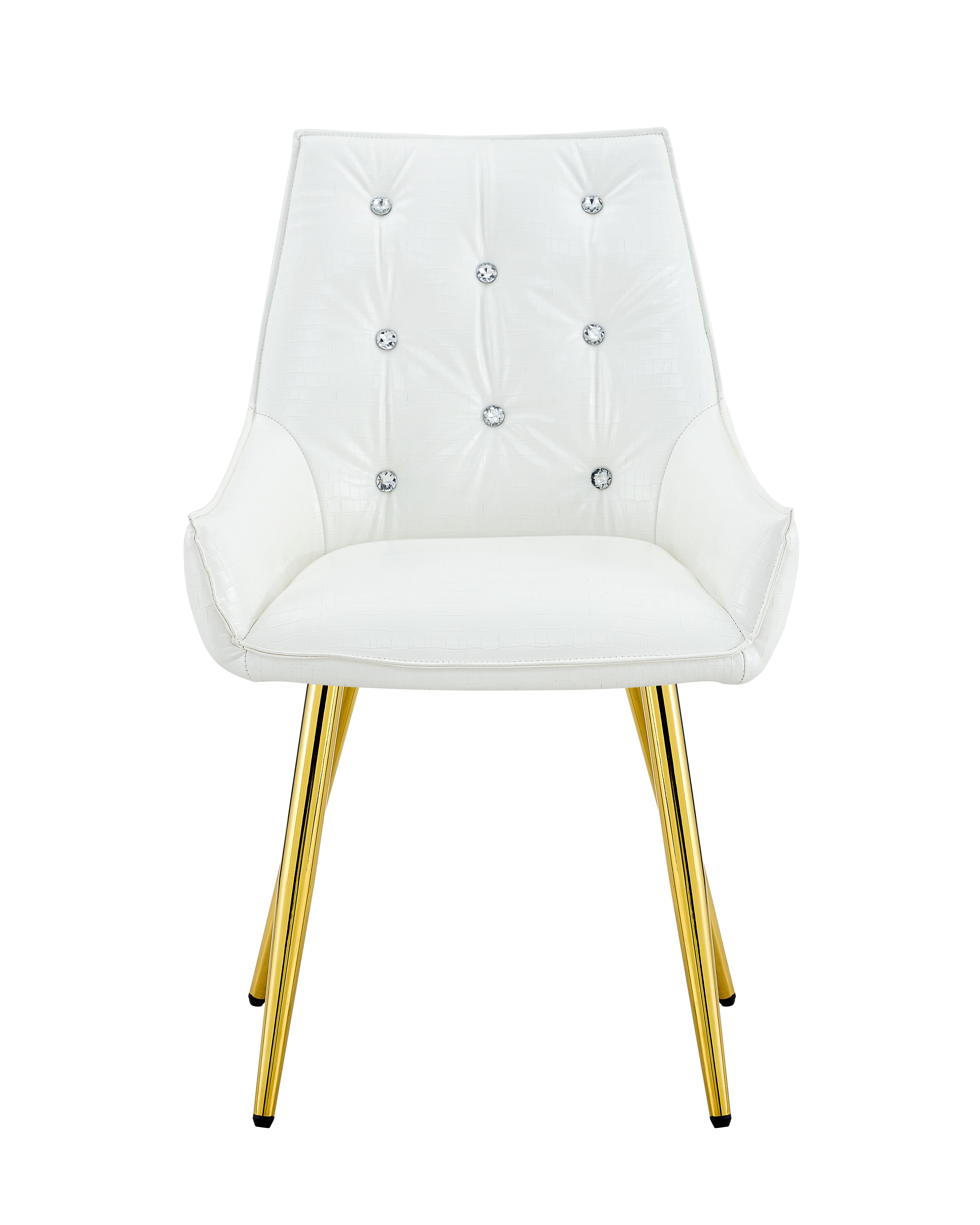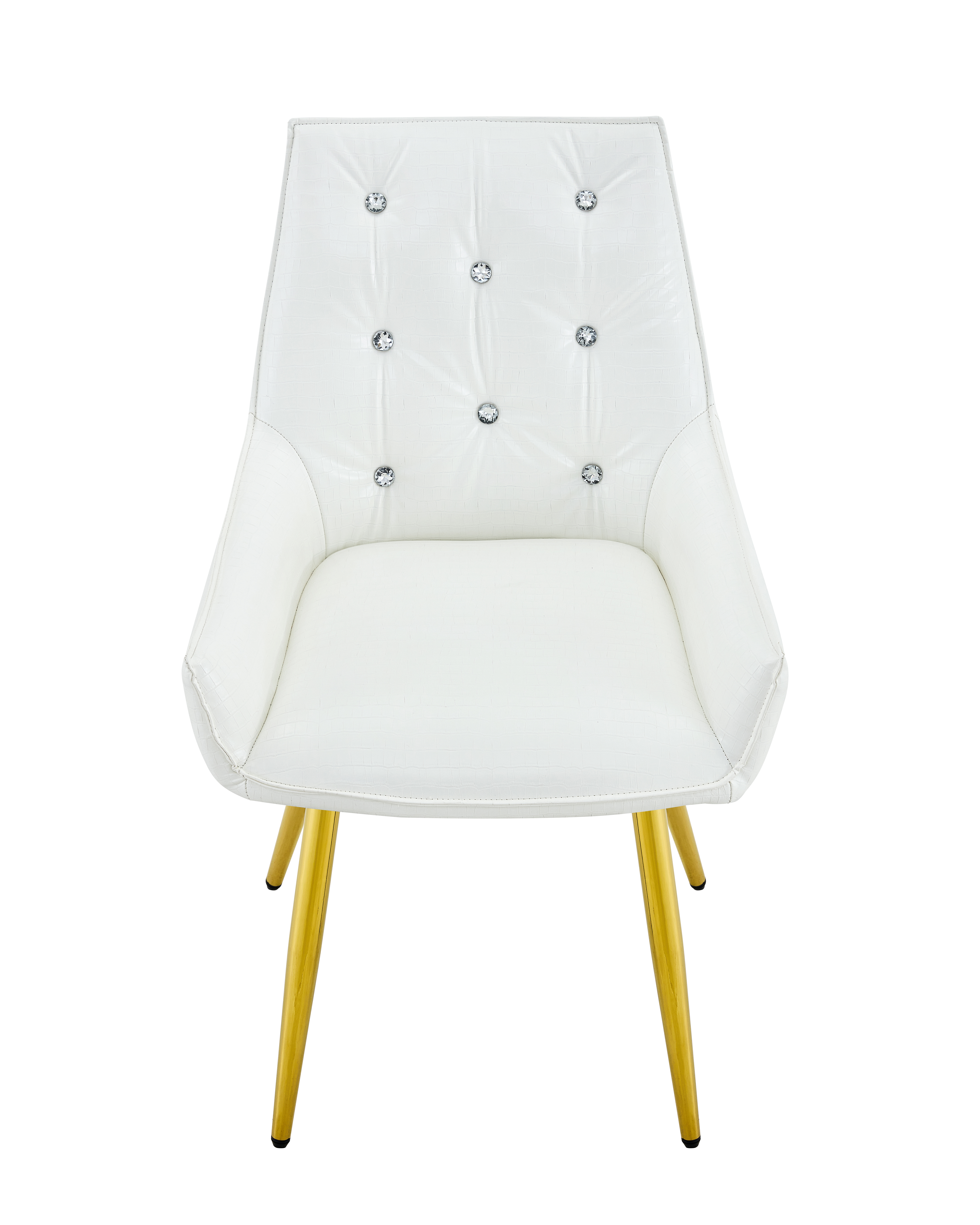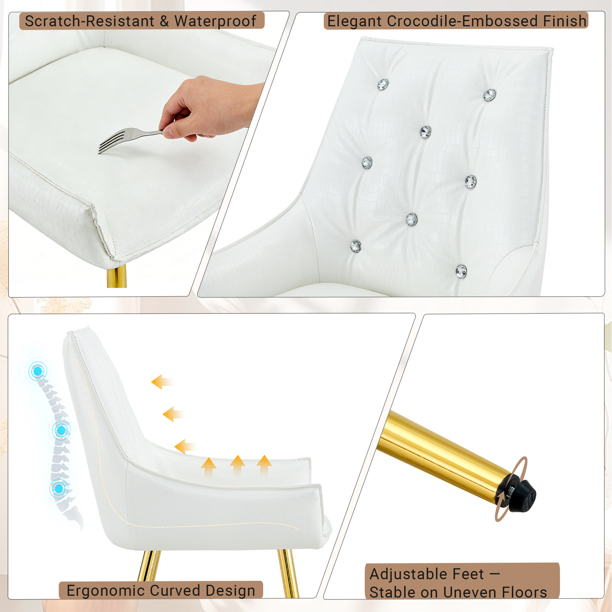 - Single Box ProductProduct Name:Crocodile Pattern Premium PU Leather Accent Chair, Diamond Decor Backrest, Chrome Golden Metal Legs & High-Resilience Sponge Cushion – Versatile for Office, Dining Room & Living Room (White, Set of 2)Place of Origin:ChinaMain Color:WhiteMain Material:PU LeatherFiller:Fiber Foam PadsProduct Style:ModernUse Case:Dining RoomChair Type:Dining ChairsChair Back Style:Solid BackChair Upholstery Material:MetalChair Shape:SquareChair Fill Material:FoamChair Care Instructions:Wipe CleanSeating Quantity:Set of 2Product DimensionsAssembled Length (in.):23.62Assembled Width (in.):21.26Assembled Height (in.):33.46Product Weight (lbs.):15.43Package SizeLength (in.):25.79Width (in.):20.87Height (in.):22.05Weight (lbs.):35.71Product Features【Exquisite Luxury & High-End Design】Elevate your home with a touch of opulence. This chair features premium crocodile-patterned leather upholstery paired with a sophisticated diamond-tufted backrest adorned with sparkling diamond-like buttons. The sleek electroplated metal legs provide a brilliant metallic luster, creating a stunning visual centerpiece that exudes modern luxury and prestige.【Durable & Easy-to-Clean Upholstery】 Engineered for both beauty and longevity, our high-quality crocodile leather is exceptionally scratch-resistant and wear-resistant. The surface is also waterproof and stain-resistant, making it remarkably easy to maintain. Whether it’s a spill or daily dust, a simple wipe with a damp cloth restores its pristine, high-end look instantly.【Spring Pack Comfort & Anti-Deformation】 Experience unparalleled comfort with our advanced seating technology. The seat cushion is filled with high-elastic sponge and integrated spring packs (pocket springs), similar to high-end mattresses. This combination provides superior rebound and ergonomic support, ensuring the cushion remains plush and resists deformation even after years of prolonged use.【Adjustable Leveling Feet & Floor Protection】 Stability is guaranteed on any surface. Each leg is equipped with an adjustable leveling pad, allowing you to find the perfect balance even on slightly uneven floors. These non-slip pads also act as a protective barrier, safeguarding your expensive hardwood, tile, or laminate floors from scratches, scuffs, and noise.【Versatile Statement Piece for Any Room】 With its unique texture and glamorous accents, this chair is more than just seating—it’s a piece of art. Perfect as a sophisticated dining chair, a chic vanity seat, or a professional accent chair for your office. Its heavy-duty construction ensures a high weight capacity while maintaining its elegant, high-fashion silhouette.DescriptionsLuxury Crocodile Pattern Dining Chair with Diamond AccentsTransform your space into a sanctuary of style and comfort; our luxury accent chair is meticulously designed for those who demand the finest in home decor, featuring premium crocodile-patterned leather and a diamond-tufted backrest with sparkling buttons that exude high-end glamour, while the electroplated legs add a modern, polished finish that catches the light beautifully. The seat is engineered with high-elastic sponge and integrated spring packs, providing mattress-like support that won’t sag or deform over time, and the durable upholstery is scratch-resistant, waterproof, and stain-resistant for effortless maintenance and long-term beauty. It also includes adjustable leveling feet to ensure stability on any floor while preventing scratches, making it perfect for dining rooms, vanities, or creative offices—luxury you can feel!