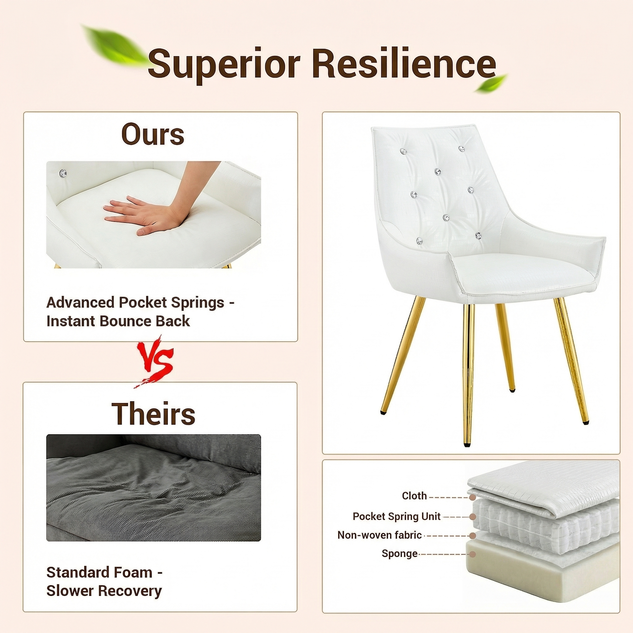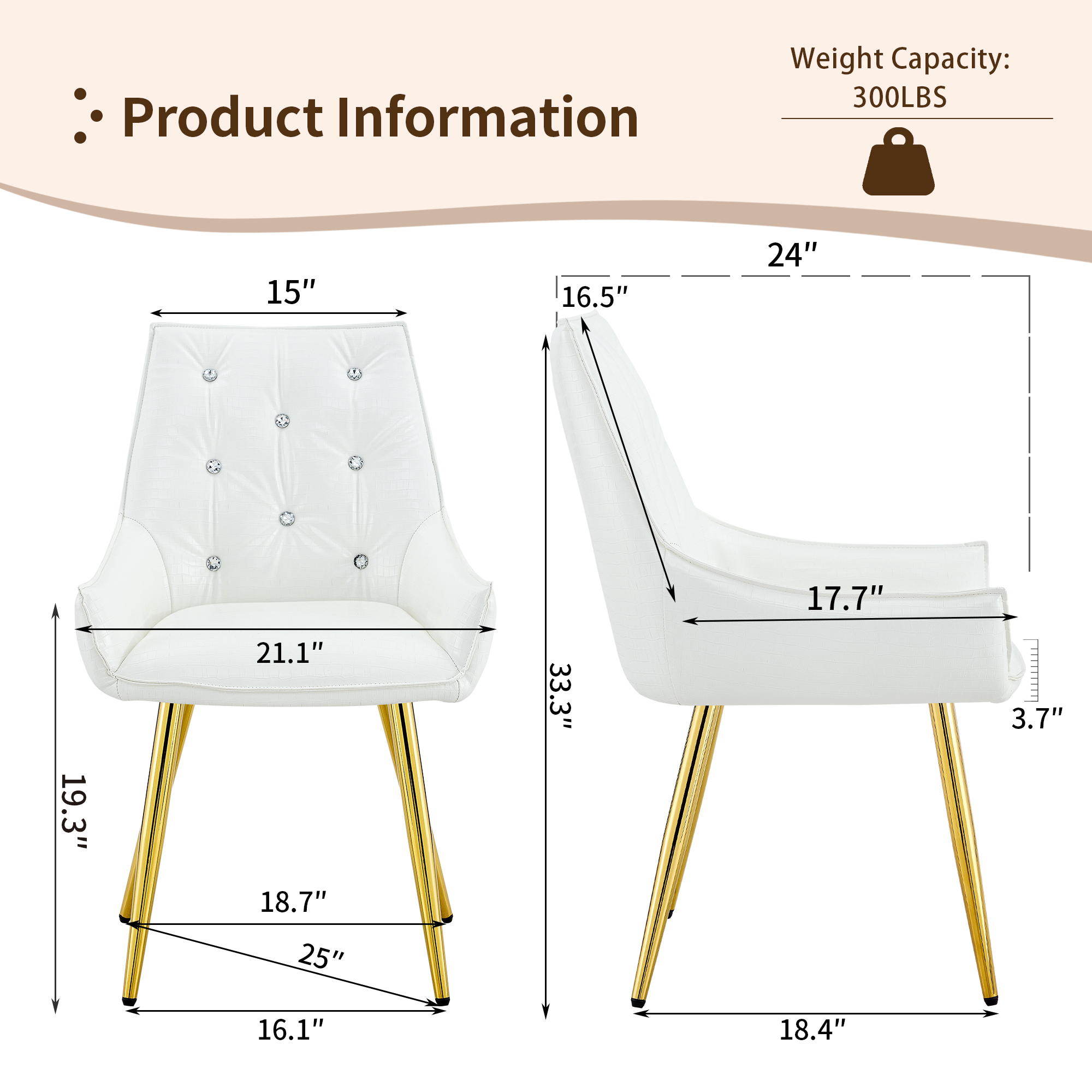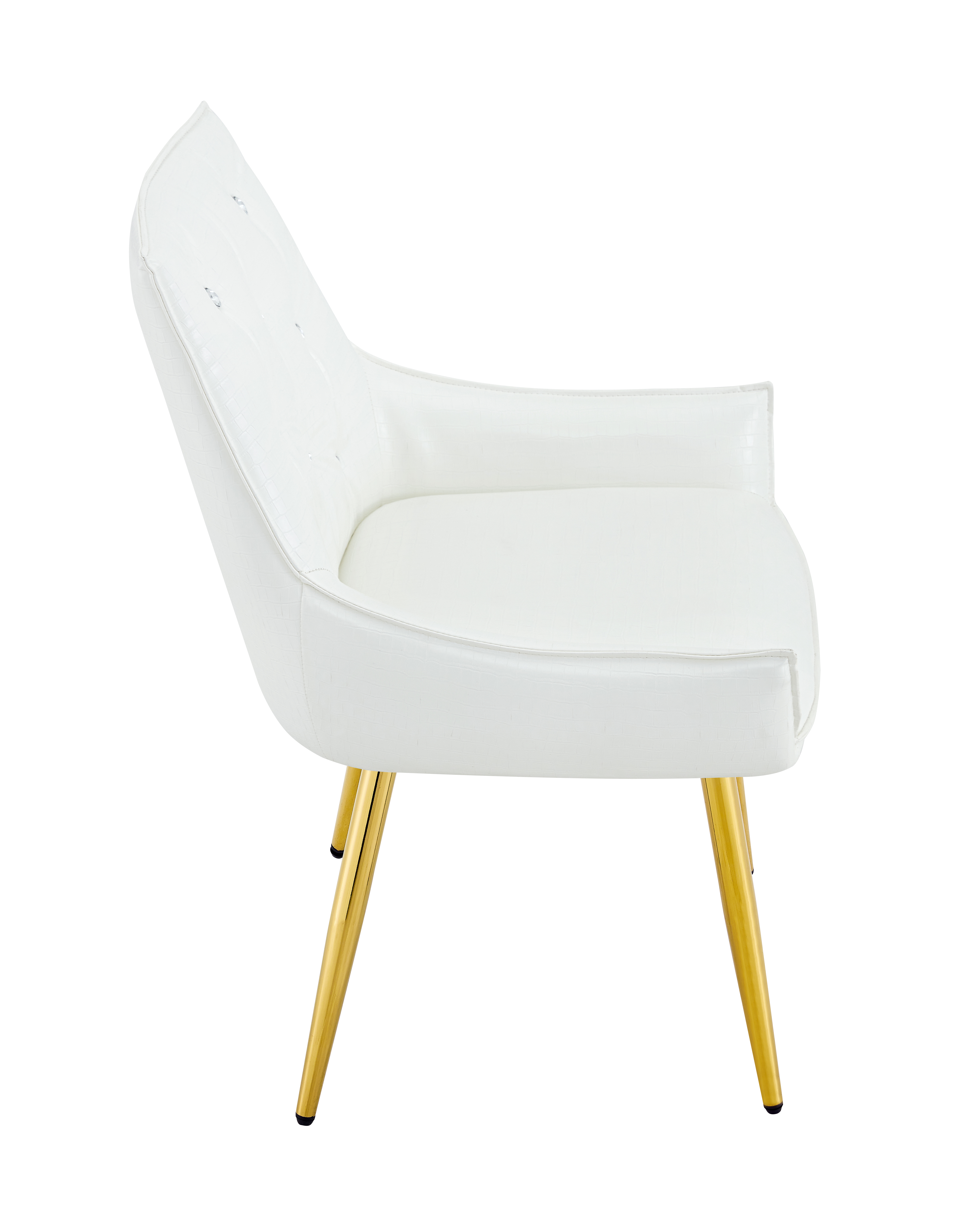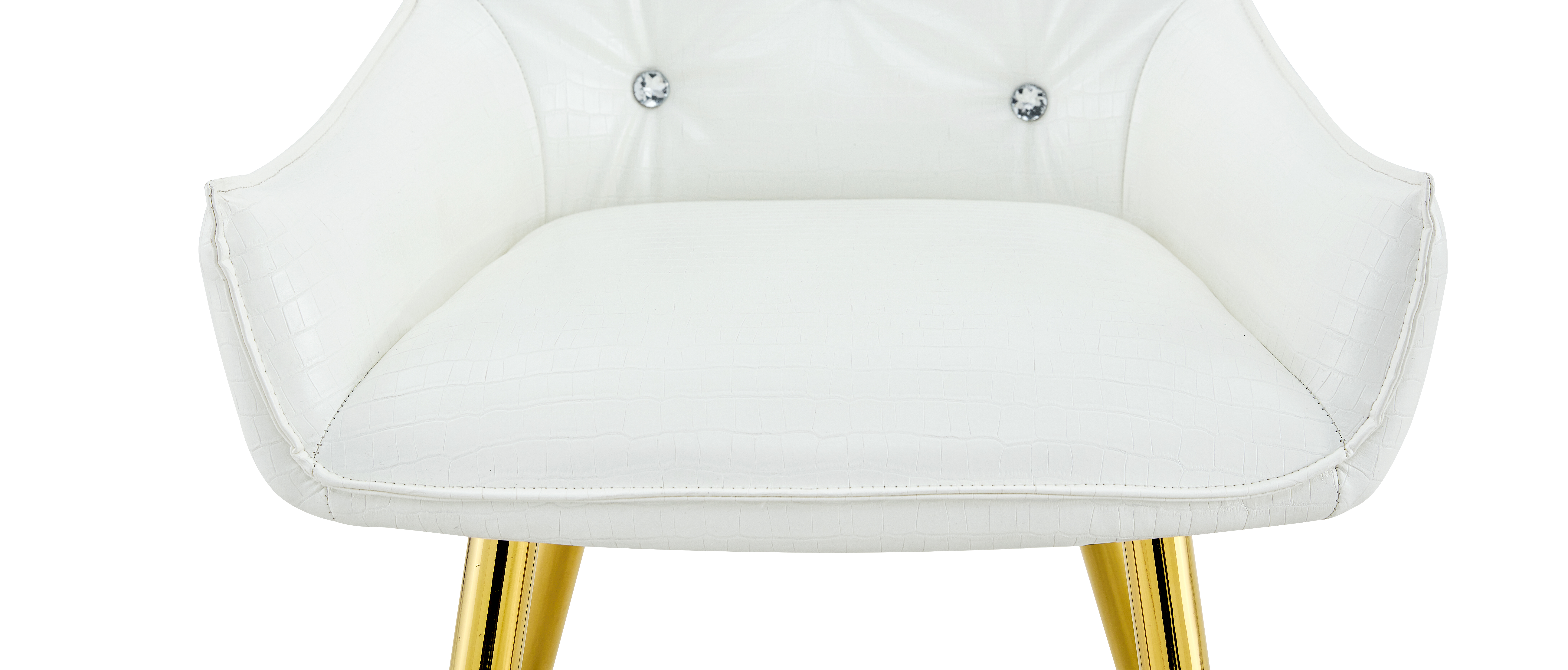 - Single Box ProductProduct Name:Crocodile Pattern Premium PU Leather Accent Chair, Diamond Decor Backrest, Chrome Golden Metal Legs & High-Resilience Sponge Cushion – Versatile for Office, Dining Room & Living Room (White, Set of 2)Place of Origin:ChinaMain Color:WhiteMain Material:PU LeatherFiller:Fiber Foam PadsProduct Style:ModernUse Case:Dining RoomChair Type:Dining ChairsChair Back Style:Solid BackChair Upholstery Material:MetalChair Shape:SquareChair Fill Material:FoamChair Care Instructions:Wipe CleanSeating Quantity:Set of 2Product DimensionsAssembled Length (in.):23.62Assembled Width (in.):21.26Assembled Height (in.):33.46Product Weight (lbs.):15.43Package SizeLength (in.):25.79Width (in.):20.87Height (in.):22.05Weight (lbs.):35.71Product Features【Exquisite Luxury & High-End Design】Elevate your home with a touch of opulence. This chair features premium crocodile-patterned leather upholstery paired with a sophisticated diamond-tufted backrest adorned with sparkling diamond-like buttons. The sleek electroplated metal legs provide a brilliant metallic luster, creating a stunning visual centerpiece that exudes modern luxury and prestige.【Durable & Easy-to-Clean Upholstery】 Engineered for both beauty and longevity, our high-quality crocodile leather is exceptionally scratch-resistant and wear-resistant. The surface is also waterproof and stain-resistant, making it remarkably easy to maintain. Whether it’s a spill or daily dust, a simple wipe with a damp cloth restores its pristine, high-end look instantly.【Spring Pack Comfort & Anti-Deformation】 Experience unparalleled comfort with our advanced seating technology. The seat cushion is filled with high-elastic sponge and integrated spring packs (pocket springs), similar to high-end mattresses. This combination provides superior rebound and ergonomic support, ensuring the cushion remains plush and resists deformation even after years of prolonged use.【Adjustable Leveling Feet & Floor Protection】 Stability is guaranteed on any surface. Each leg is equipped with an adjustable leveling pad, allowing you to find the perfect balance even on slightly uneven floors. These non-slip pads also act as a protective barrier, safeguarding your expensive hardwood, tile, or laminate floors from scratches, scuffs, and noise.【Versatile Statement Piece for Any Room】 With its unique texture and glamorous accents, this chair is more than just seating—it’s a piece of art. Perfect as a sophisticated dining chair, a chic vanity seat, or a professional accent chair for your office. Its heavy-duty construction ensures a high weight capacity while maintaining its elegant, high-fashion silhouette.DescriptionsLuxury Crocodile Pattern Dining Chair with Diamond AccentsTransform your space into a sanctuary of style and comfort; our luxury accent chair is meticulously designed for those who demand the finest in home decor, featuring premium crocodile-patterned leather and a diamond-tufted backrest with sparkling buttons that exude high-end glamour, while the electroplated legs add a modern, polished finish that catches the light beautifully. The seat is engineered with high-elastic sponge and integrated spring packs, providing mattress-like support that won’t sag or deform over time, and the durable upholstery is scratch-resistant, waterproof, and stain-resistant for effortless maintenance and long-term beauty. It also includes adjustable leveling feet to ensure stability on any floor while preventing scratches, making it perfect for dining rooms, vanities, or creative offices—luxury you can feel!