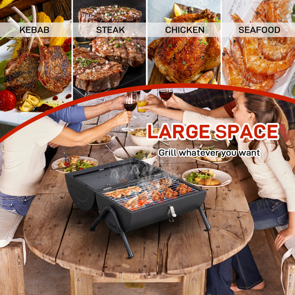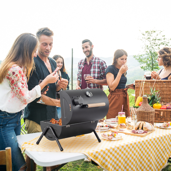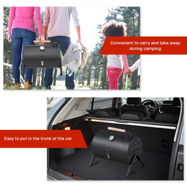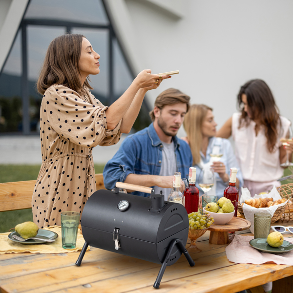 - Experience the joy of grilling anywhere you go with our Portable Charcoal Grill, the perfect companion for outdoor adventures and intimate backyard gatherings. This compact and durable grill is designed with convenience in mind, featuring a wooden handle for easy transport, a secure lid lock for on-the-go, and a built-in thermometer for precise cooking. Whether it’s for a picnic, camp-out, or a cozy cookout in your own backyard, this grill’s portability and performance make it an essential tool for any BBQ enthusiast.