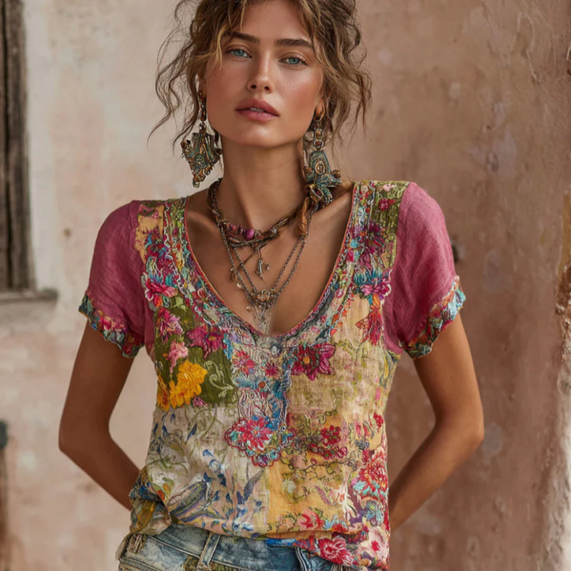 Printed Top Women’s Patchwork Round-neck Pullover Stylish T-shirt