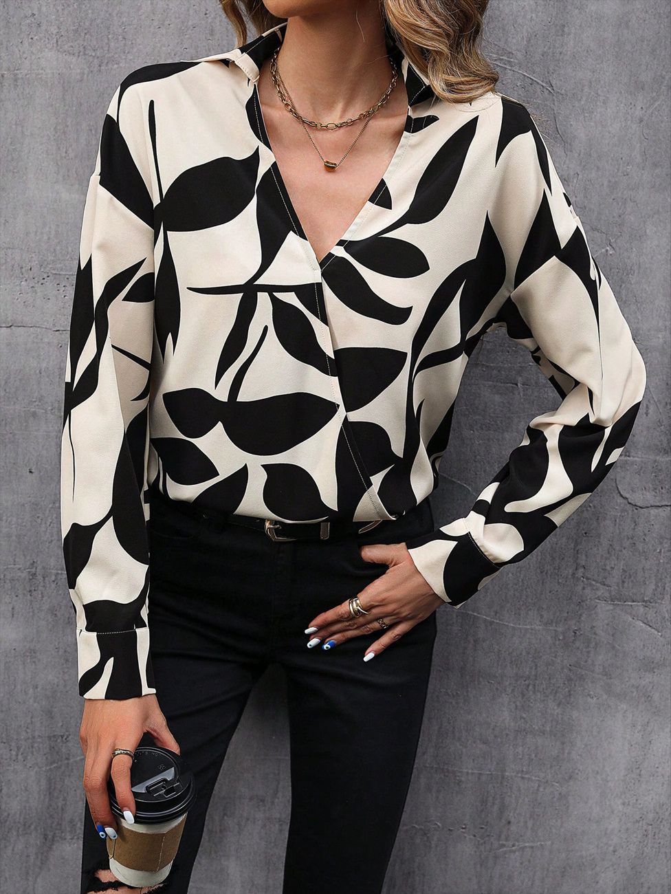 Printed V-Neck Long-Sleeve Loose Casual Fashion Top