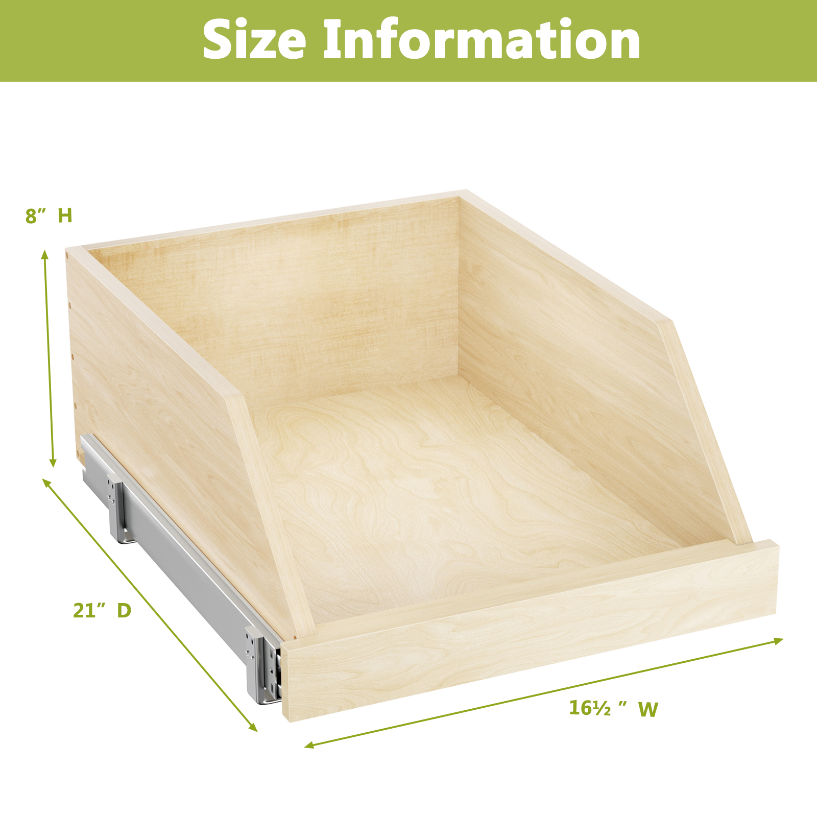 • Single Box ProductProduct Name:Pull Out Cabinet Organizer High Drawer 16½” W x 21″ D Hard Close Wood Slide Out Shelves Cabinet Storage and Organizer with Full Extension Rail Slides Pull Out Drawer for Kitchens Cabinet PantryMain Color:WoodMain Material:WoodProduct DimensionsAssembled Length (in.):21.00Assembled Width (in.):16.50Assembled Height (in.):8.00Product Weight (lbs.):14.96Package SizeLength (in.):21.00Width (in.):16.50Height (in.):8.00Weight (lbs.):15.00