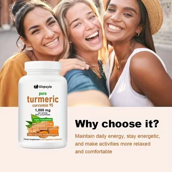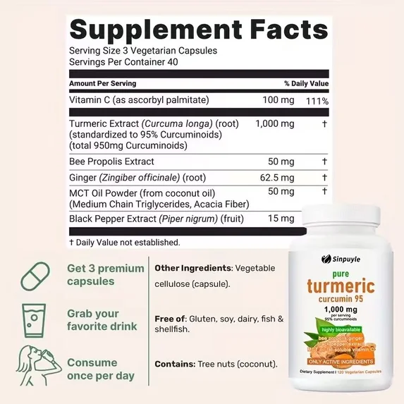 • Elevate your wellness routine with our Pure Turmeric Curcumin 95 supplement, delivering 1000mg of 95% curcuminoids per serving to support joint health and a robust antioxidant response. Our highly bioavailable formula is enhanced with ginger, black pepper extract, bee propolis, MCT oil, and fat-soluble vitamin C to maximize absorption and effectiveness. Crafted with only active ingredients, these vegetarian capsules are free from unnecessary fillers, making them suitable for daily use. Each bottle contains 120 capsules, providing a 4-month supply of premium support for your body’s natural defense systems. Whether you’re looking to maintain joint comfort or boost your overall vitality, this turmeric curcumin supplement is the perfect addition to your daily regimen.
