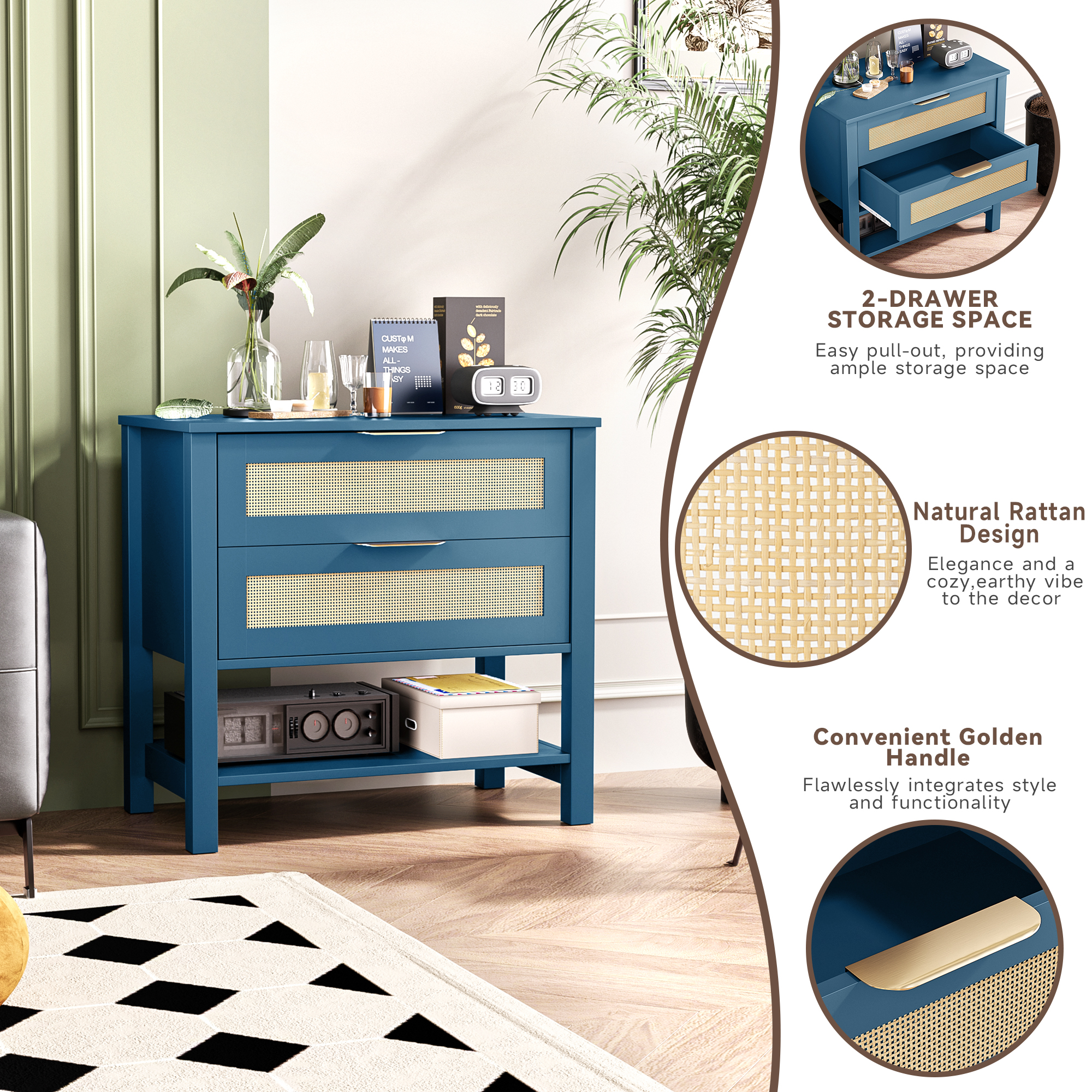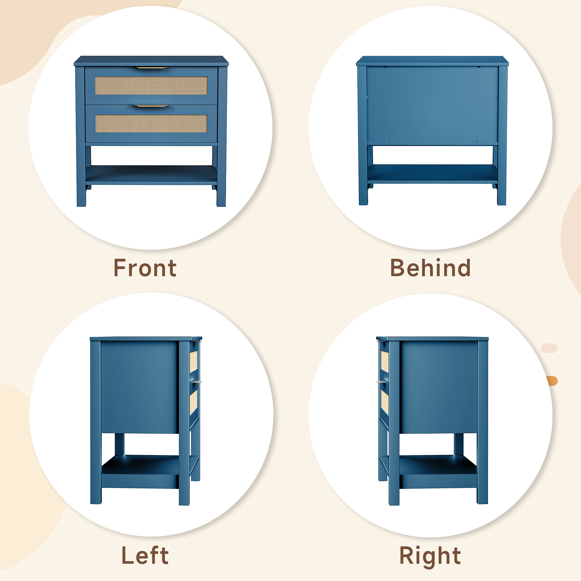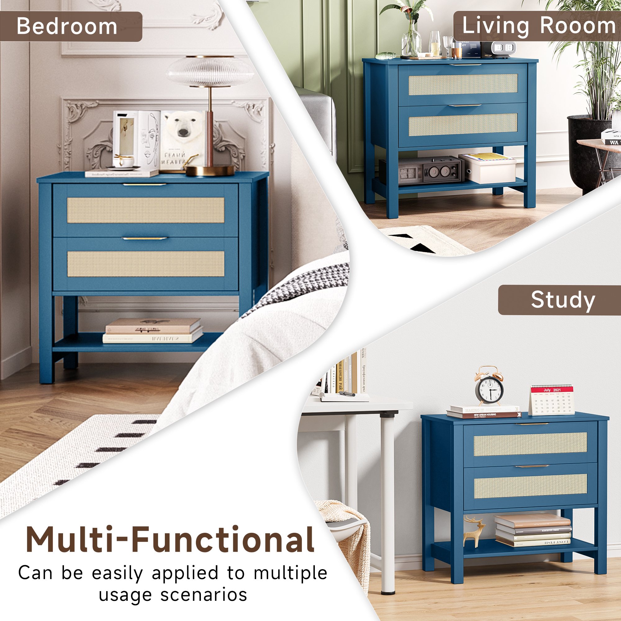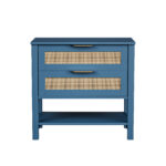 • Single Box ProductProduct Name:Rattan Nightstand with 2 Drawers and Storage Shelf Boho Bedside Narrow Side Table for BedroomMain Color:TurquoiseMain Material:MDFProduct DimensionsAssembled Length (in.):36.80Assembled Width (in.):15.60Assembled Height (in.):25.60Product Weight (lbs.):45.71Package SizeLength (in.):30.31Width (in.):18.31Height (in.):7.68Weight (lbs.):50.71