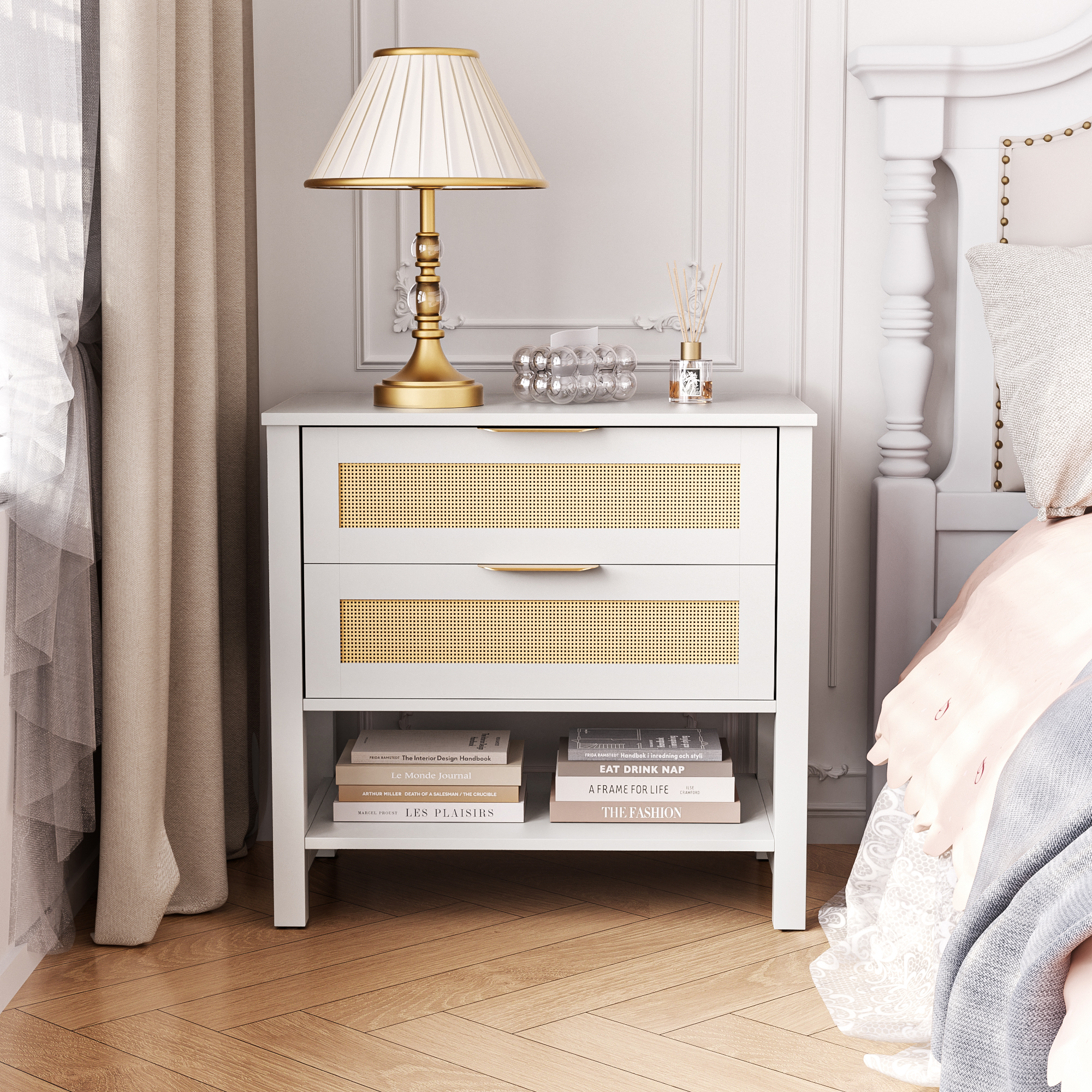 Rattan Nightstand With 2 Drawers And Storage Shelf Boho Bedside Narrow Side Table For Bedroom