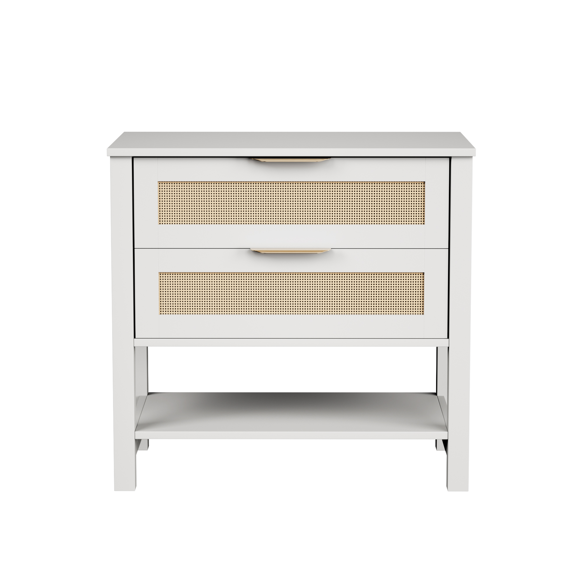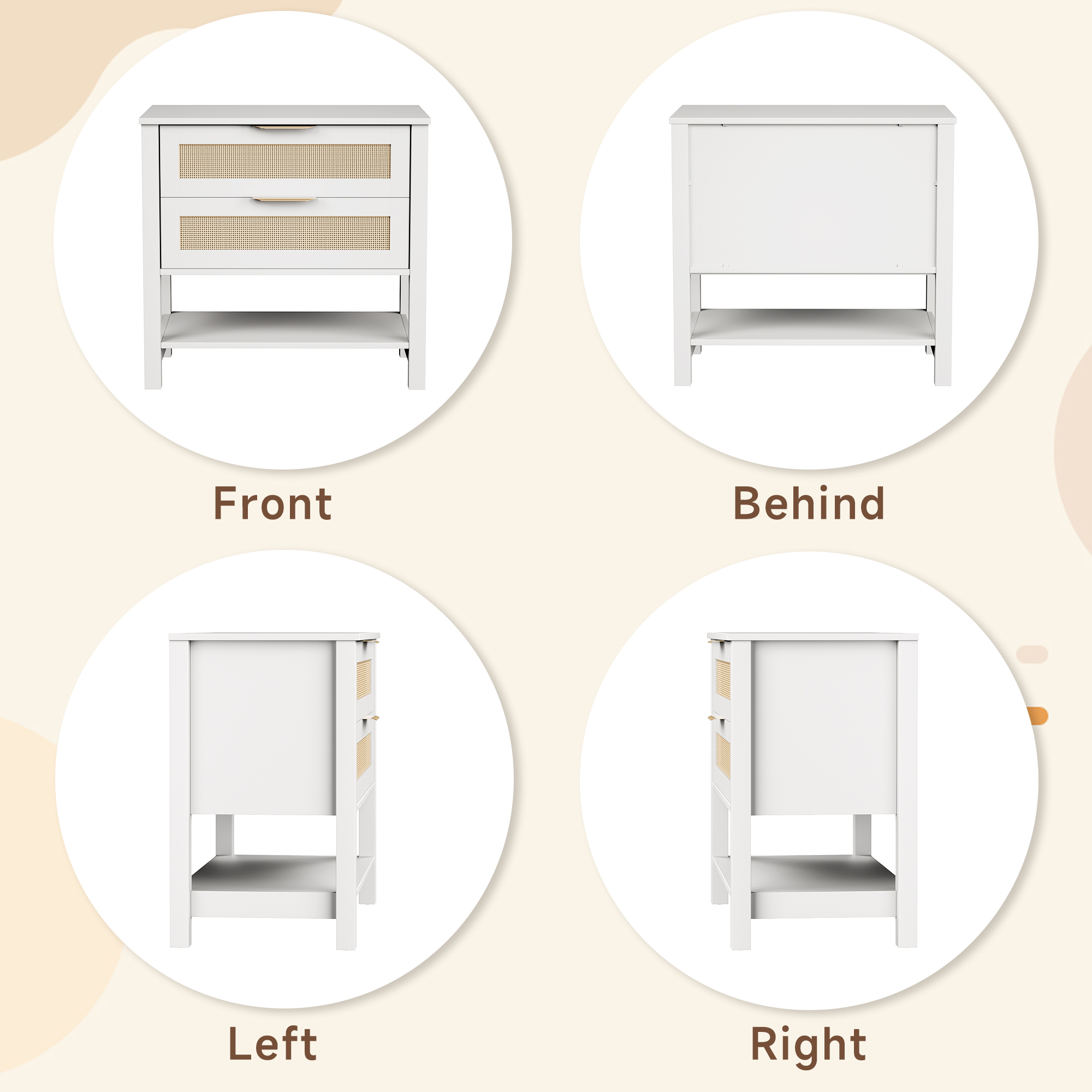• Single Box ProductProduct Name:Rattan Nightstand with 2 Drawers and Storage Shelf Boho Bedside Narrow Side Table for BedroomMain Color:WhiteMain Material:MDFProduct DimensionsAssembled Length (in.):36.80Assembled Width (in.):15.60Assembled Height (in.):25.60Product Weight (lbs.):45.71Package SizeLength (in.):30.31Width (in.):18.31Height (in.):7.68Weight (lbs.):50.71