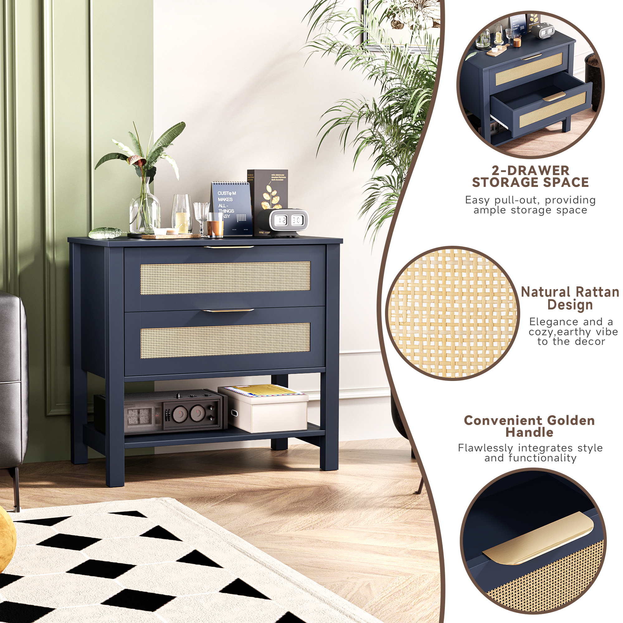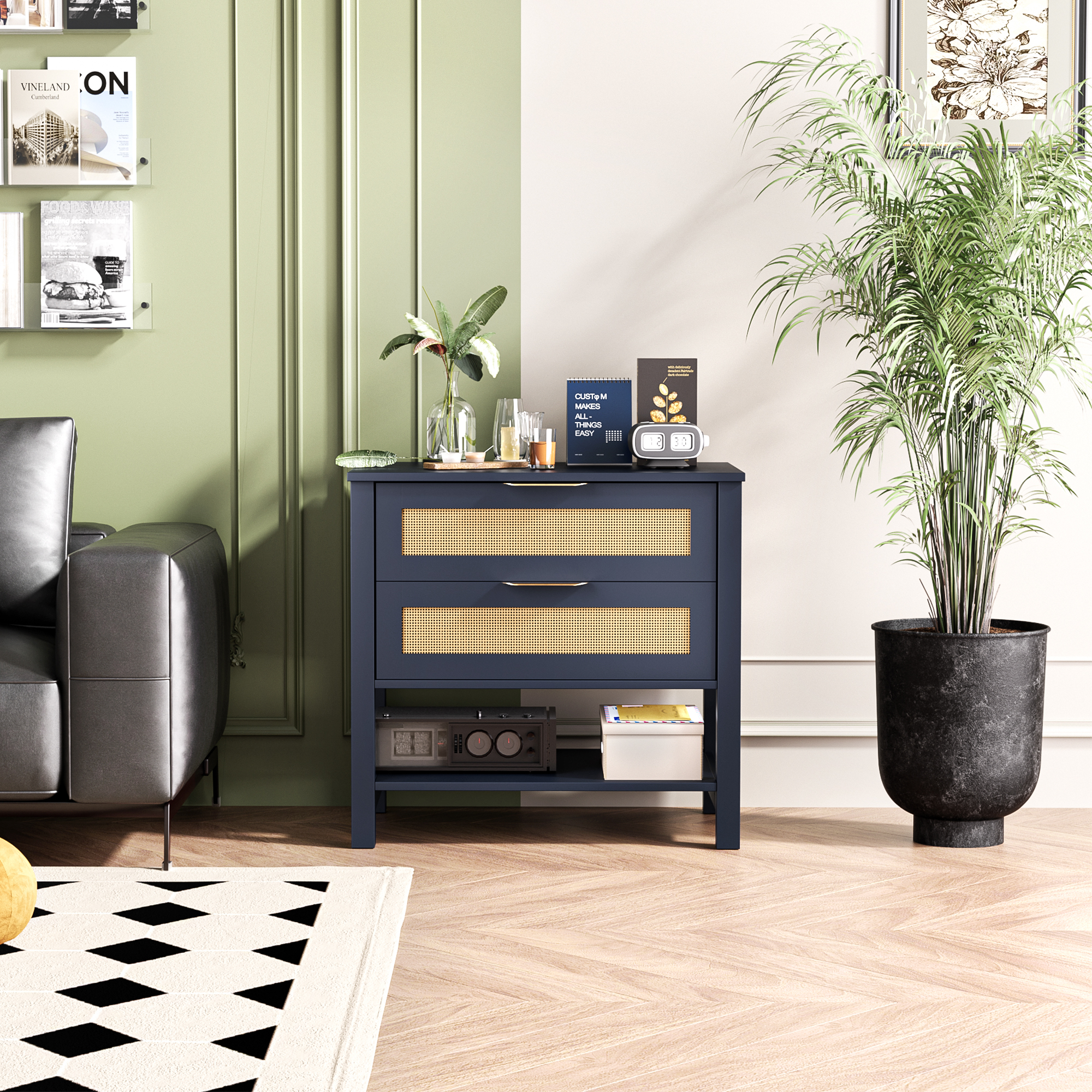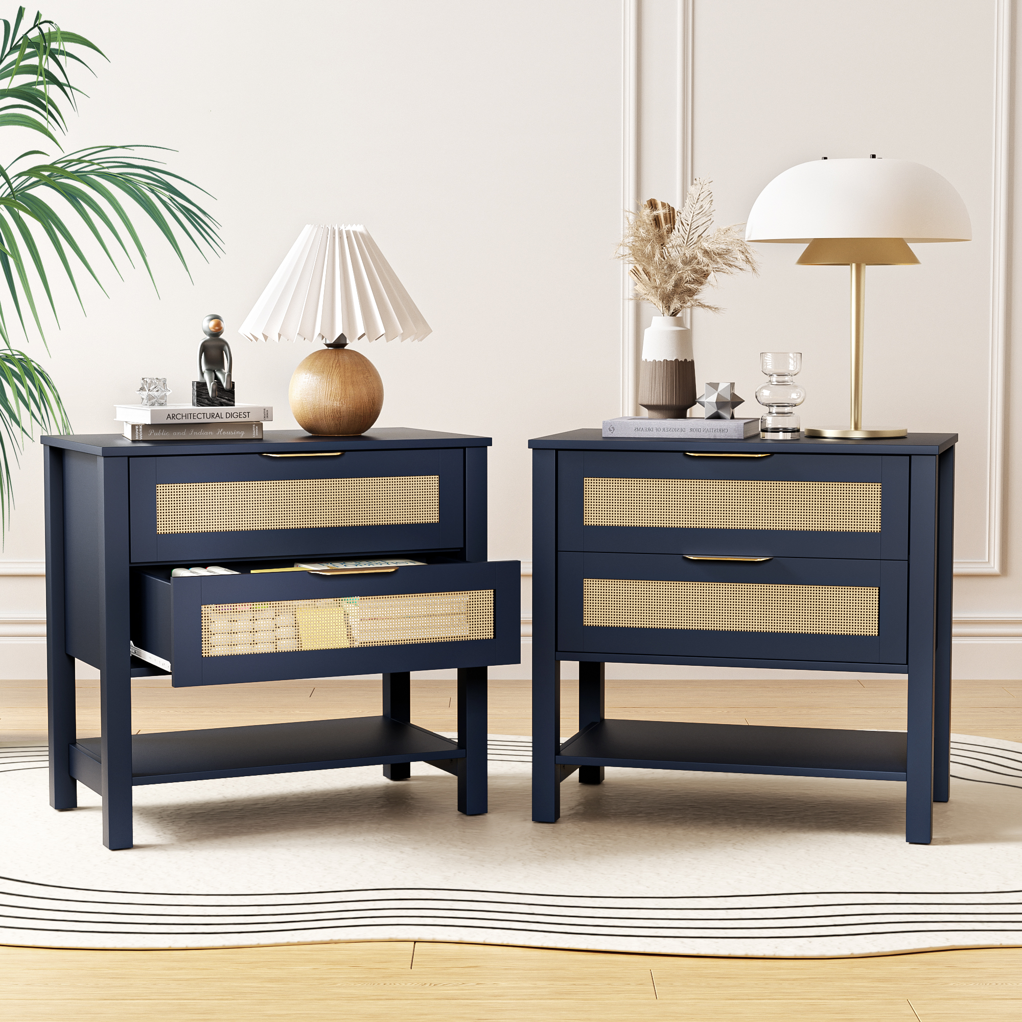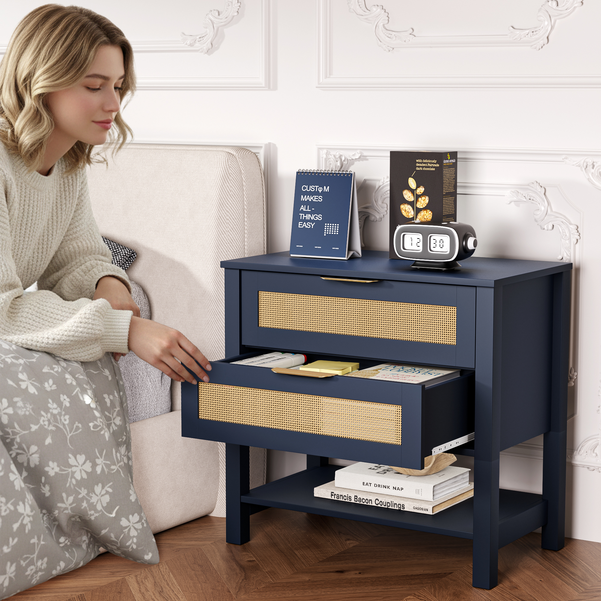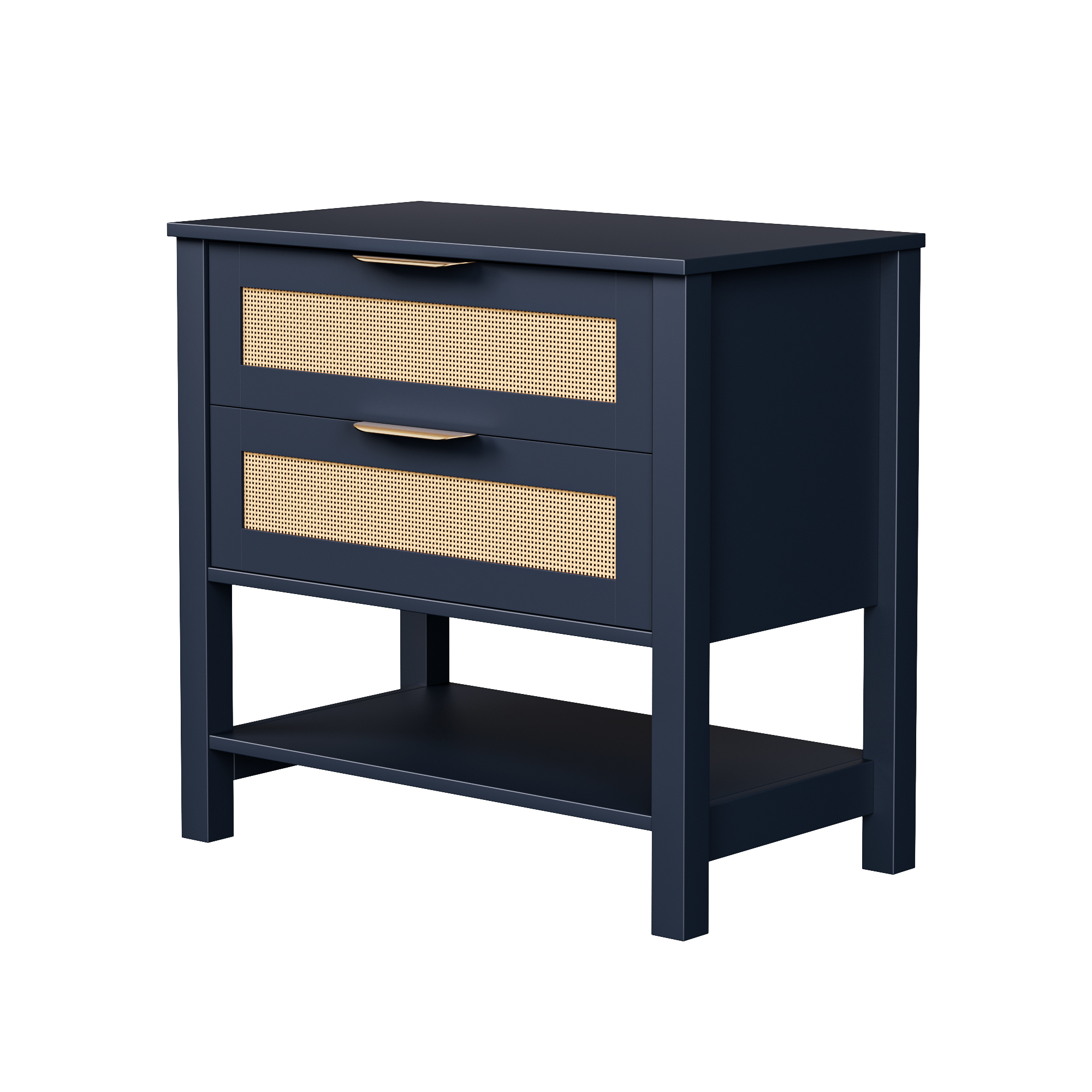 Single Box ProductProduct Name:Rattan Nightstand with 2 Drawers and Storage Shelf Boho Bedside Narrow Side Table for BedroomMain Color:Navy BlueMain Material:MDFProduct DimensionsAssembled Length (in.):36.80Assembled Width (in.):15.60Assembled Height (in.):25.60Product Weight (lbs.):45.71Package SizeLength (in.):30.31Width (in.):18.31Height (in.):7.68Weight (lbs.):50.71