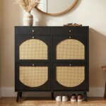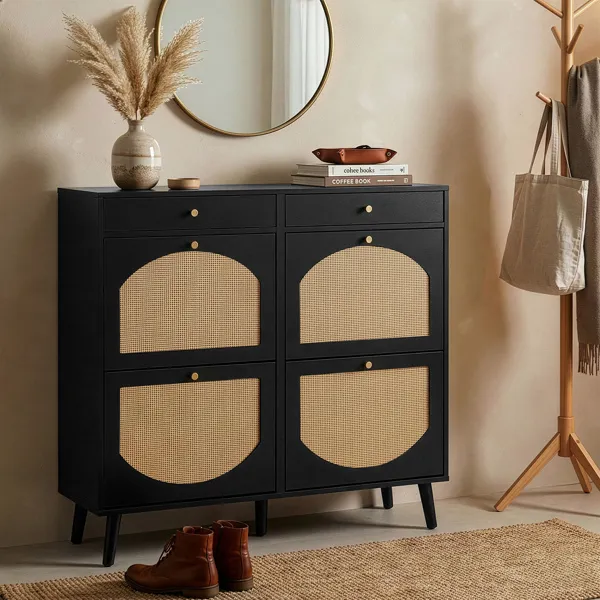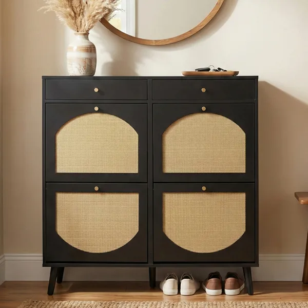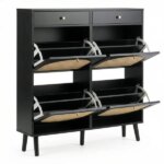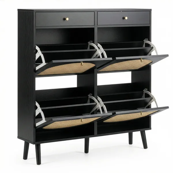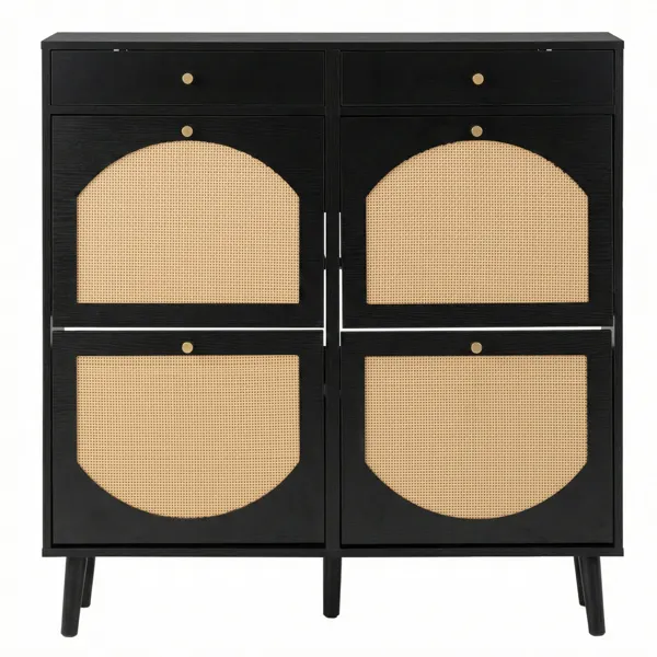 Rattan Shoe Cabinet With 2 Drawers And 4 Flip-tops, Made Of Particleboard, 105*24*110cm, Black