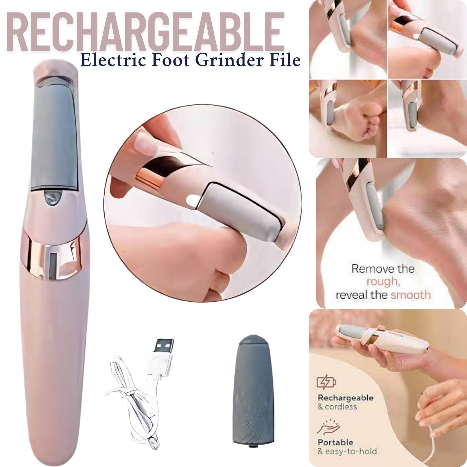 • – This USB rechargeable foot tool is designed to be comfortable and efficient. It uses durable diamond grinding heads to gently remove dead skin, making your feet feel soft, smooth, and refreshing.