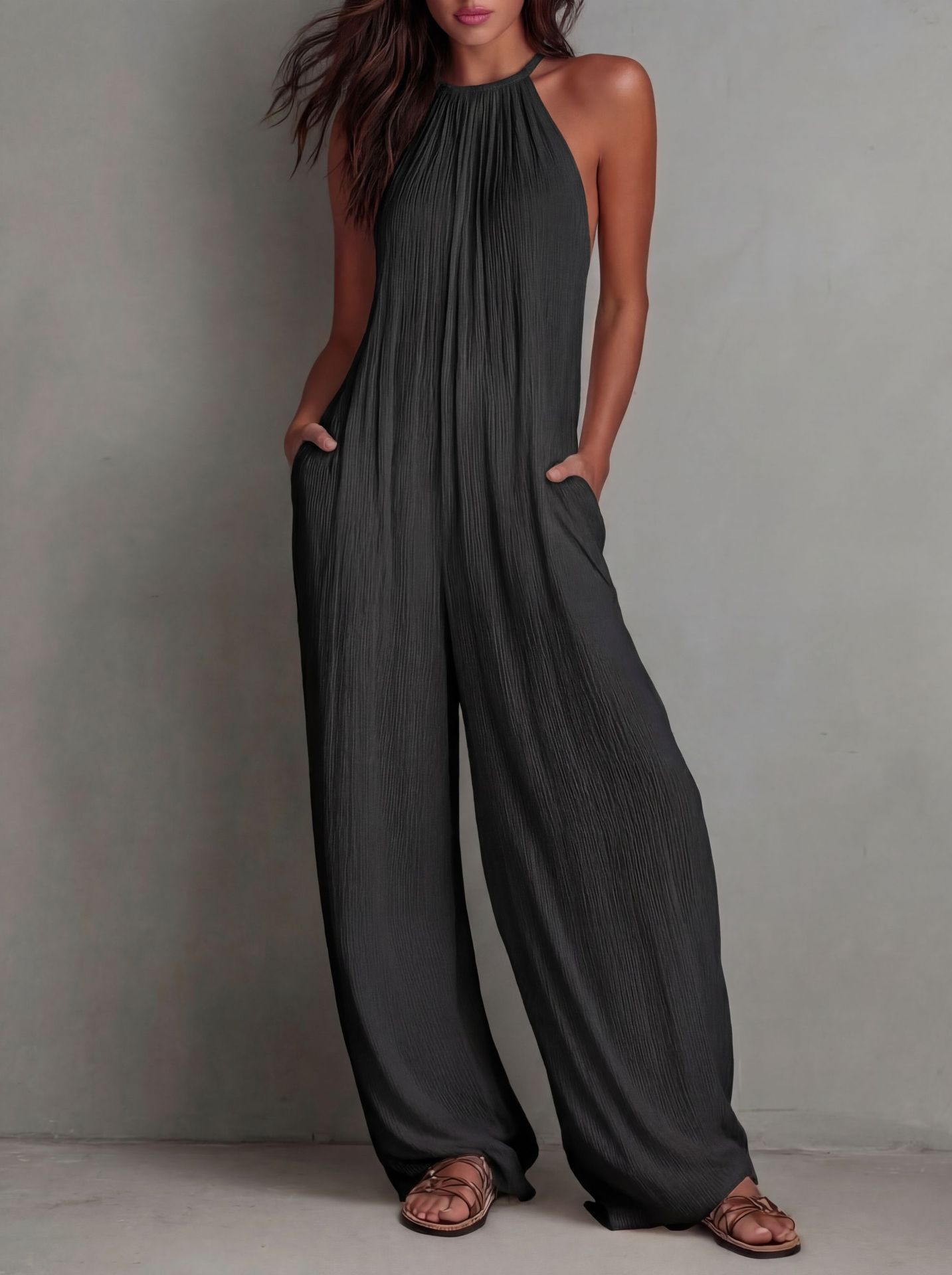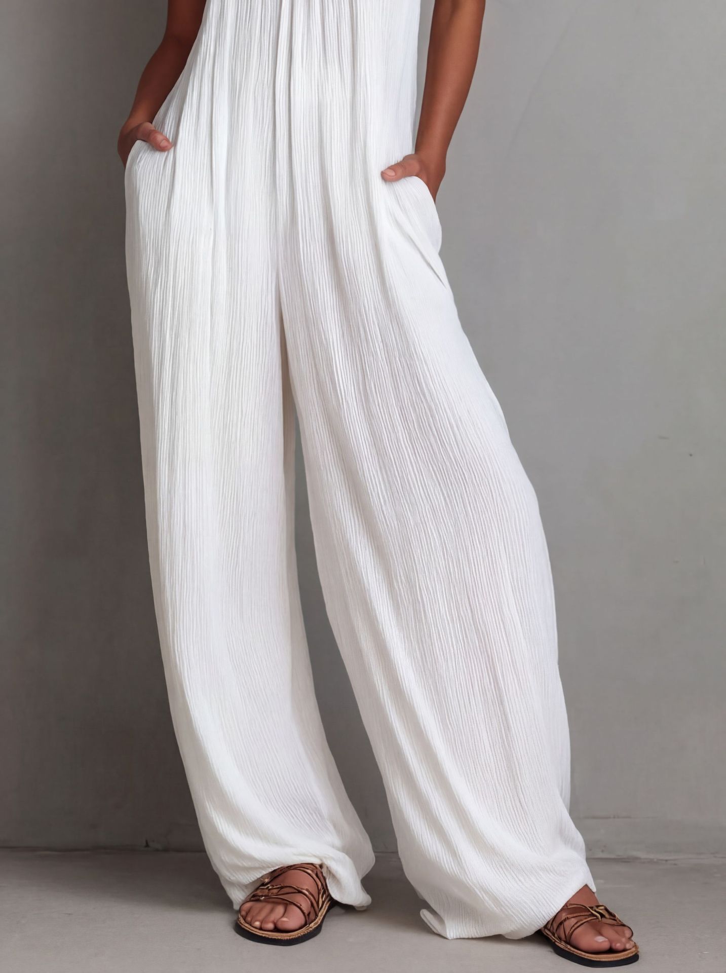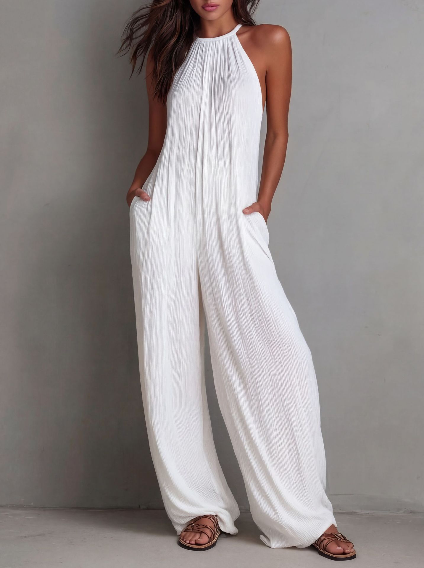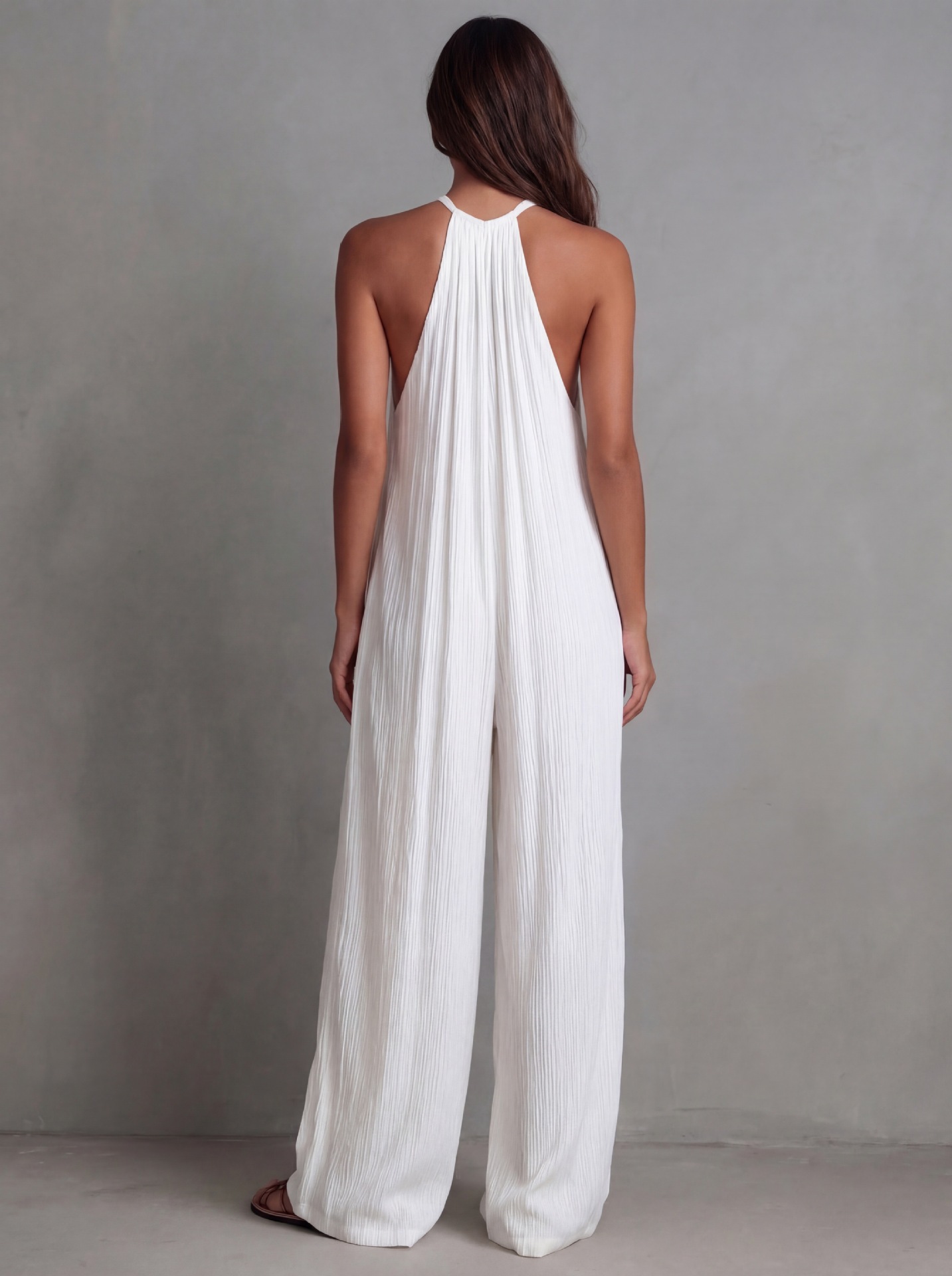 Resort-style White Pleated Open-back Wide-leg Jumpsuit is designed for style, comfort, and everyday use.