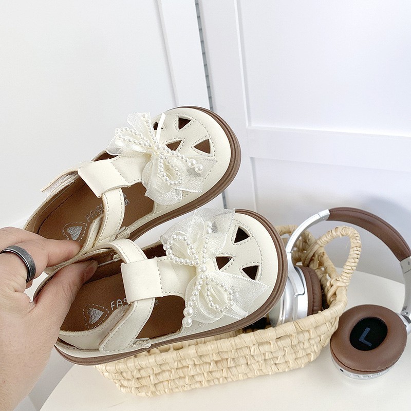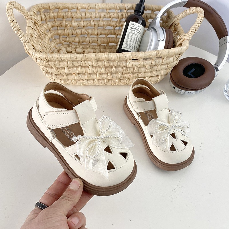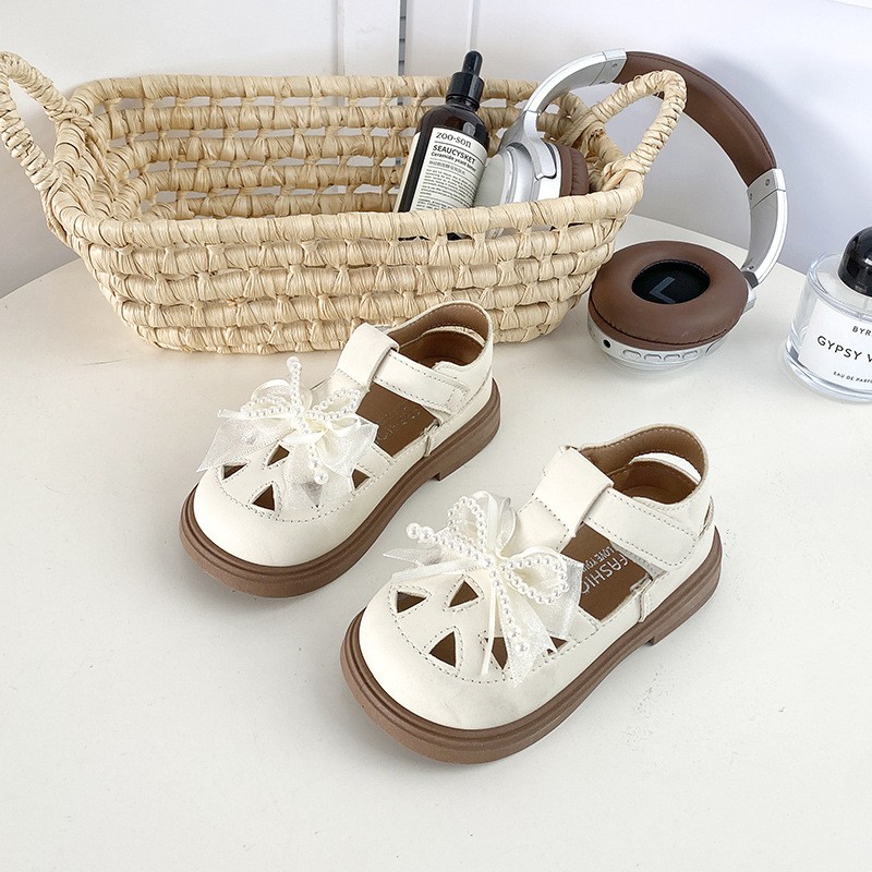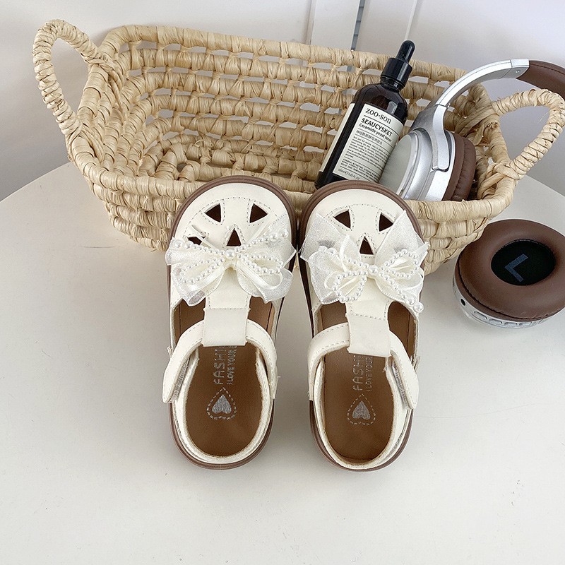 Retro Hollow Out Closed-Toe Sandals For Girls, Summer Bow Hook & Loop Princess Shoes, Soft Sole Footwear For Toddler & Little Girls