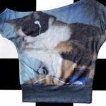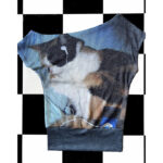 Retro Sassy Calico Cat Print Stretchy Asymmetrical Off-shoulder Short Sleeve