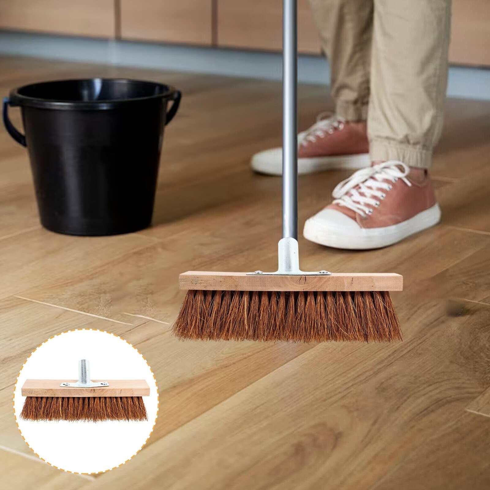 • The broom head is made with high-quality natural fiber bristles. It easily picks up both large debris and fine particles.