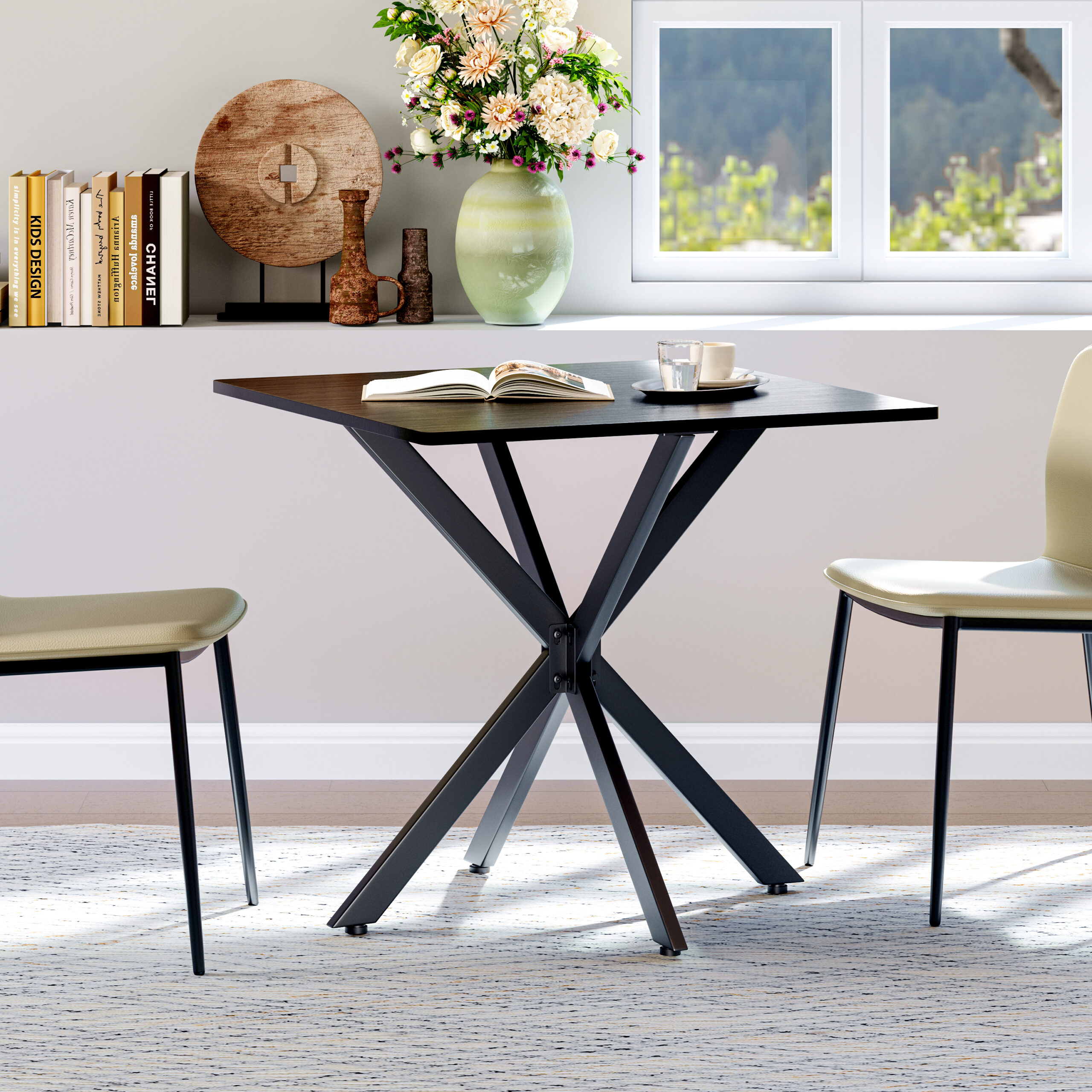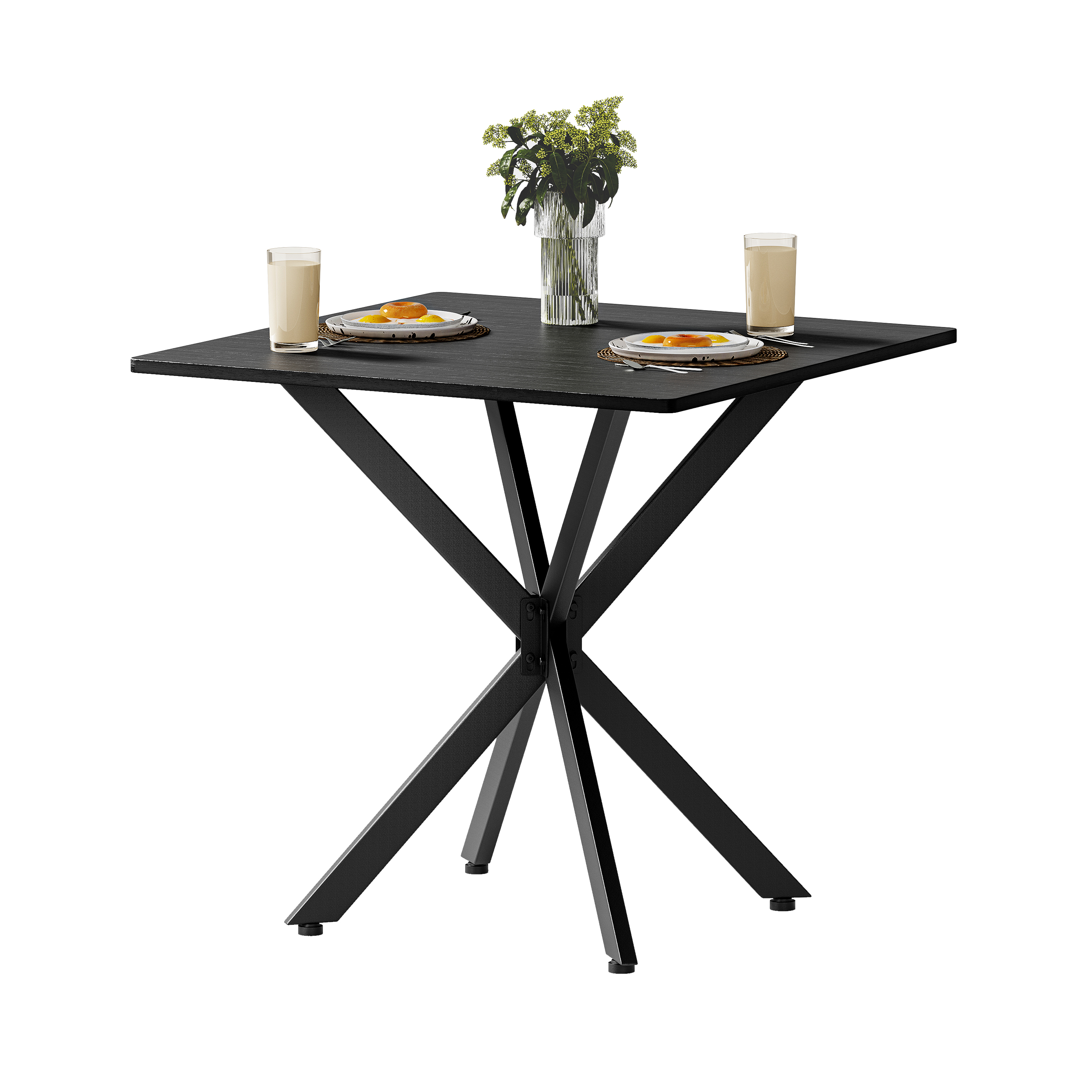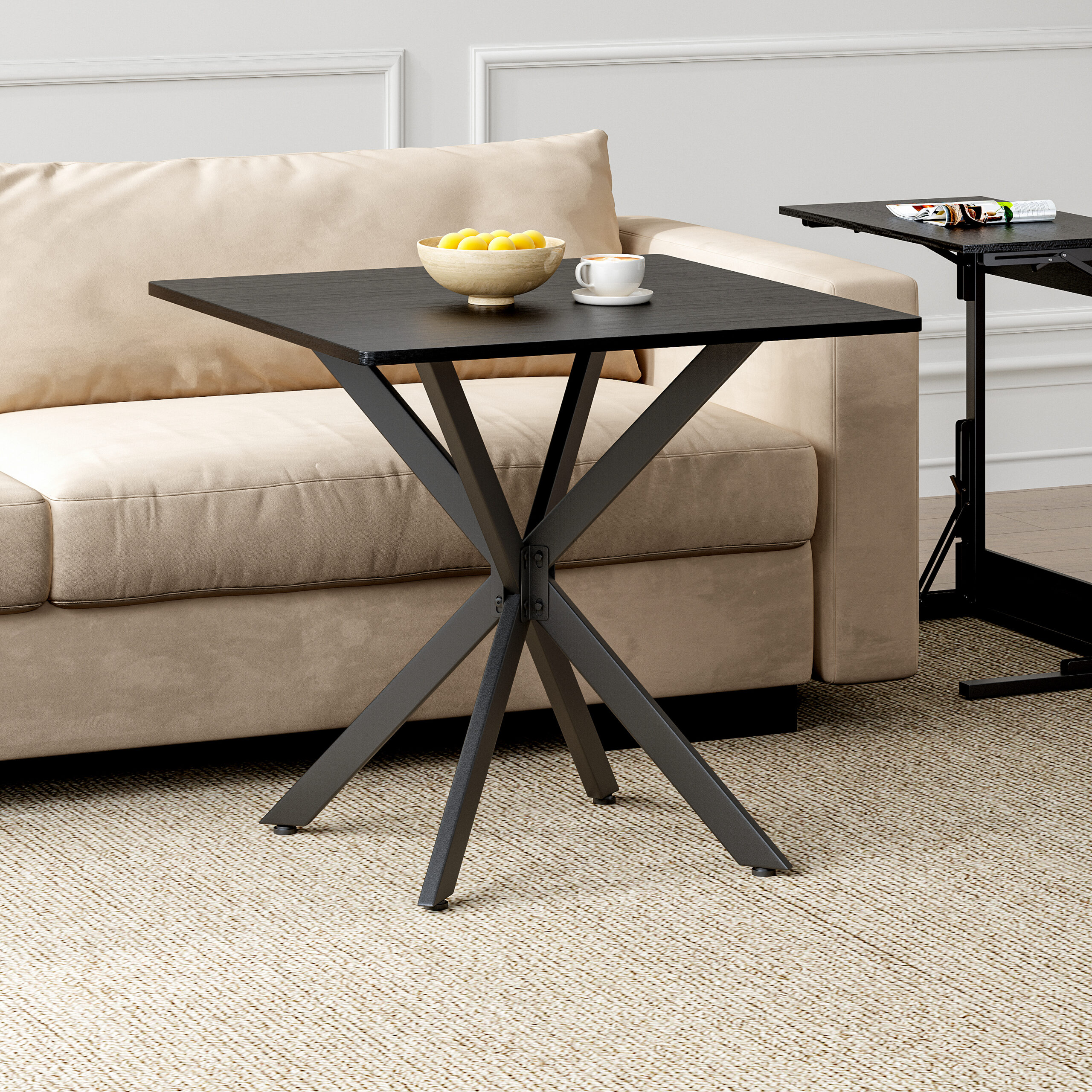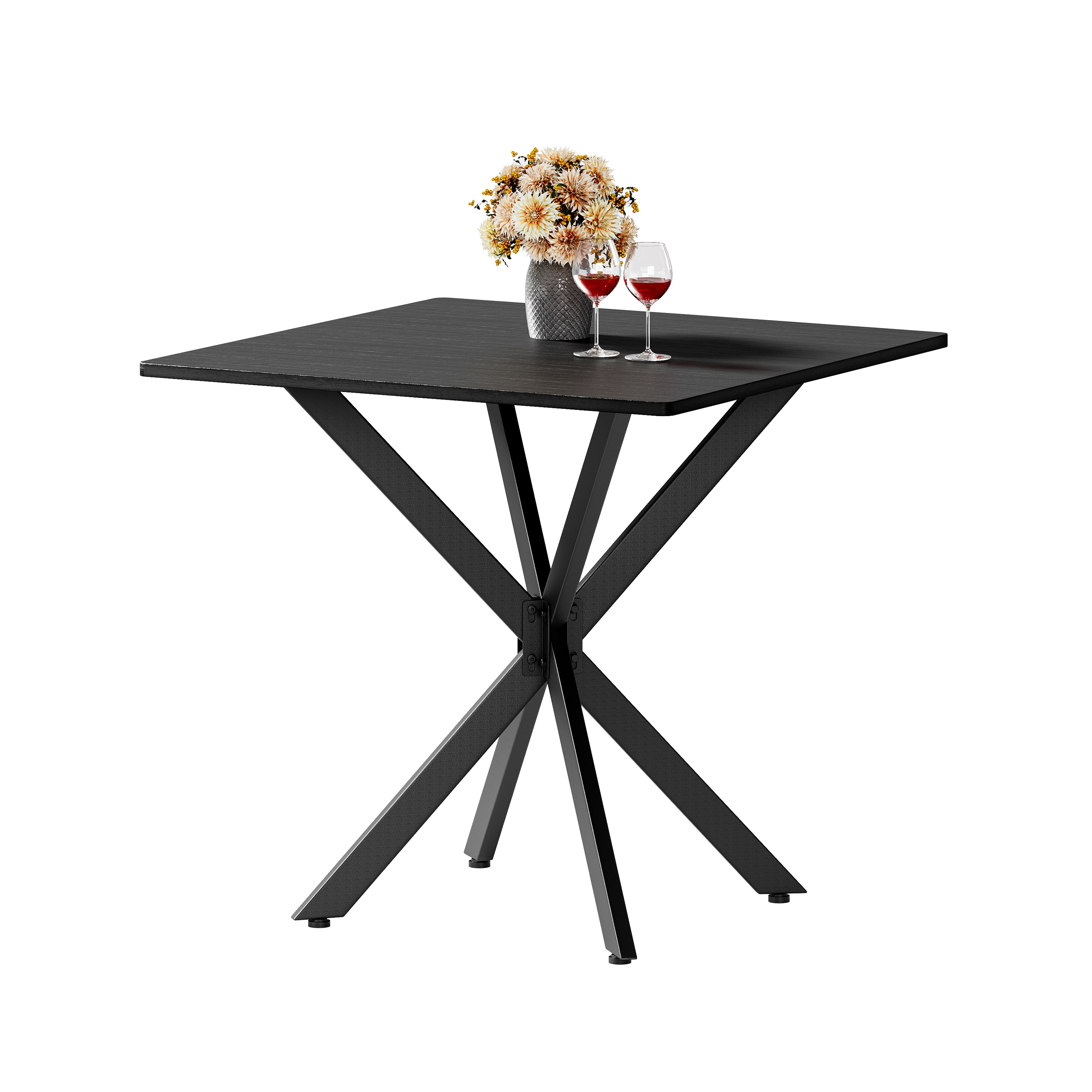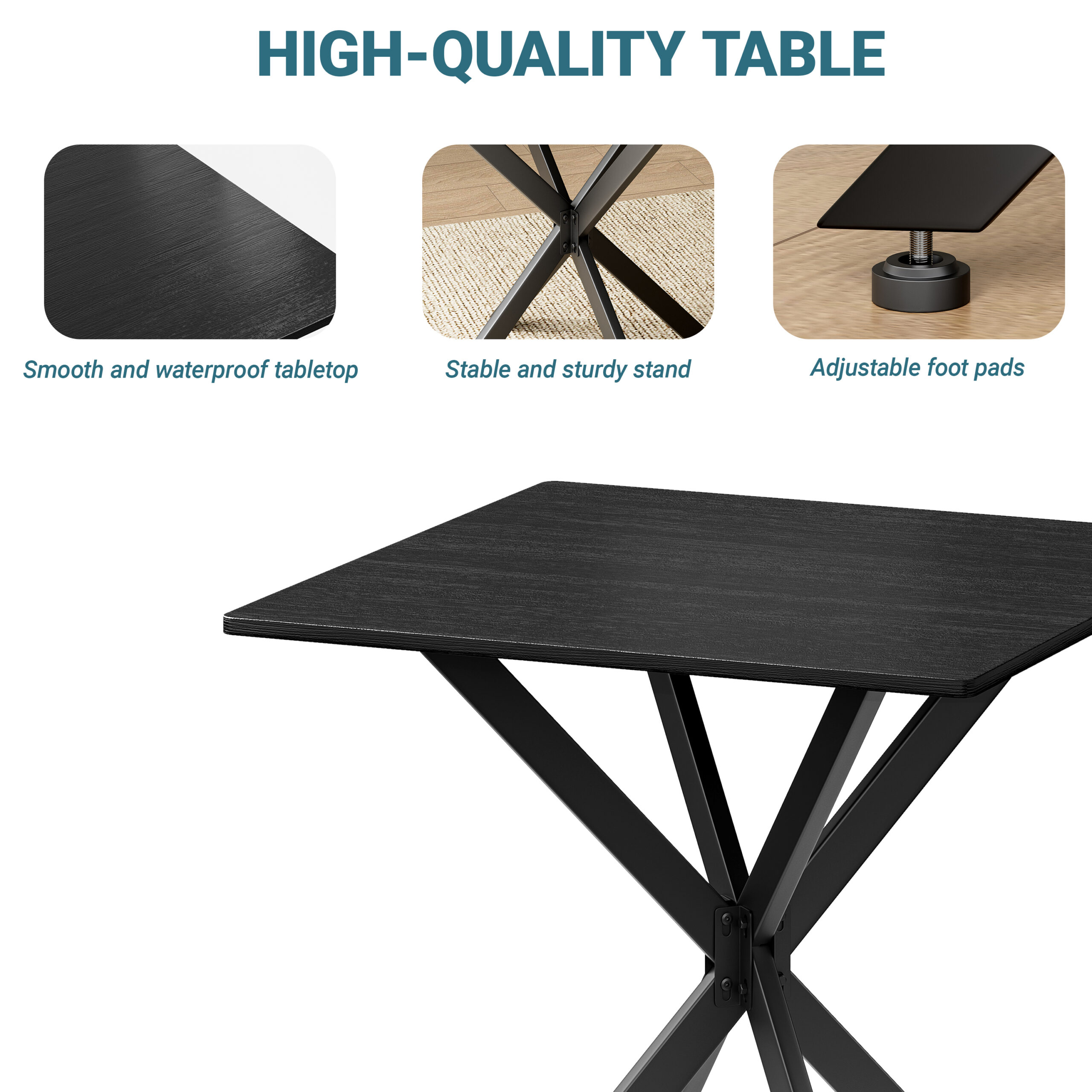 - Single Box ProductProduct Name:Rustic Square Side Table, X-Frame Metal Legs with Wood Grain Tabletop, Industrial Accent End Table for Living Room, Bedroom & Home Office, Balck, 31.5 x 31.5 x 29.5 InchesMain Color:BlackMain Material:Particle BoardProduct DimensionsAssembled Length (in.):31.50Assembled Width (in.):31.50Assembled Height (in.):29.45Product Weight (lbs.):27.80Package SizeLength (in.):36.42Width (in.):34.65Height (in.):2.76Weight (lbs.):32.63Product FeaturesModern Matte Black Finish: Features a sleek, full matte black finish with clean lines for a timeless monochrome look. This versatile design instantly elevates modern, industrial, or contemporary spacesMulti-Purpose for All Spaces: Works perfectly as a sofa side table, small coffee table, balcony accent table, or a compact dining table for two. It blends stylish appearance with practical function to meet your daily placement and storage needs anywhere at homeStable & Wobble-Resistant Structure: Built with premium powder-coated steel X-frame support and 4 adjustable leveling feet. It fits uneven floors easily, keeps the table balanced firmly, and maintains steady performance for daily useStain-Resistant & Easy to Maintain: The high-quality laminated tabletop is water-resistant, scratch-resistant, and stain-repellent. Daily spills and dust can be cleaned quickly with a damp cloth, saving maintenance time and keeping the table looking freshHassle-Free Quick Assembly: All necessary hardware and clear instructions are included. Assembly is quick and straightforward, so you can start using this functional table in minutesDescriptionsProduct DetailsProduct Dimensions31.5″L x 31.5″W x 29.5″HN.W / G.W27.8 lbs / 32.6 lbsMaterialsEngineered Wood, IronIncluded Components1 Table, All Necessary Hardware, Instruction ManualNumber of Packages1