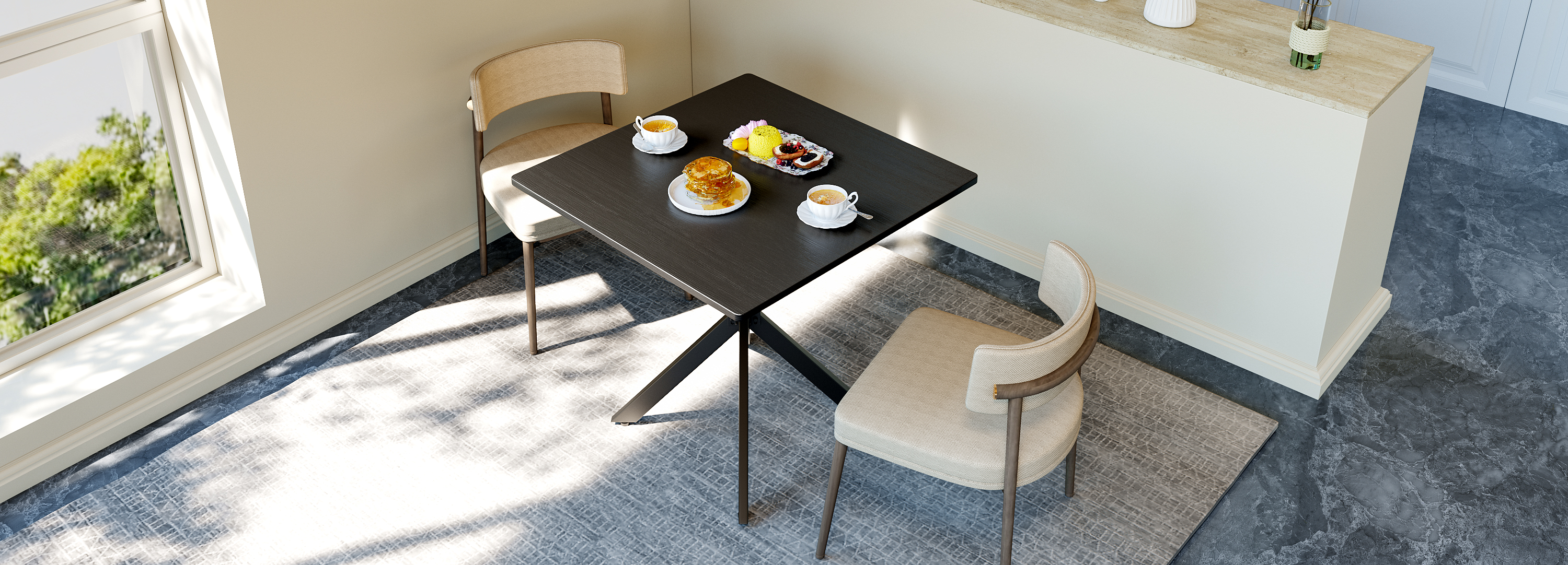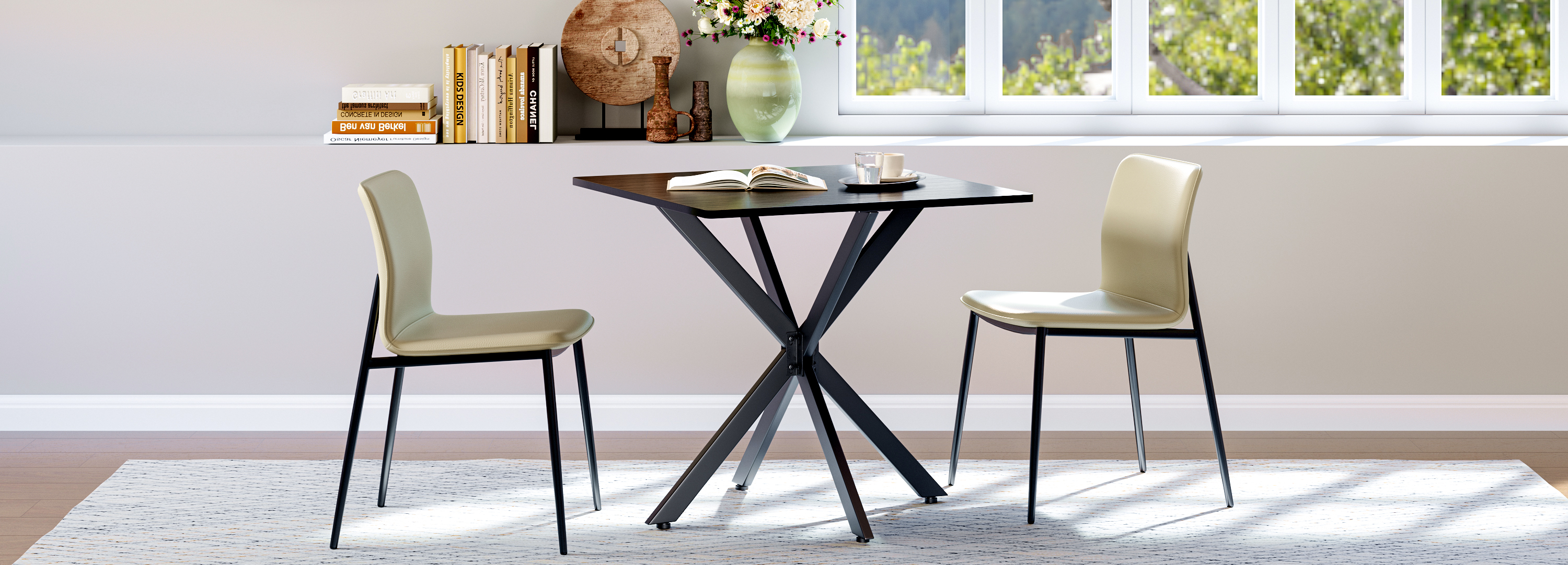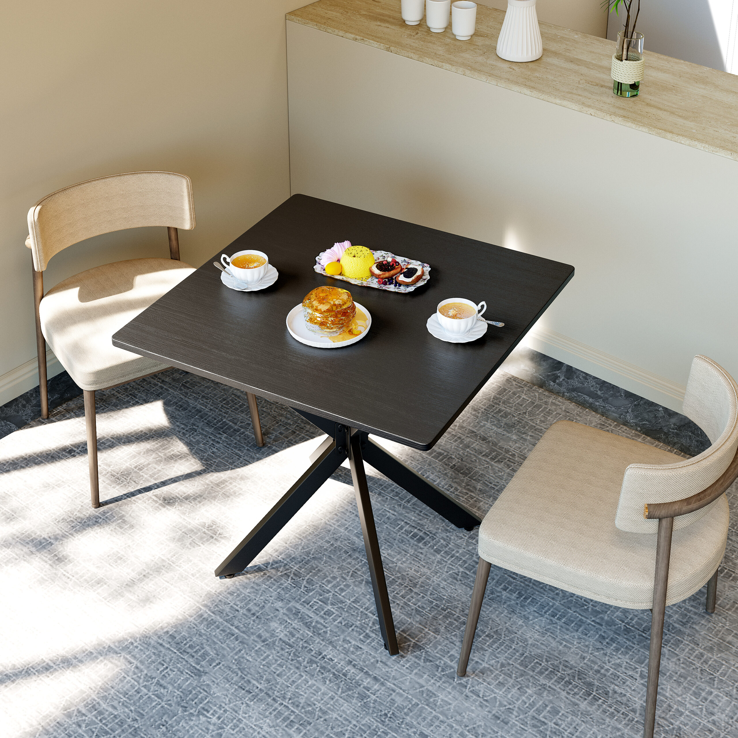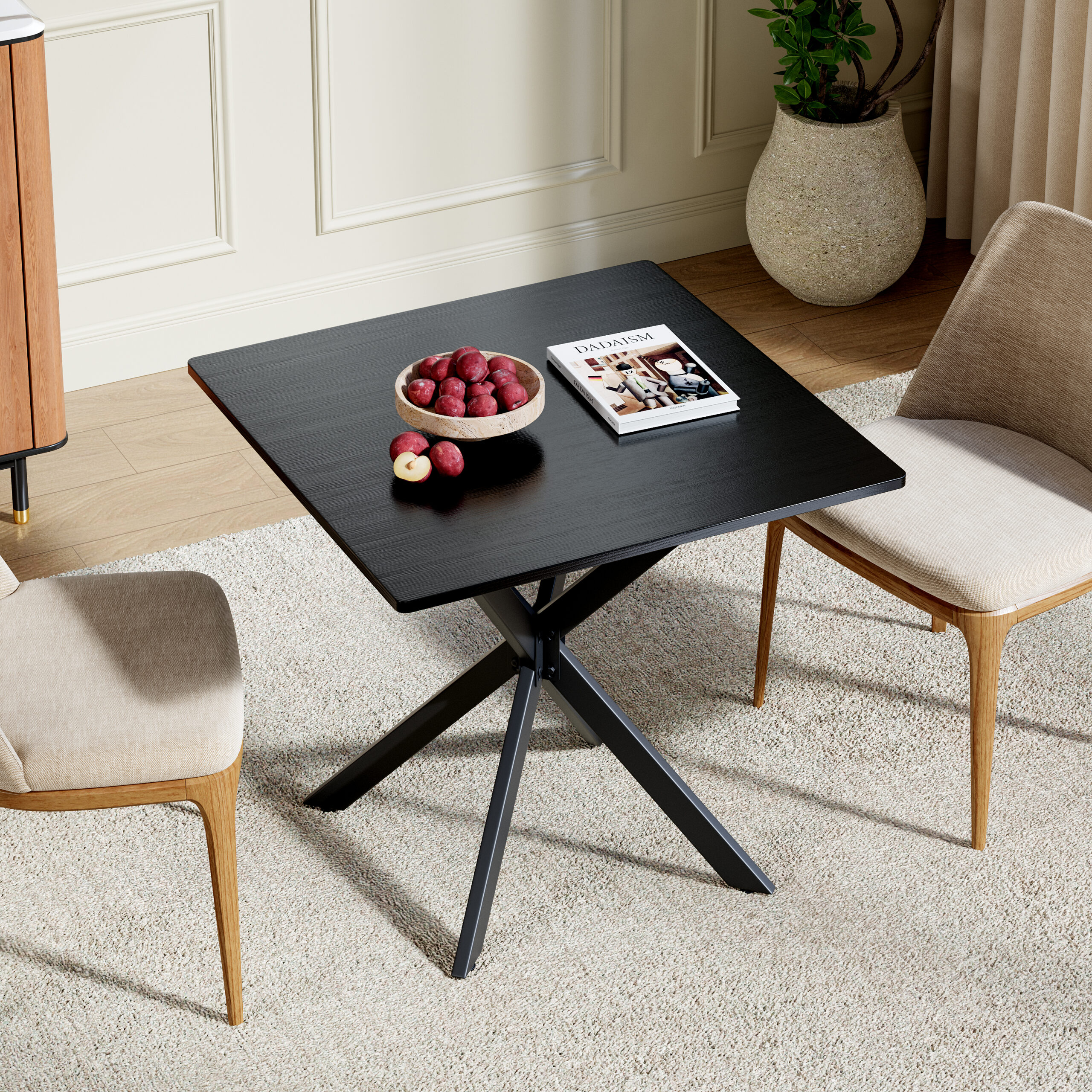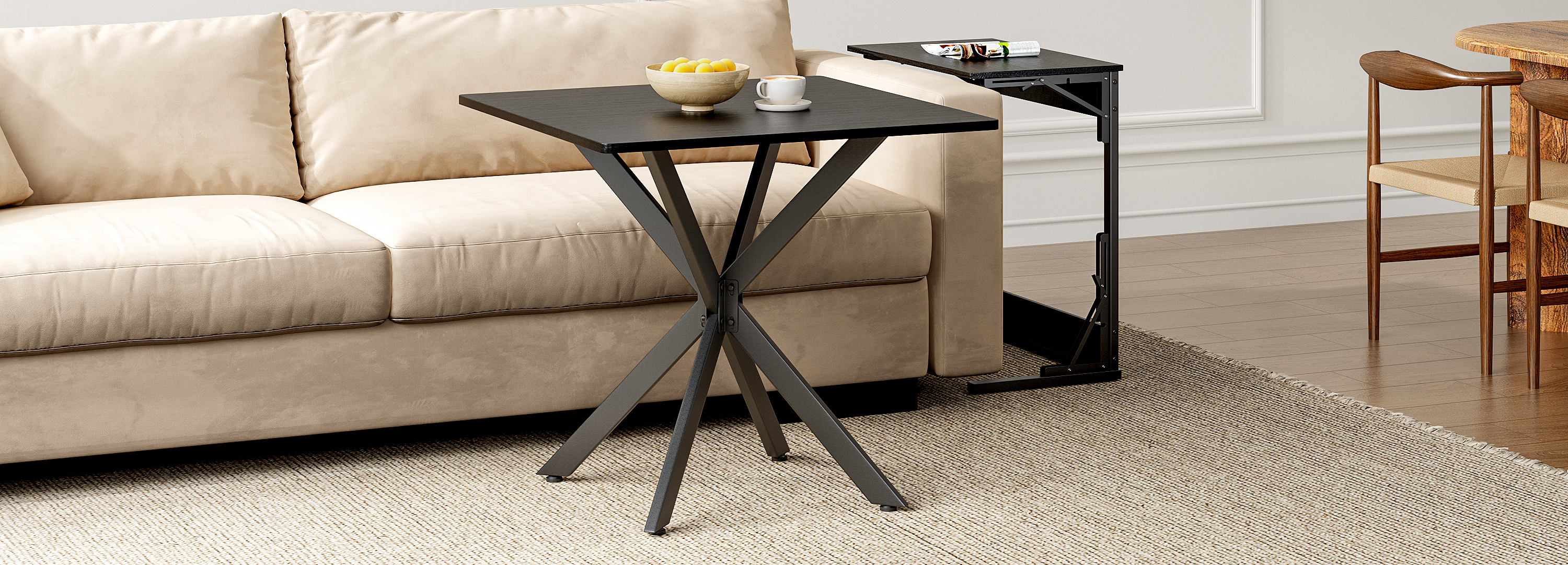 - Single Box ProductProduct Name:Rustic Square Side Table, X-Frame Metal Legs with Wood Grain Tabletop, Industrial Accent End Table for Living Room, Bedroom & Home Office, Balck, 31.5 x 31.5 x 29.5 InchesMain Color:BlackMain Material:Particle BoardProduct DimensionsAssembled Length (in.):31.50Assembled Width (in.):31.50Assembled Height (in.):29.45Product Weight (lbs.):27.80Package SizeLength (in.):36.42Width (in.):34.65Height (in.):2.76Weight (lbs.):32.63Product FeaturesModern Matte Black Finish: Features a sleek, full matte black finish with clean lines for a timeless monochrome look. This versatile design instantly elevates modern, industrial, or contemporary spacesMulti-Purpose for All Spaces: Works perfectly as a sofa side table, small coffee table, balcony accent table, or a compact dining table for two. It blends stylish appearance with practical function to meet your daily placement and storage needs anywhere at homeStable & Wobble-Resistant Structure: Built with premium powder-coated steel X-frame support and 4 adjustable leveling feet. It fits uneven floors easily, keeps the table balanced firmly, and maintains steady performance for daily useStain-Resistant & Easy to Maintain: The high-quality laminated tabletop is water-resistant, scratch-resistant, and stain-repellent. Daily spills and dust can be cleaned quickly with a damp cloth, saving maintenance time and keeping the table looking freshHassle-Free Quick Assembly: All necessary hardware and clear instructions are included. Assembly is quick and straightforward, so you can start using this functional table in minutesDescriptionsProduct DetailsProduct Dimensions31.5″L x 31.5″W x 29.5″HN.W / G.W27.8 lbs / 32.6 lbsMaterialsEngineered Wood, IronIncluded Components1 Table, All Necessary Hardware, Instruction ManualNumber of Packages1