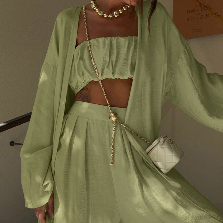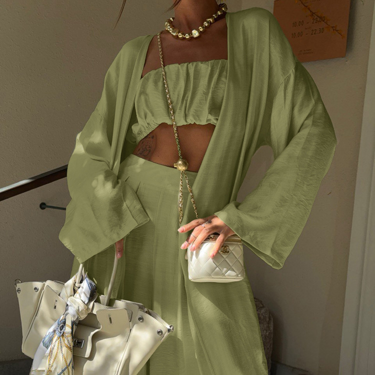 Sage Green 3-Piece Loungewear Set – Crop Top, Kimono Cardigan & Wide Leg Pants is designed for style, comfort, and everyday use.