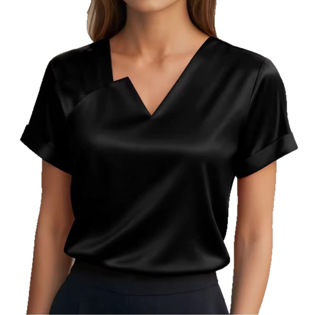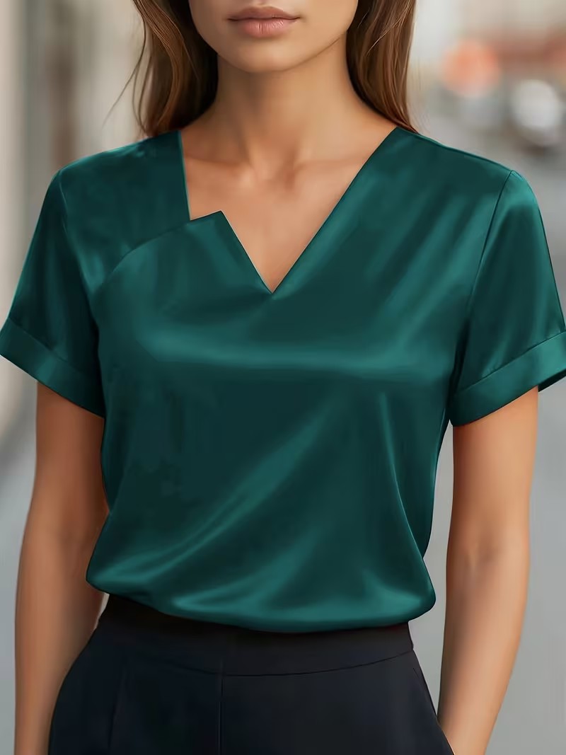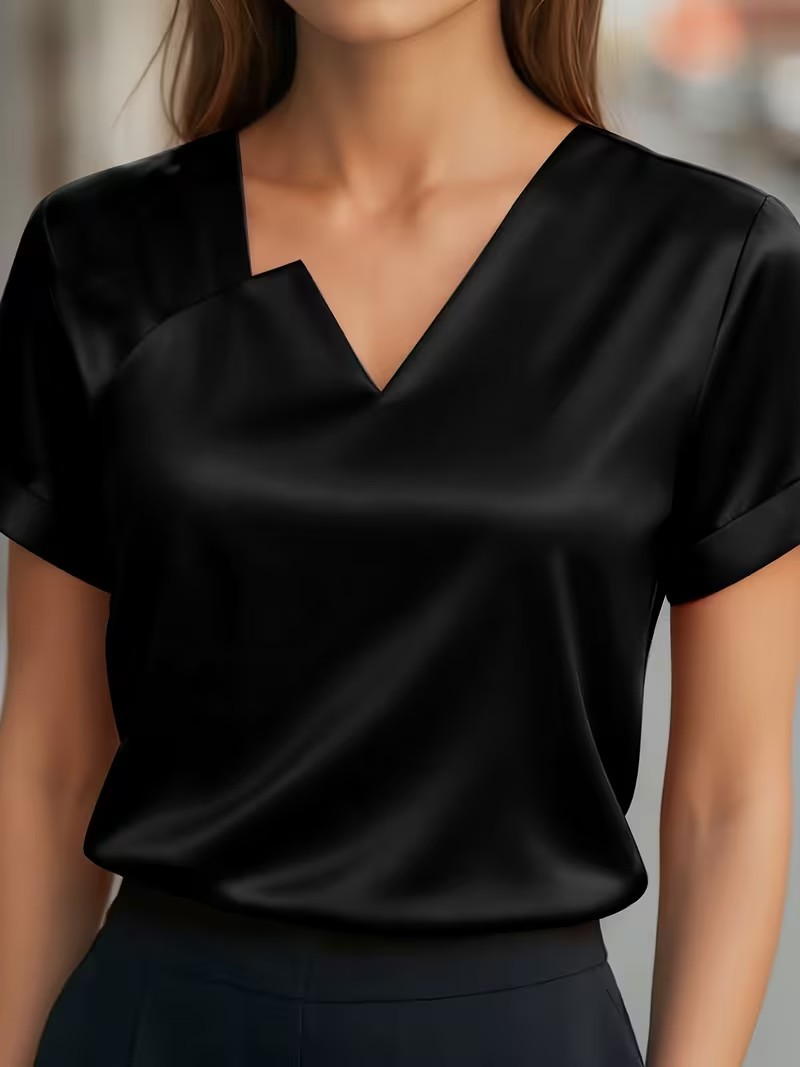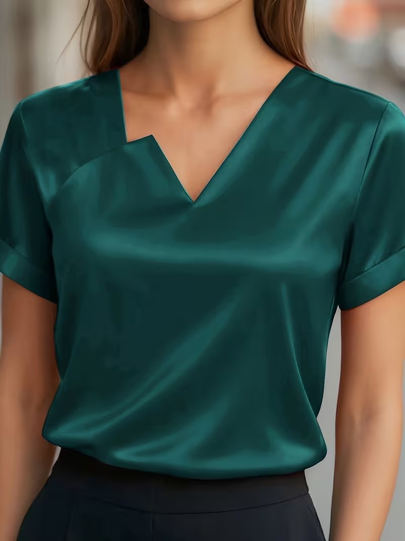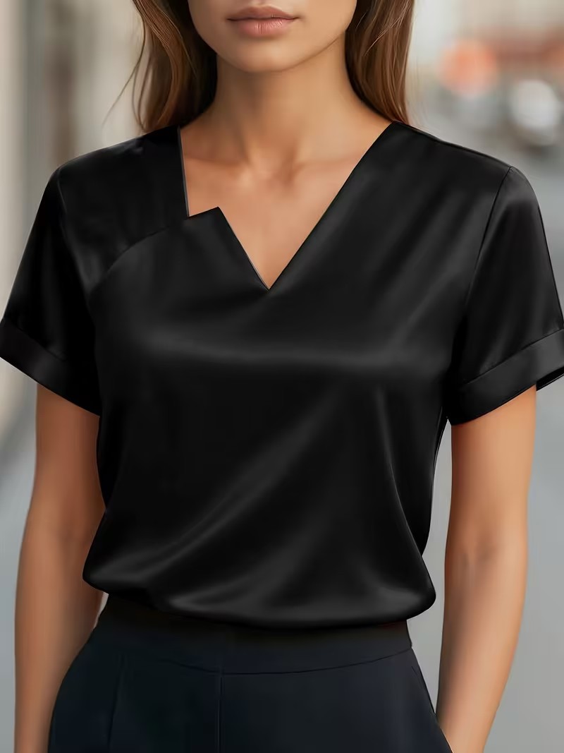 Satin Asymmetric V-Neck Short-Sleeve Shirt For Women is designed for style, comfort, and everyday use.