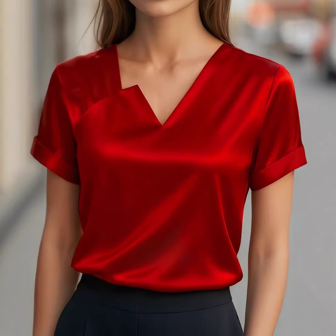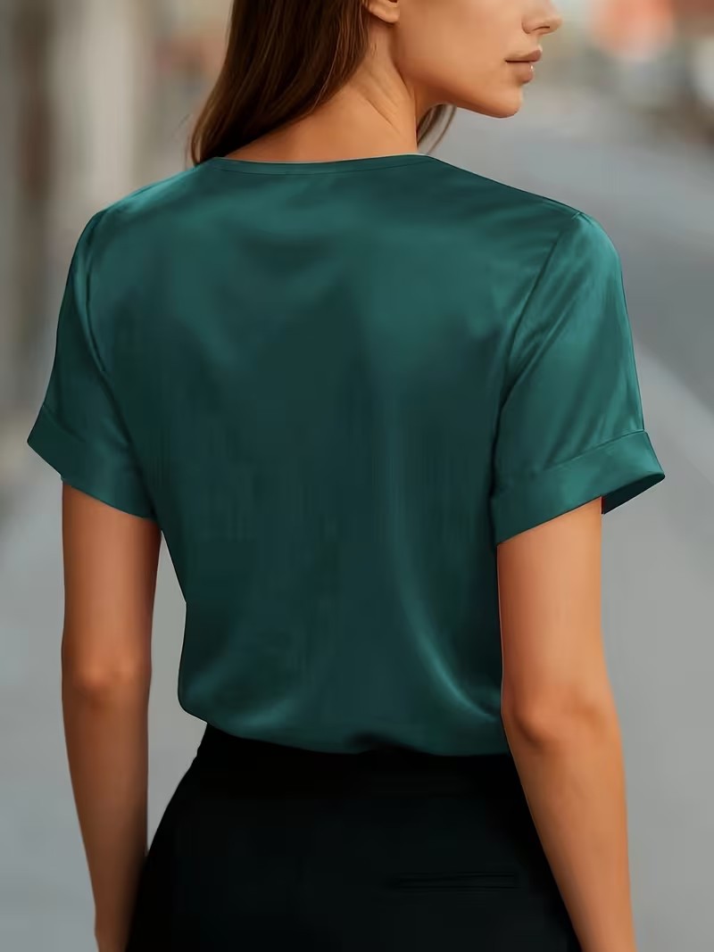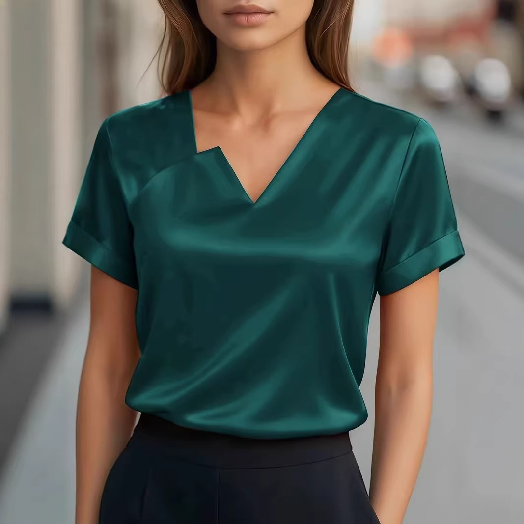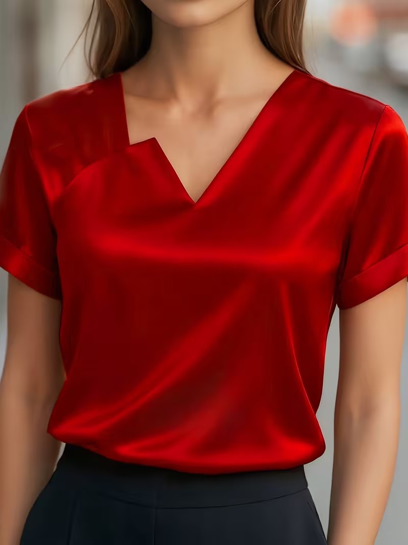 Satin Asymmetric V-Neck Short-Sleeve Shirt For Women is designed for style, comfort, and everyday use.