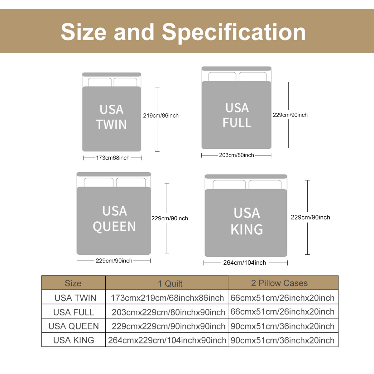 • Queen Size Set – Quilt: 90” W x90” L & 2 PC King Shams – 20” x 36”