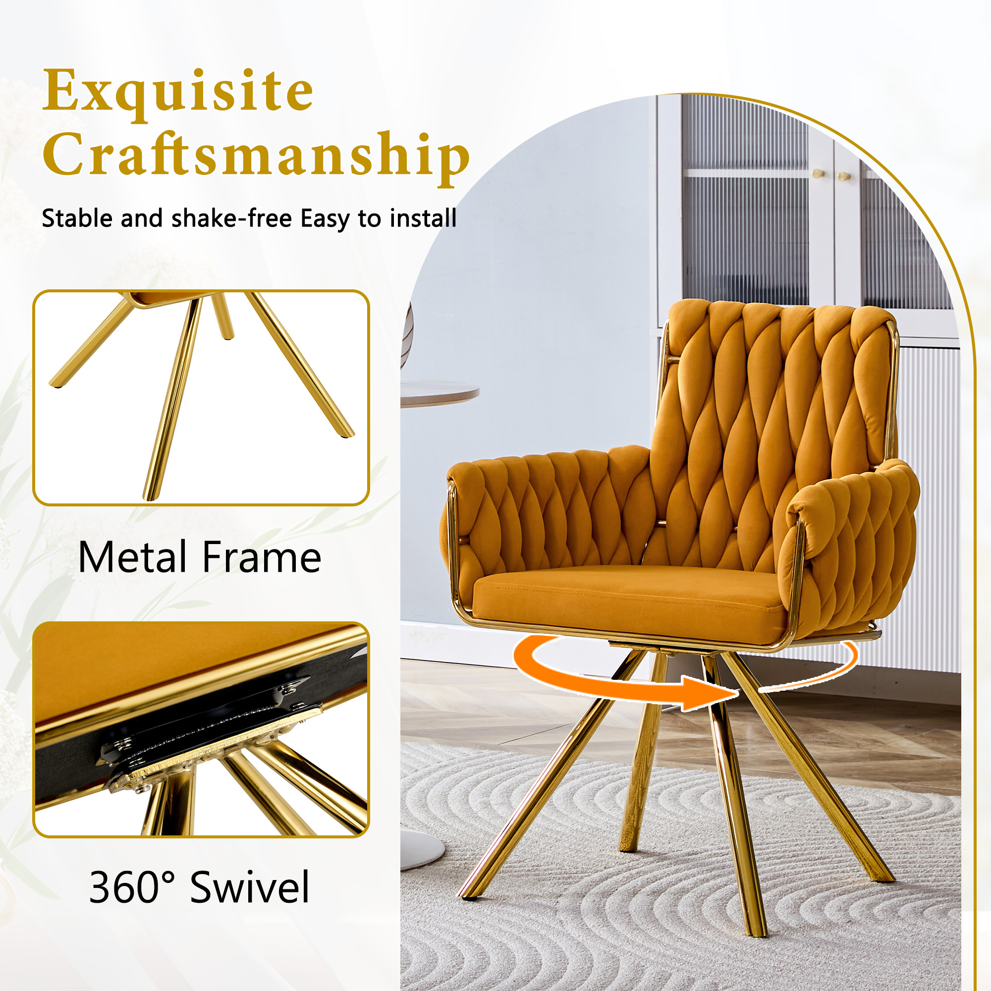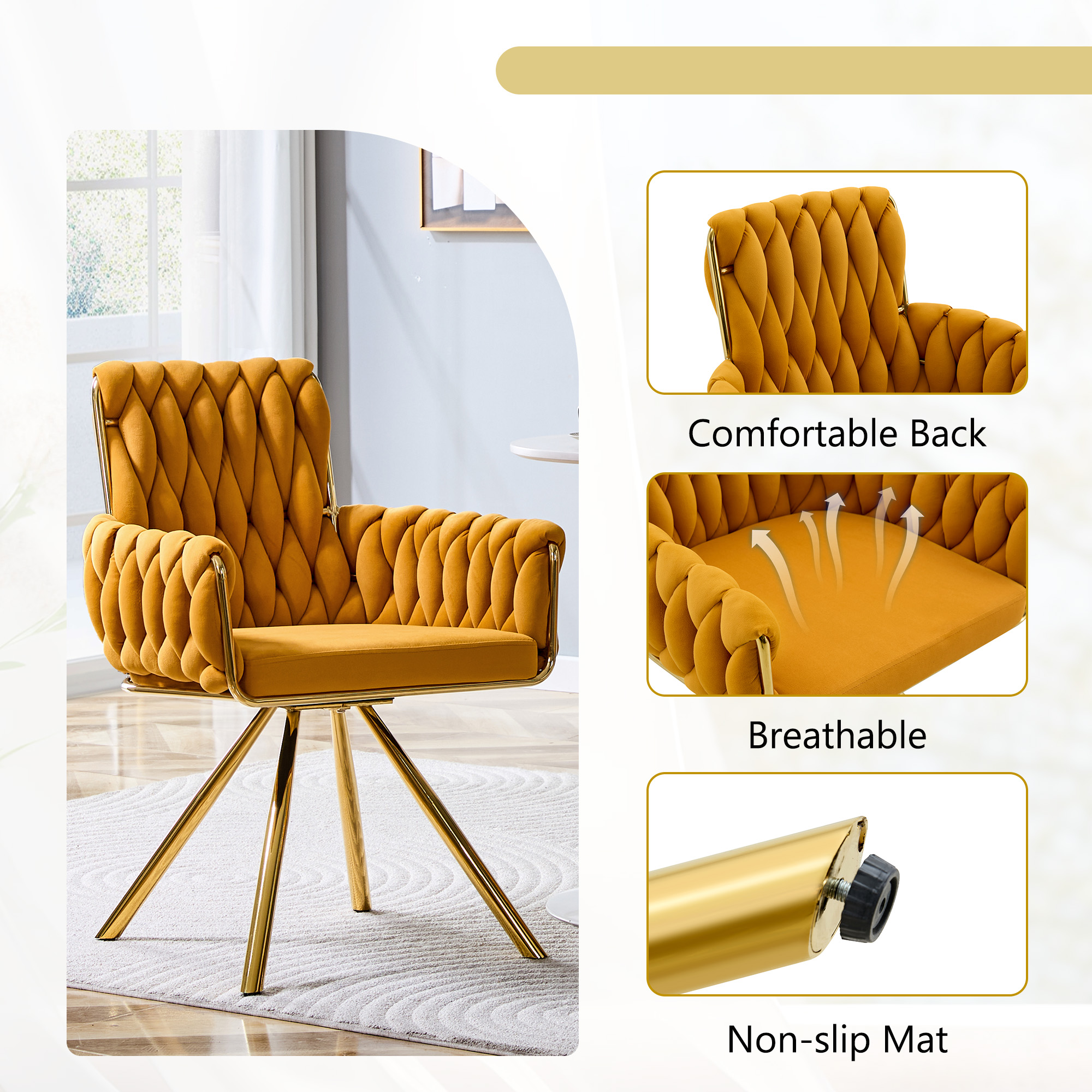 Set Of 2 Modern Luxury Velvet Braided Accent Dining Chair With Gold Metal Legs, Upholstered Armchair With Woven Rope Backrest For Dining Room, Living Room Or Bedroom-Yellow is designed for style, comfort, and everyday use.