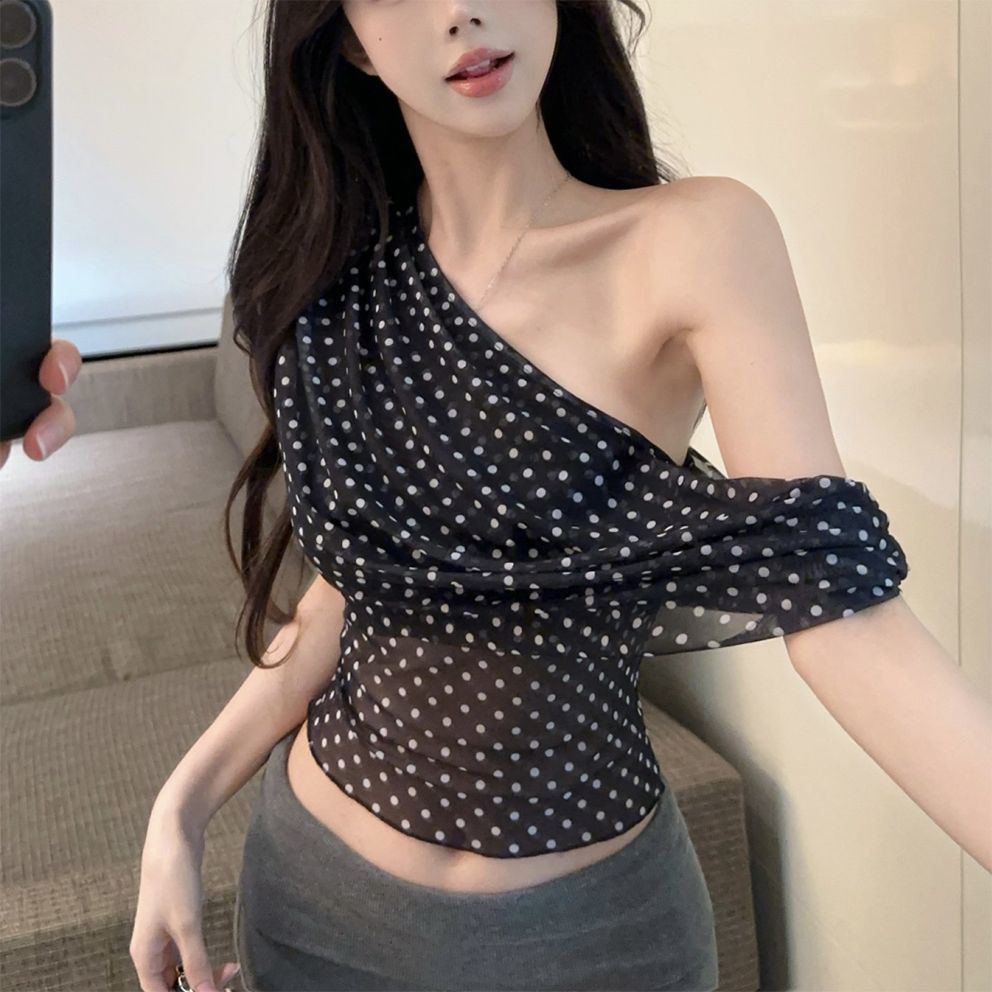 Sexy Retro Pure Desire Wave Print Mesh Short-Sleeve Top