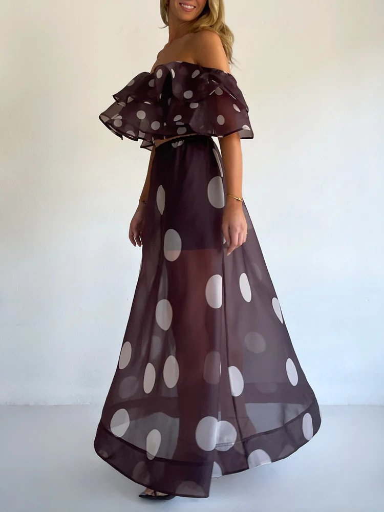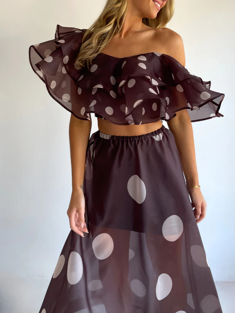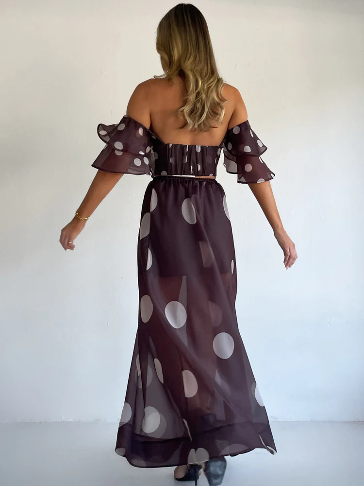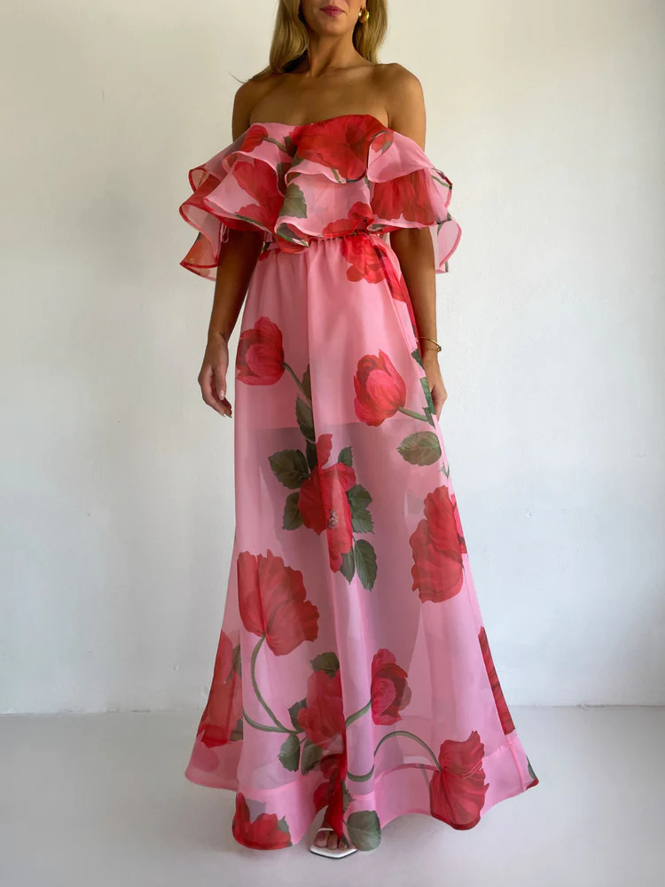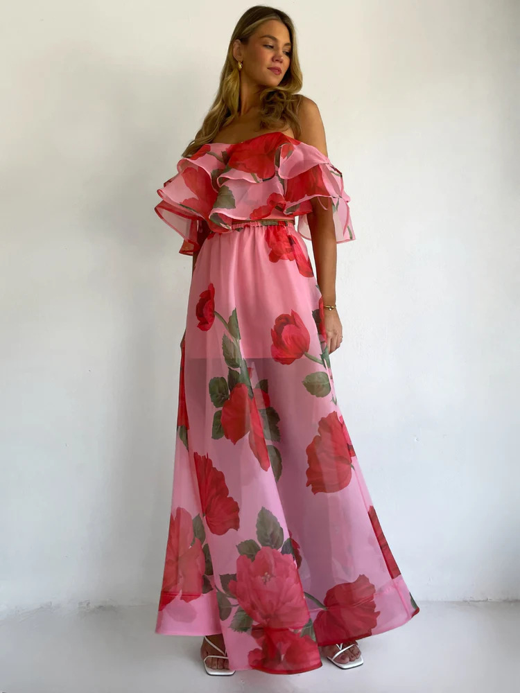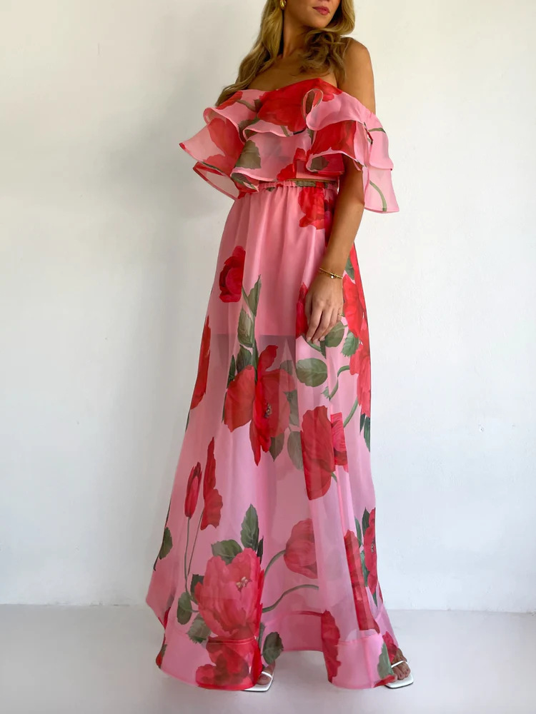 Sexy Strapless Irregular Print Ruffled Fashion Suit Long Dress