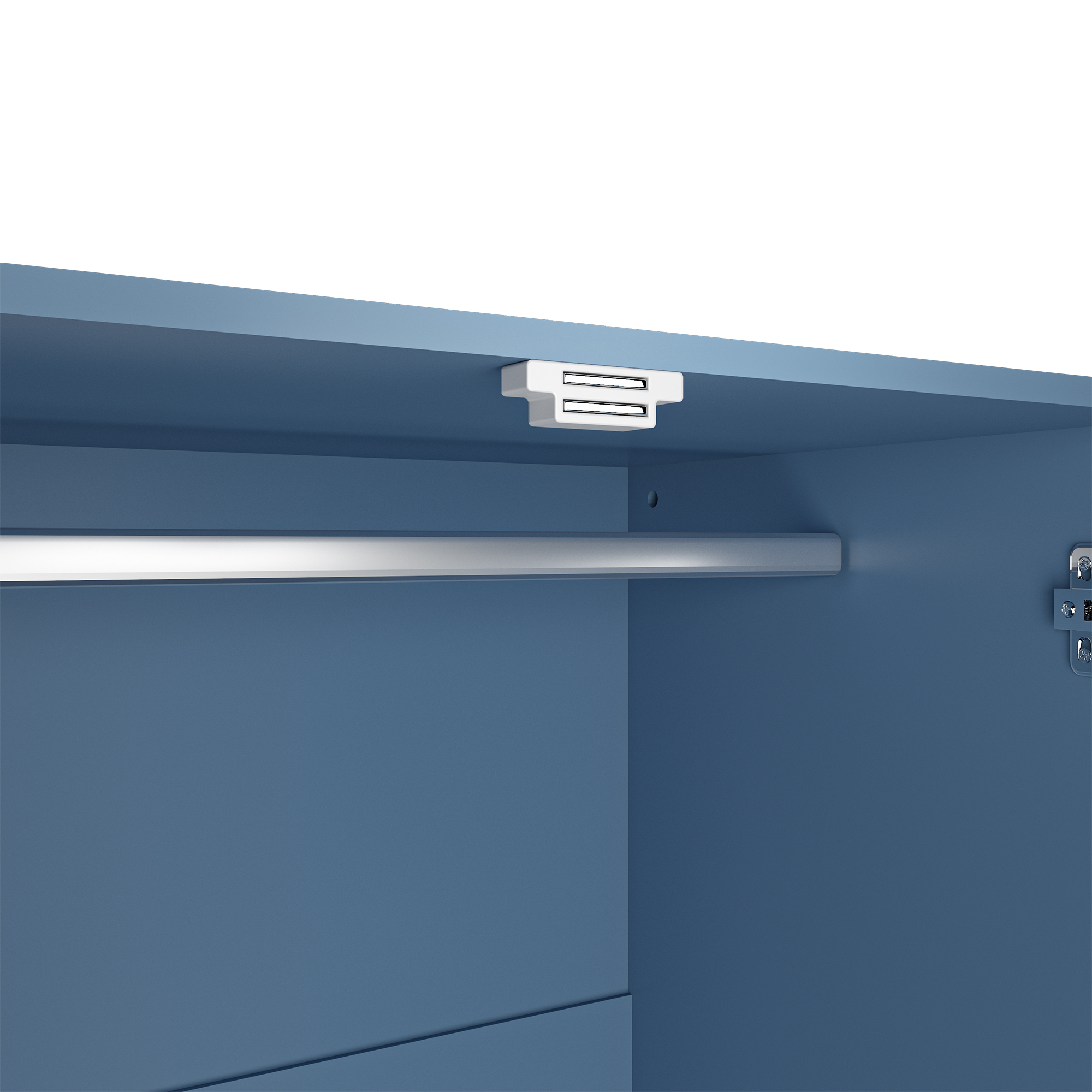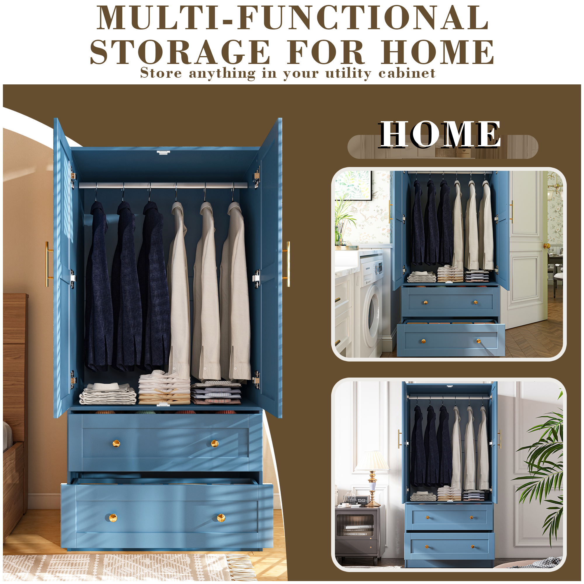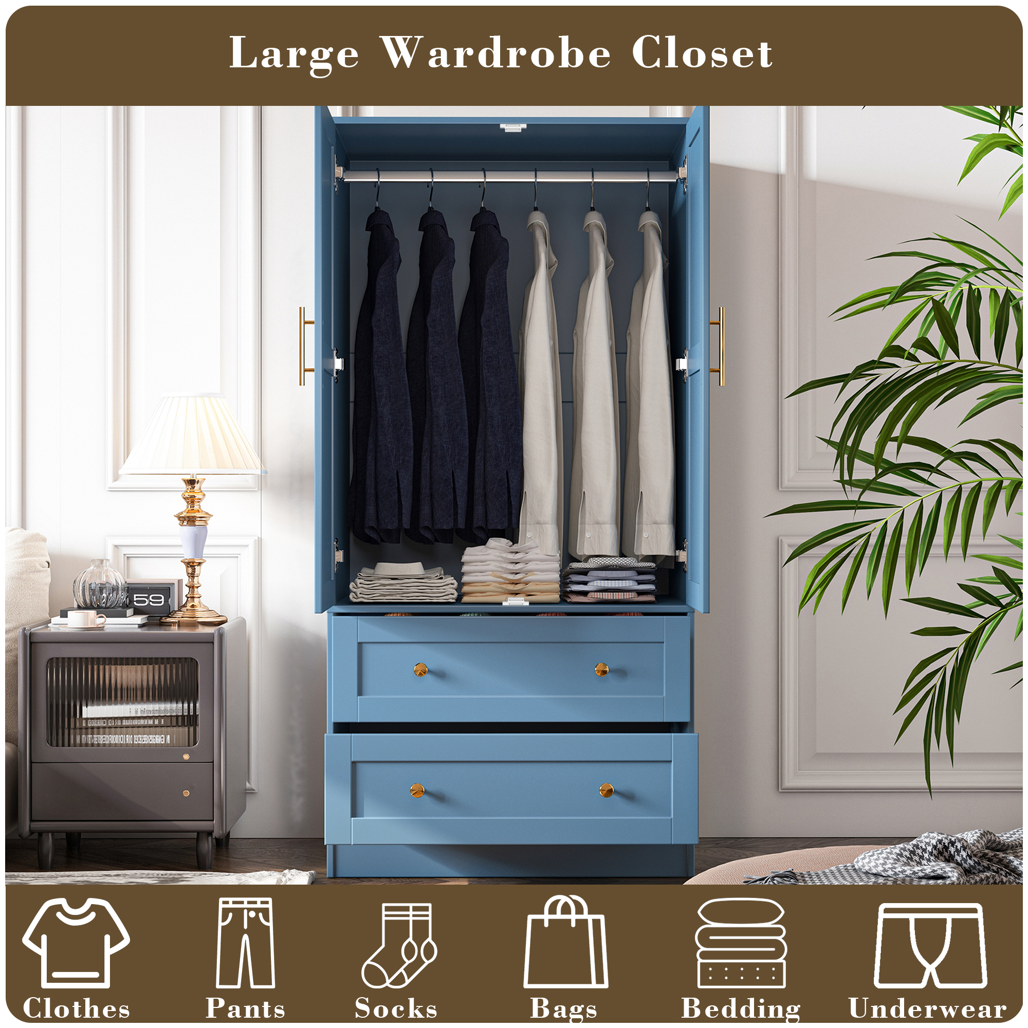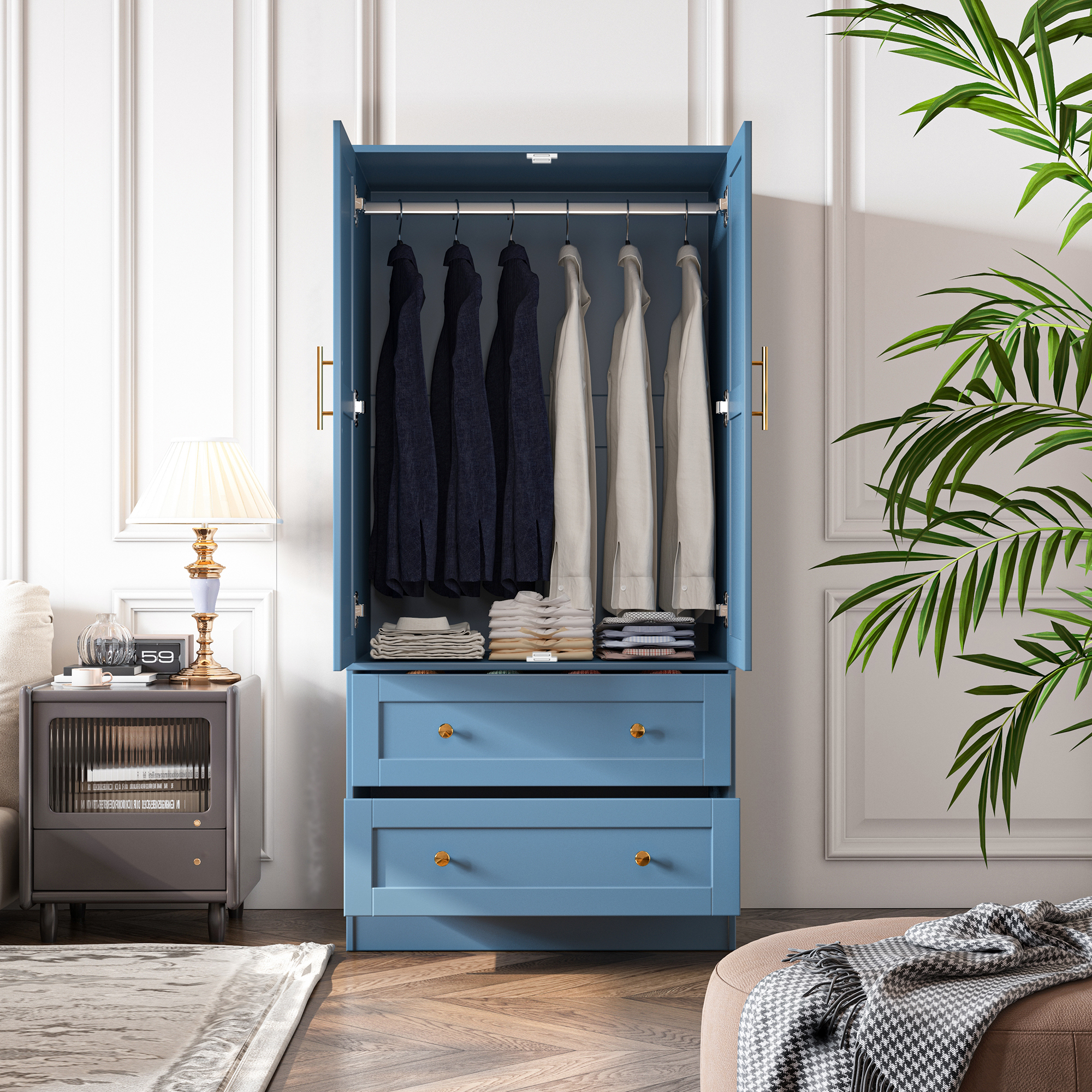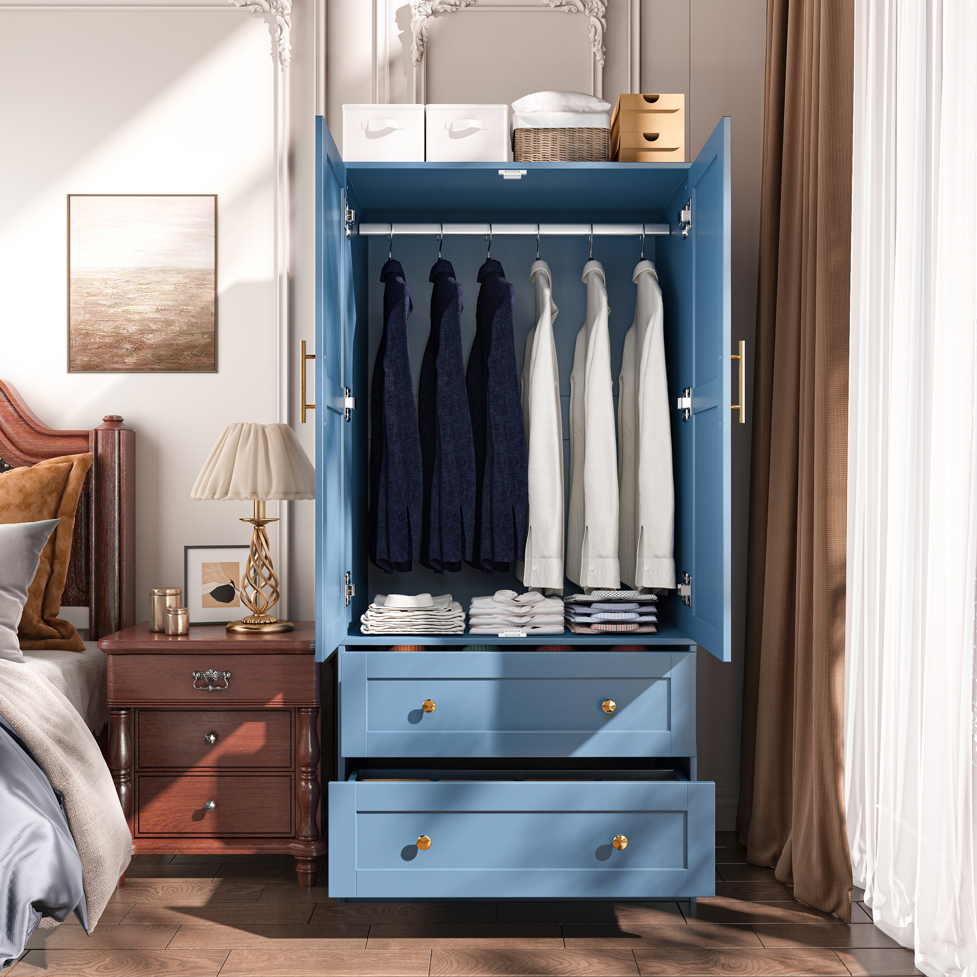 Single Box ProductProduct Name:Shaker Style Classic Two-Door Wardrobe, Solid Wood Bedroom Armoire with Hanging Rod and Shelves, Spacious Storage Closet, Modern Farmhouse DesignMain Color:BlueMain Material:MDFProduct DimensionsAssembled Length (in.):31.49Assembled Width (in.):21.65Assembled Height (in.):64.96Product Weight (lbs.):124.87Package SizeLength (in.):46.00Width (in.):26.00Height (in.):9.00Weight (lbs.):127.87