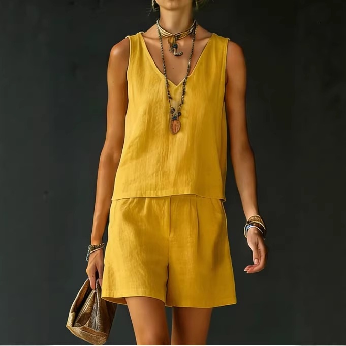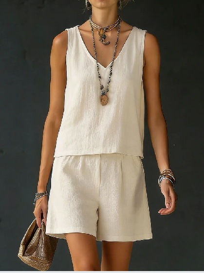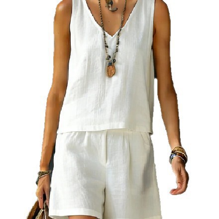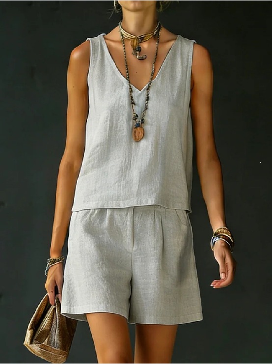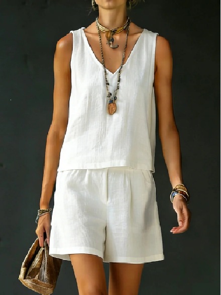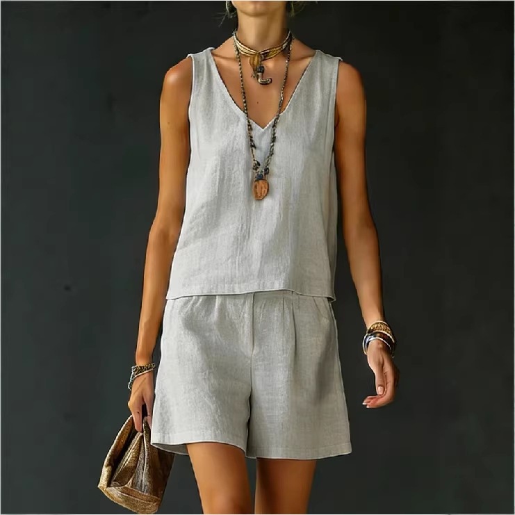 Sleeveless Linen Cotton Top Vest And Shorts Womens Solid Color Two-Piece Set is designed for style, comfort, and everyday use.