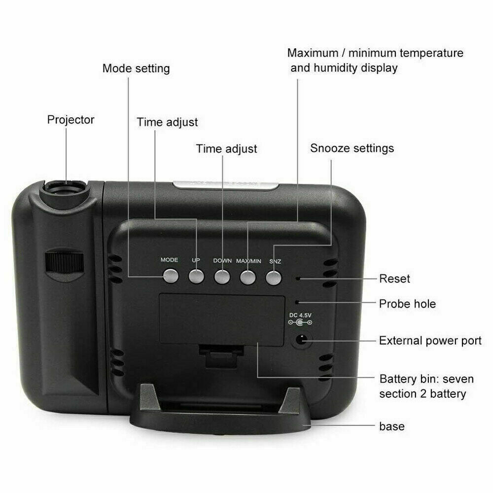 Smart Alarm Clock Digital LED Projector Temperature Time Projection LCD Display • 1. Time projection function, projection distance of about 1~5m, projection can rotate angle 180° • 3.led Backlight