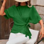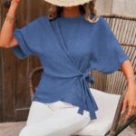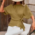 Solid-color Short-sleeve Womens Relaxed-fit Round-neck Casual Twist-detail Top