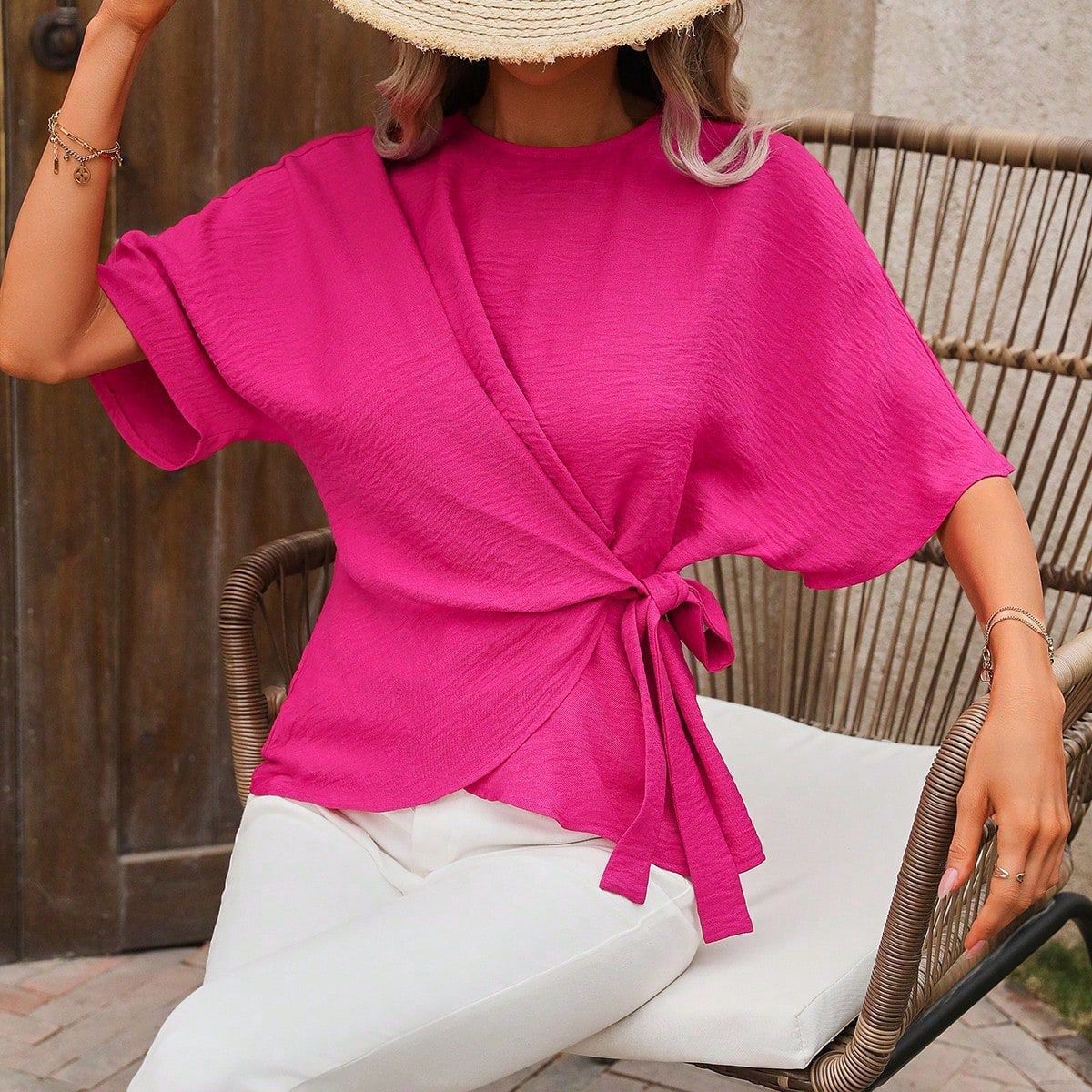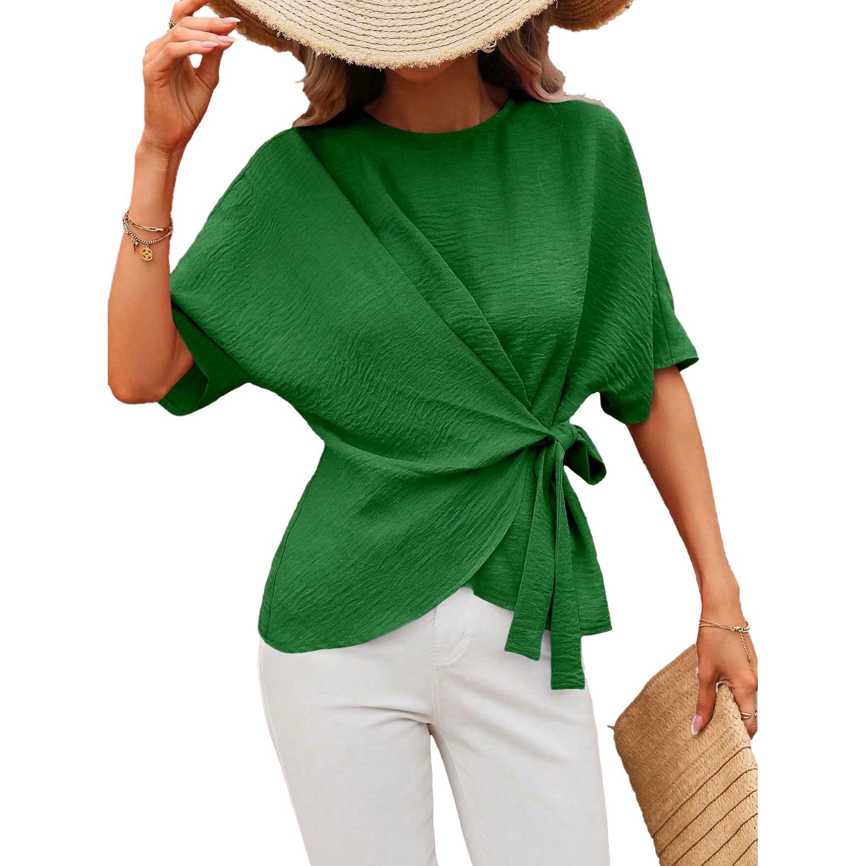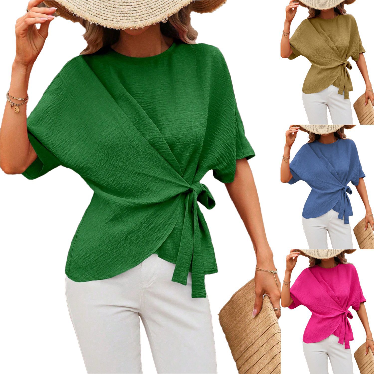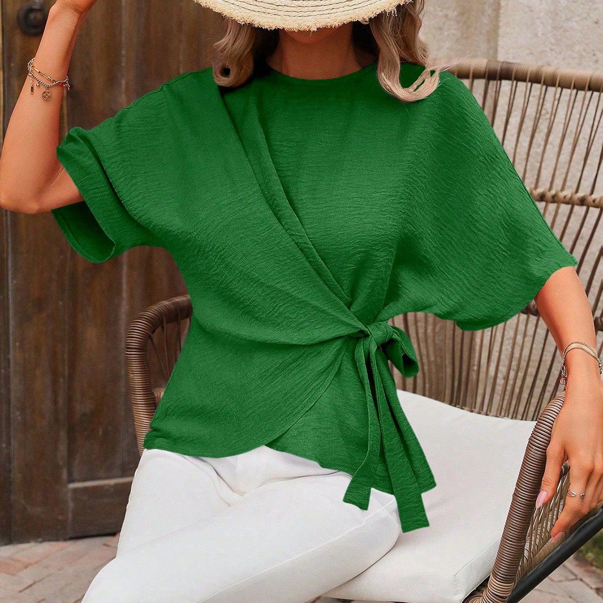Solid-color Short-sleeve Womens Relaxed-fit Round-neck Casual Twist-detail Top