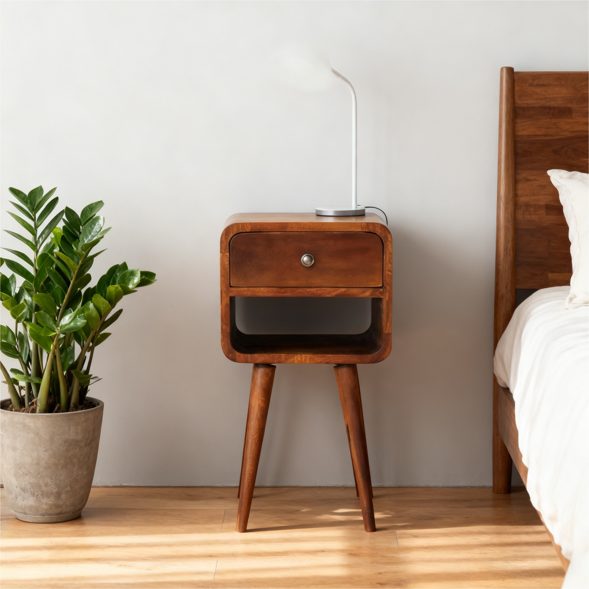 Solid Wood Mini Chestnut Curve Lower Bedside, 1 Drawer And Open Slot, Dark Brown