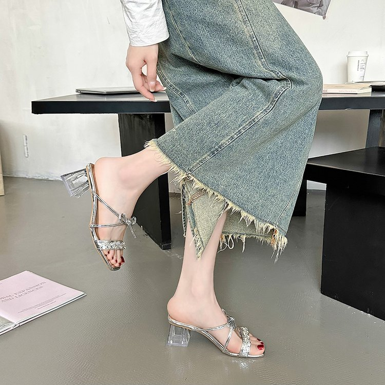 Square Bow Water Diamond Sandals With Exquisite Fairy Style French Temperament, Cool Slippers
