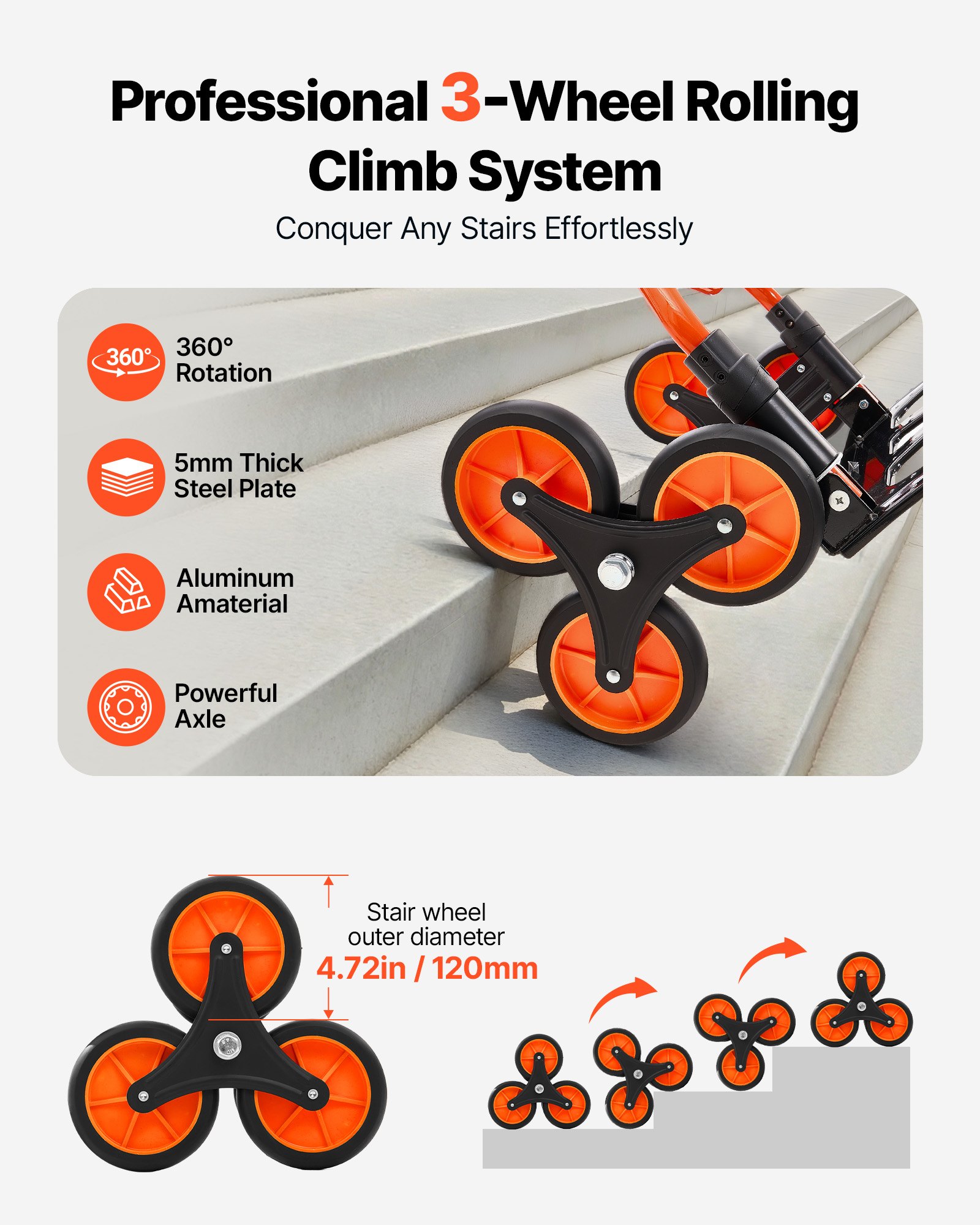 Stair Climbing Cart, 120 Lbs Stair-Climbing Capacity, Portable Folding Trolley Cart With Telescoping Handle, 6 Wheels And 2 Bungee Cords, Stair Climber Dolly For Home, Groceries, Warehouse