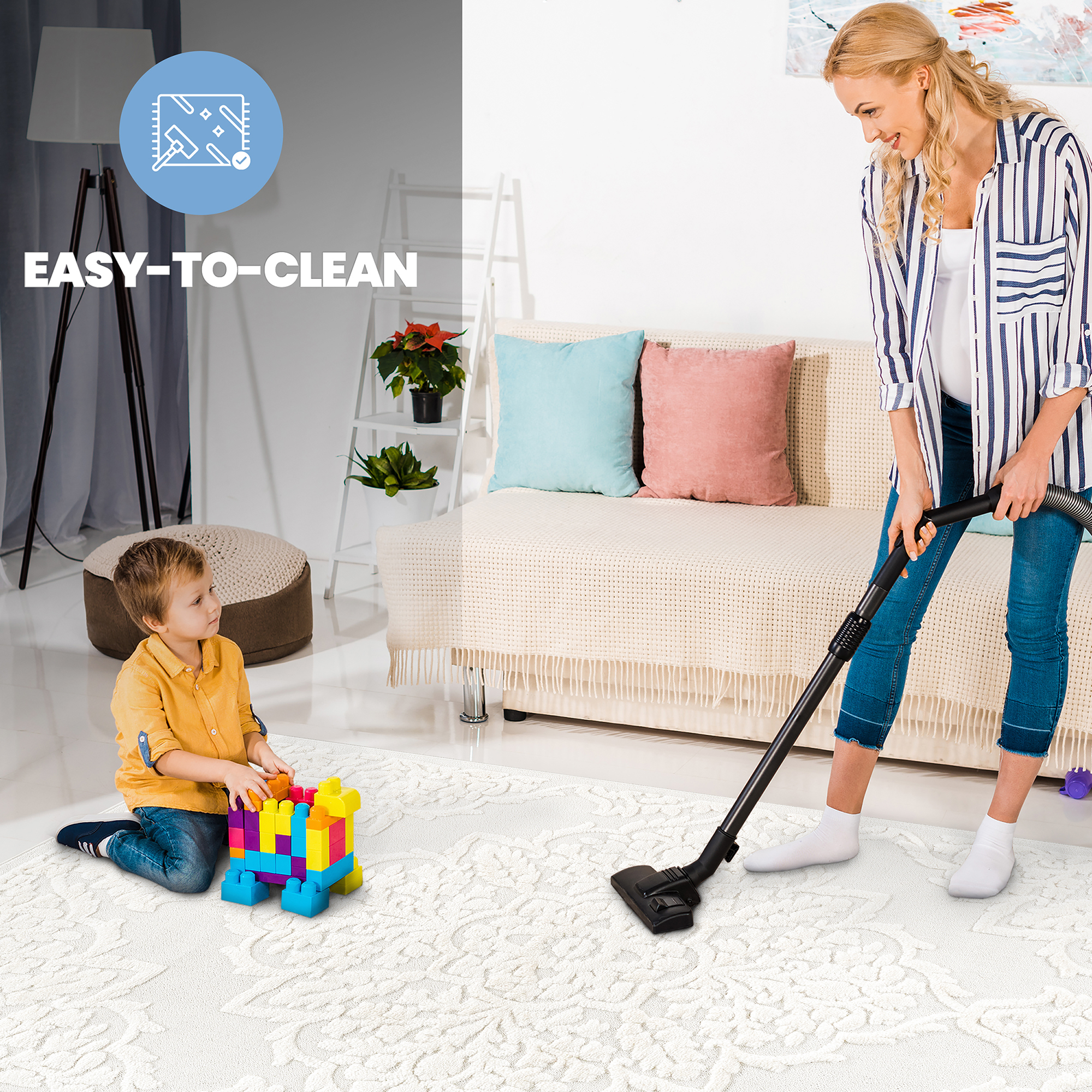 - SpecificationProduct Information UPC:810109226894Product Type :Single Box ProductProduct Name:Step Collection High-Low Medallion Cream/Cream Indoor Area Rug, 7’9”x10′, Modern, Contemporary, Geometric, Bohemian, Bedroom, Kitchen, Living Room, Non Shedding CarpetPlace of Origin:TurkeyMain Color:CreamMain Material:PolypropyleneFiller:PolypropyleneProduct DimensionsAssembled Length (in.):120.00Assembled Width (in.):93.00Assembled Height (in.):0.40Product Weight (lbs.):34.50Package SizeLength (in.):91.70Width (in.):6.50Height (in.):6.50Weight (lbs.):34.80Product FeaturesThis collection offers classic yet contemporary designs with an elevated neutral color palette. High-Low pile & Power-loomed in Turkey of polypropyleneLarge 8 x 10 Area Rug: Enhance your living space with this elegant cream rug, perfect for bedrooms or living rooms. The modern arch pattern seamlessly blends with any decor style, making it a versatile choice for home decor enthusiastsDurable and Soft: Crafted from quality fibers, this carpet offers a soft, plush feel underfoot while ensuring durabilityEasy to clean, remains a chic and stylish addition to high-traffic living rooms or bedroomsContemporary Geometric Design: Featuring a sophisticated geometric design, this luxurious area rug adds a contemporary flair to your home. Its neutral cream tones complement various color schemes, making it a perfect fit for any living room or dining areaStain and Fade Resistant: Ideal for busy households, this fluffy rug is both stain and fade resistant, maintaining its vibrant appearance over time. Its non-shedding design ensures a clean and fresh look, perfect for any modern living spacePet and Kid Friendly: Designed with families in mind, this area rug is pet and kid friendly, offering a safe and comfortable space for all. Its odor-free and breathable construction ensures a healthy environment in your living or dining roomEasy Maintenance and Durable: Stress-free cleaning includes regular vacuuming (without a beater bar) and gently blotting out minor stains with a mild detergent or carpet cleanerBacking Material: Jute backing, Latex free