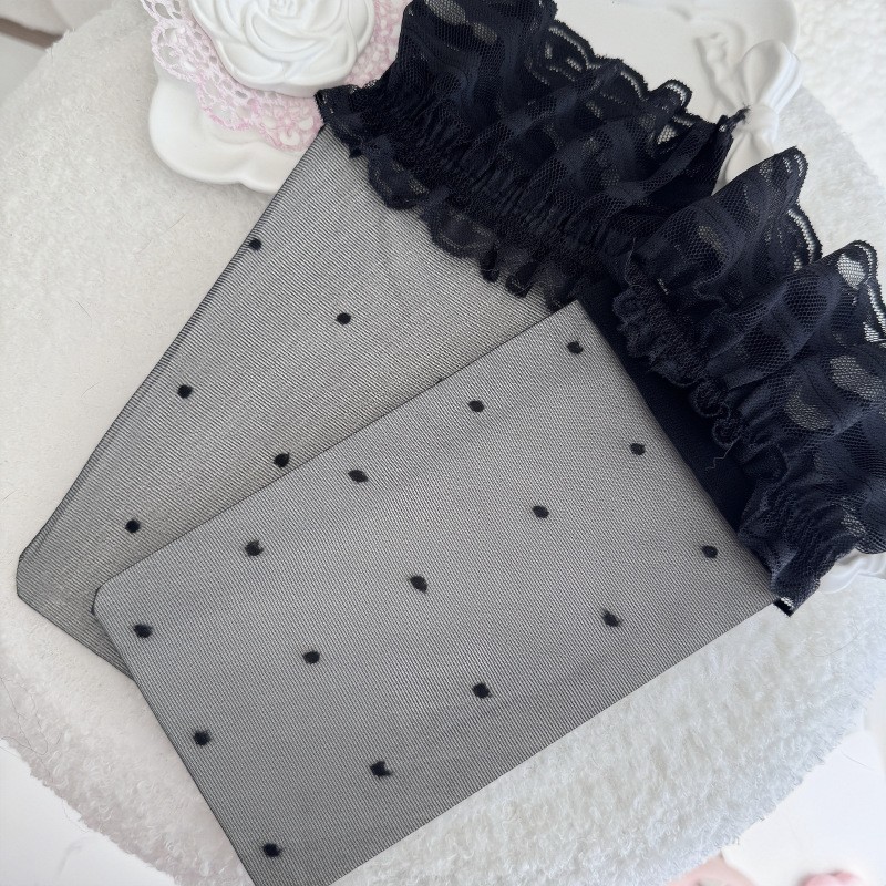Summer Ultra-Thin Sheer Thigh High Stockings For Women, Lolita Cute Polka Dot Over-the-Knee Socks With Lace Trim